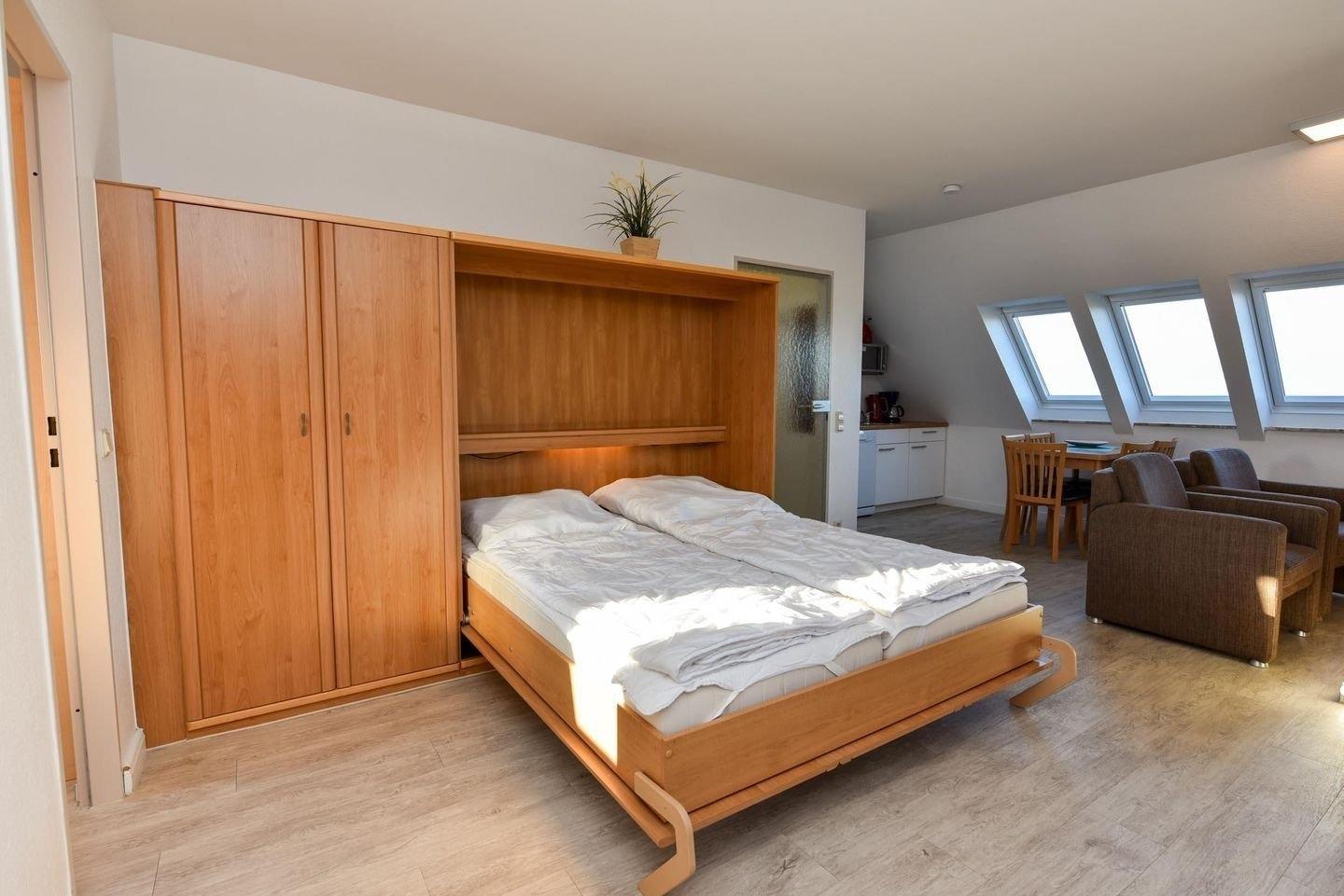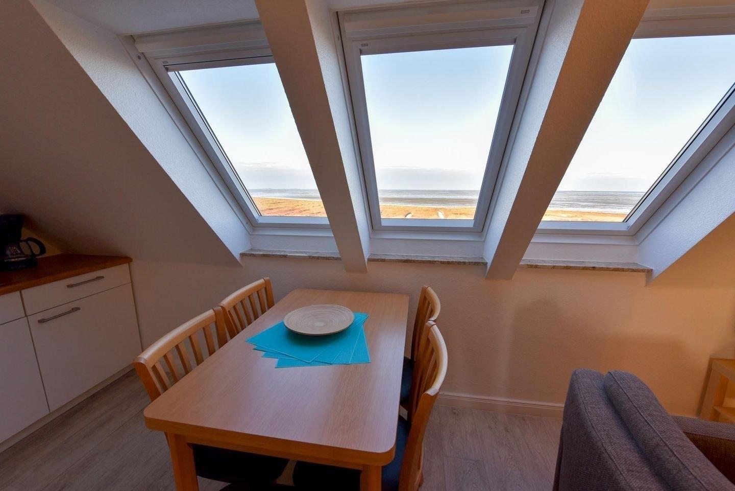 3-Zimmer Appartement im Haus "Nige Wark". In der TV-/Leseecke im Wohnzimmer befindet sich ein gemütliches Zweisitzer-Sofa, drei Sessel und ein Flat- TV. Die integrierte Küchenzeile mit Spülmaschine, Mikrowelle und Kühlschrank mit Gefrierfach ist komplett ausgestattet und der ausziehbare Esstisch, von welchem aus Sie einen herrlichen Blick auf das UNESCO-Weltnaturerbe Wattenmeer, die Insel Neuwerk und den Weltschifffahrtsweg haben, bietet genügend Platz für alle. Im Wohn-/Schlafraum befindet sich zusätzlich noch ein ein Schrankbett (2x90x200). In den 2 Schlaf-/Kinderzimmern stehen jeweils 2 Einzelbetten (90x200). Das Badezimmer ist mit einer Dusche und WC ausgestattet. Die ca. 50 qm große Wohnung liegt im 2. OG.