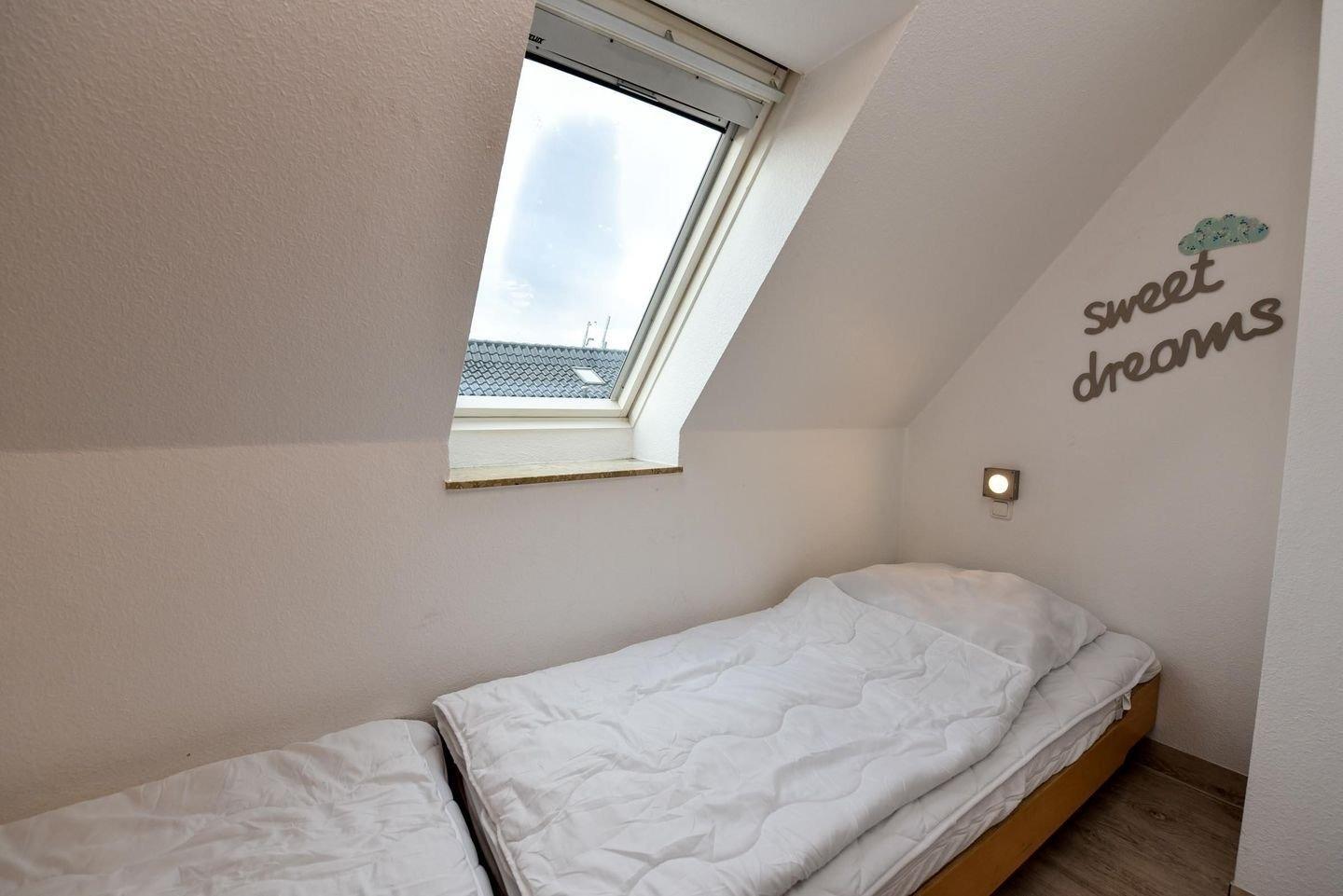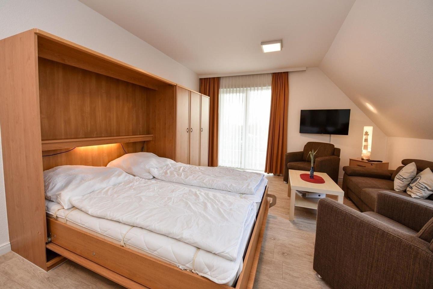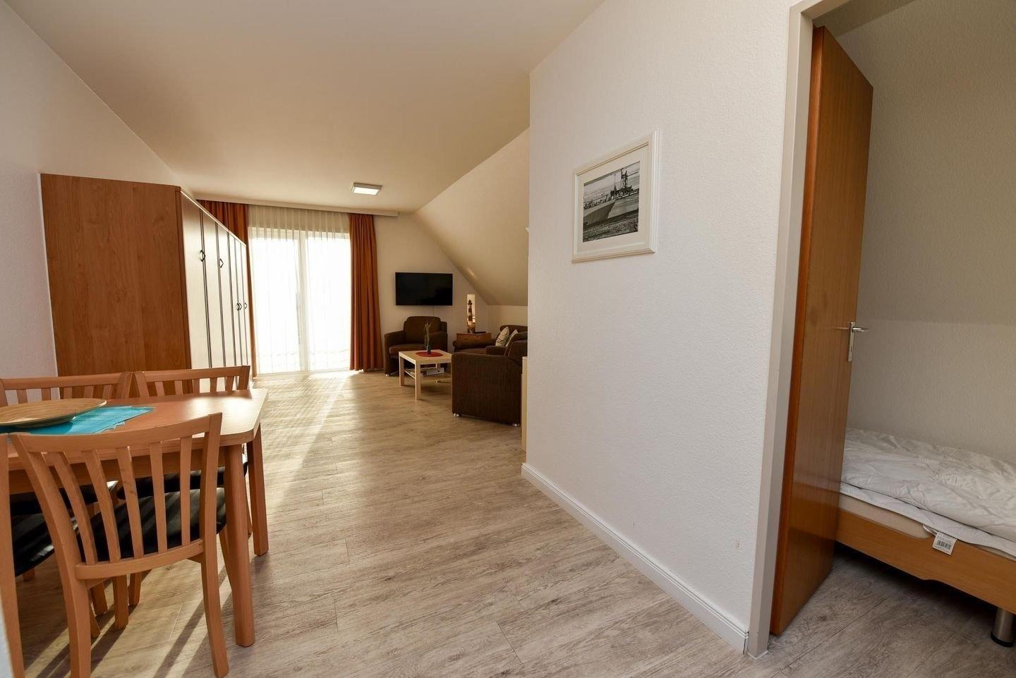 2-Zimmer Appartement im Haus "Nige Wark". In der TV-/Leseecke im Wohnzimmer befindet sich ein gemütliches Zweisitzer-Sofa, zwei Sessel und ein Flat- TV. Die integrierte Küchenzeile mit Spülmaschine, Mikrowelle und Kühlschrank mit Gefrierfach ist komplett ausgestattet und der ausziehbare Esstisch bietet genügend Platz für alle. Im Wohn-/Schlafraum befindet sich zusätzlich noch ein ein Schrankbett (2x90x200). Im Schlaf-/Kinderzimmer stehen zwei Einzelbetten (90x200). Das Badezimmer ist mit einer Dusche und WC ausgestattet. Die ca. 41 qm große Wohnung liegt im 2. OG und verfügt zudem auch über einen Balkon zum Garten