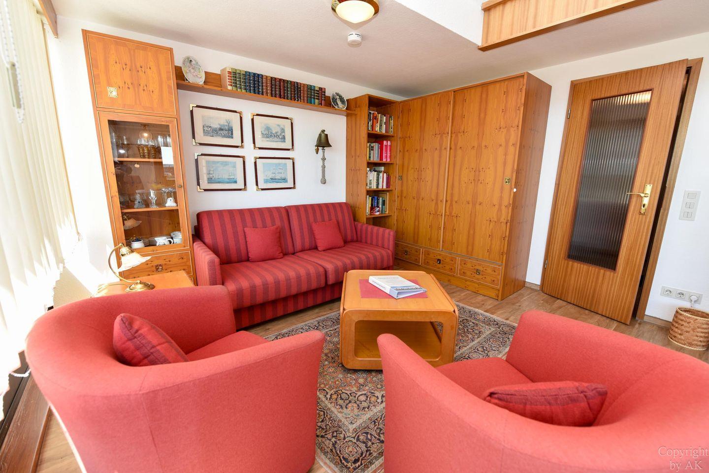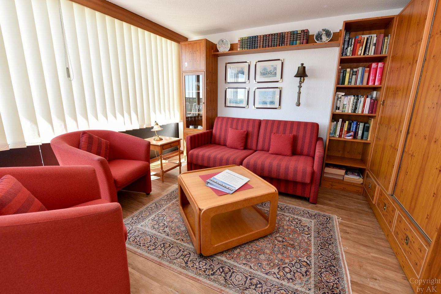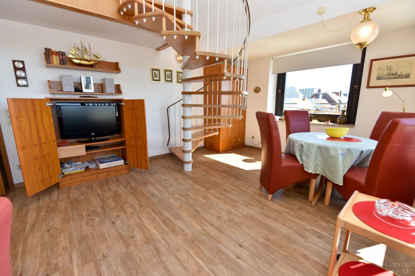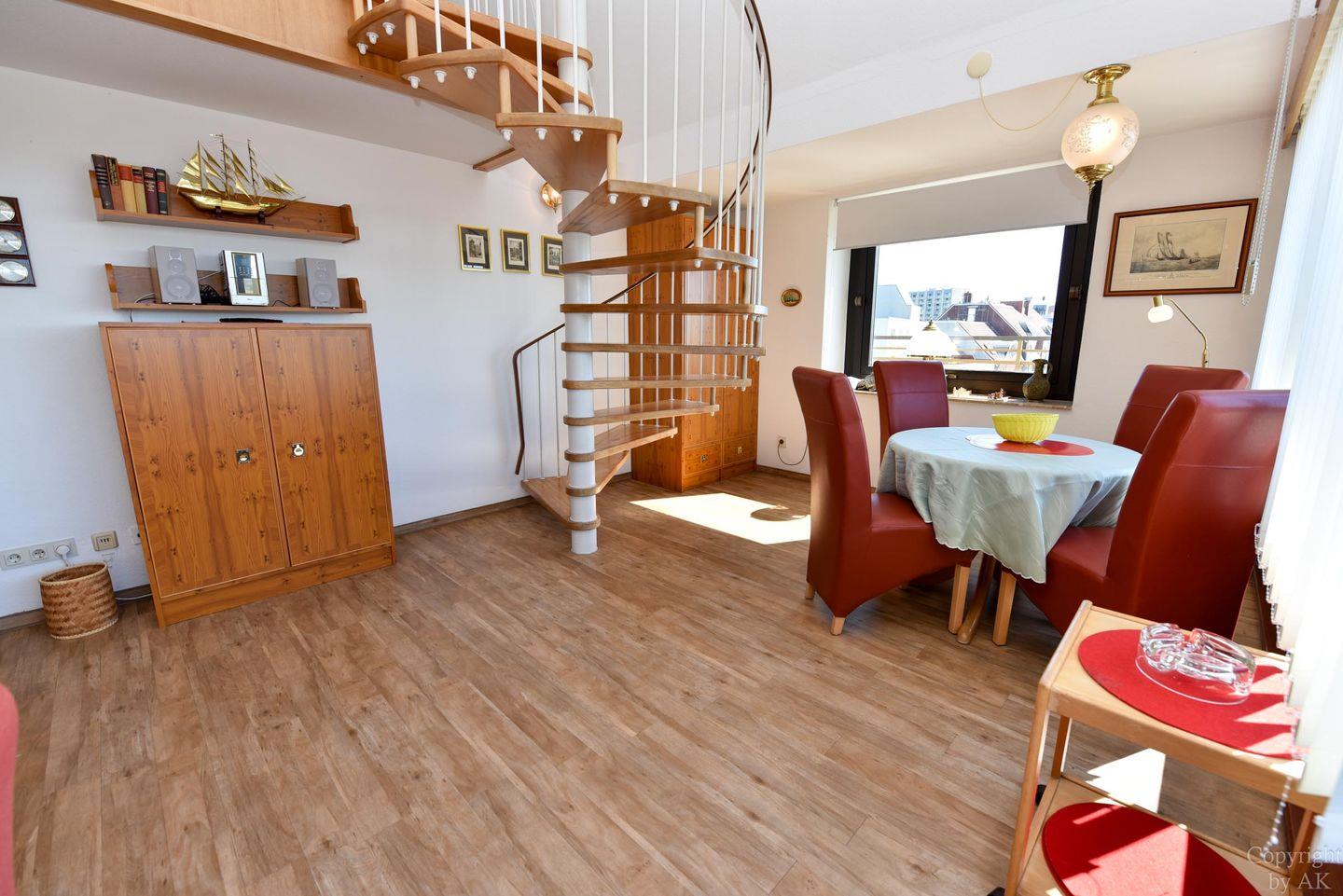 2 Zimmer Appartement im 5. OG mit Seeblick von der Dachterrasse auf den Weltschifffahrtswegmit Seeblick von der Dachterrasse auf den Weltschifffahrtsweg. Der Wohn-/ Schlafbereich ist mit einem Schlafsofa, zwei dazu passenden Sesseln und einem Tisch für 4 ausgestattet. Im Schlafraum, welcher auf der Empore liegt, befindet sich ein Ehebett. Die gemütlich kuschelige Empore hat eine Kopfhöhe von 165cm - 175cm. In der komfortabel ausgestatteten Küche können Sie Ihren Kochkünsten freien Lauf lassen. Das Appartement verfügt zudem über ein Dusch- und Wannenbad und hat ein separates WC. Von dem sonnigen Südbalkon haben Sie einen wunderbaren Blick auf die Nordsee.! Der zu dem Appartement gehörende Tiefgaragenstellplatz hat eine Einstellhöhe von 149cm.
