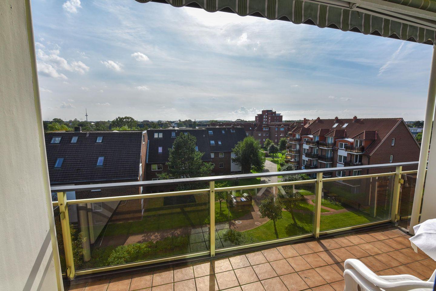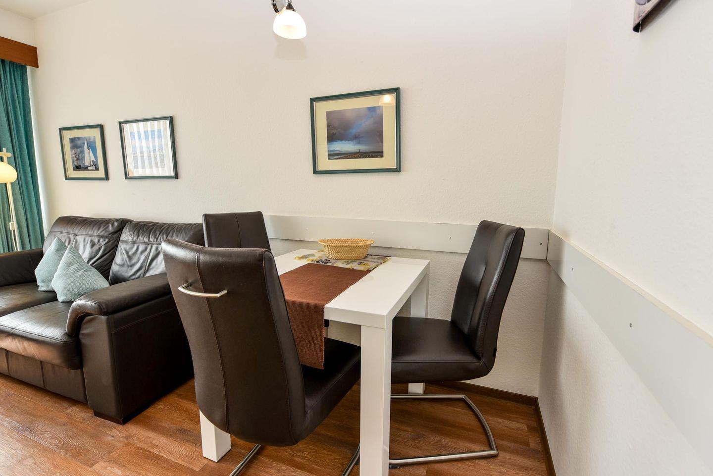 1-Zimmer Appartement mit Südbalkon im 4. OG. Der Wohnbereich dieses für 2 Personen eingerichteten Appartements ist mit einem Doppelschrankbett, einem Sofa, einem Sessel, sowie einem Esstisch mit dazugehörigen Stühle ausgestattet. Es gibt eine integrierte Küchennische in der Sie kleine Mahlzeiten zaubern können. Zu dem Appartement gehört auch ein Strandkorb (01.05.-30.09.) am nur wenige Gehminuten entfernten Sandstrand von Döse. Ein Wannenbad rundet das Angebot ab. Der kostenlose Tiefgaragenplatz hat eine Einstellhöhe von 149 cm.