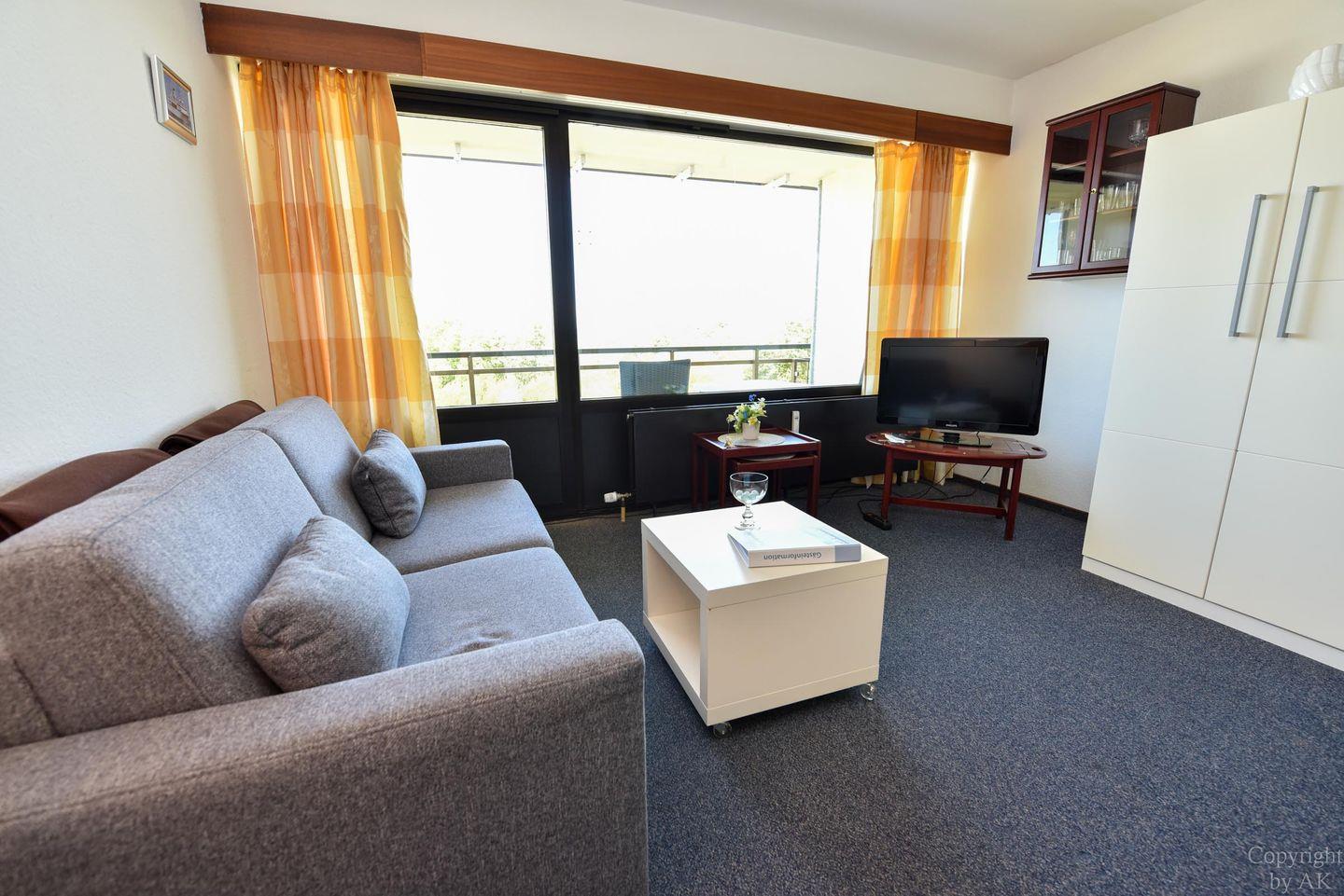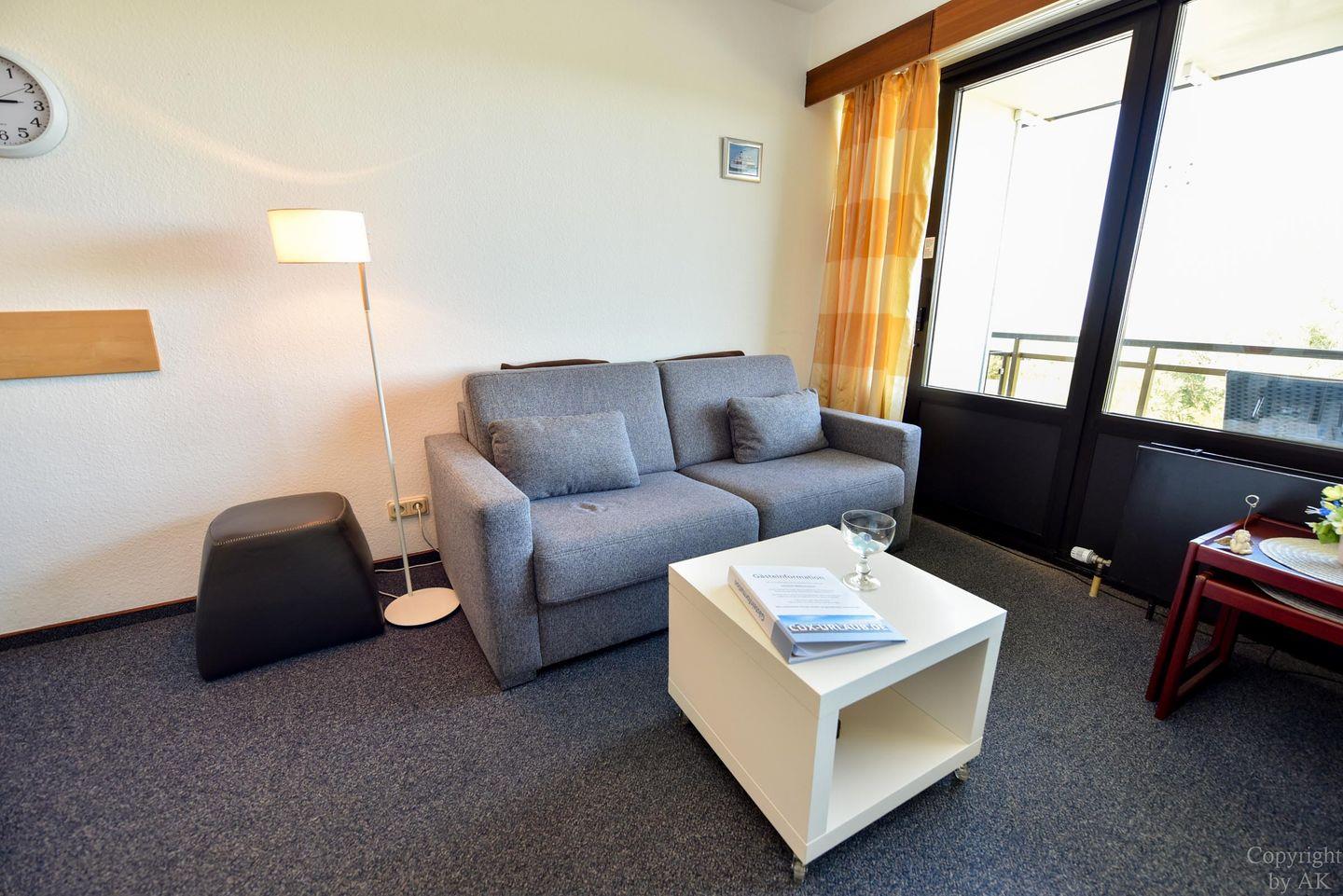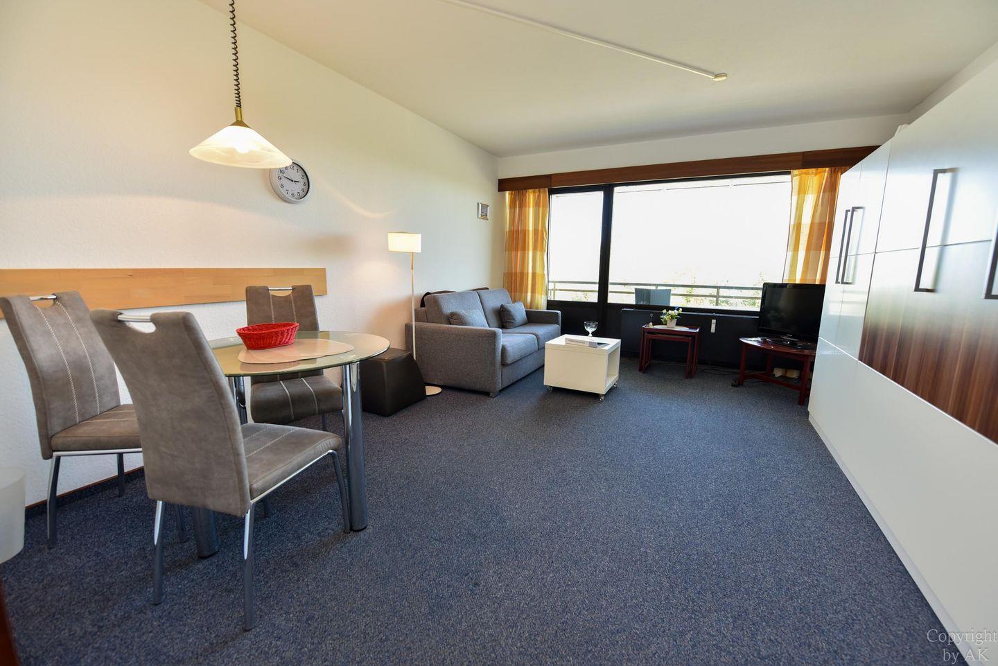 1-Zimmer Appartement im 3. OG mit großem Balkon und toller Sicht auf den Weltschifffahrtsweg. Komfortable Einrichtung für 2 bis 3 Personen. Im Wohn-/ Schlaf-/ Essbereich befindet sich u.a. ein Schrankbett, ein Schlafsofa und ein Glastisch, sowie ein Esstisch mit dazugehörigen Stühlen. Zudem verfügt das Appartement über eine separate Küchennische. Das Bad ist mit einem Wannenbad und einem WC ausgestattet. Der kostenlose Tiefgaragenstellplatz hat eine Einstellhöhe bis 195cm.
