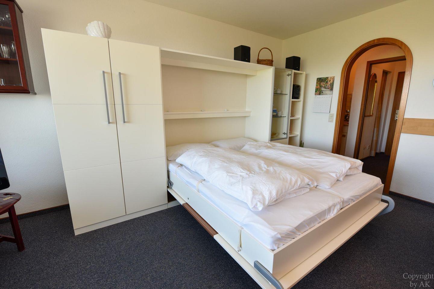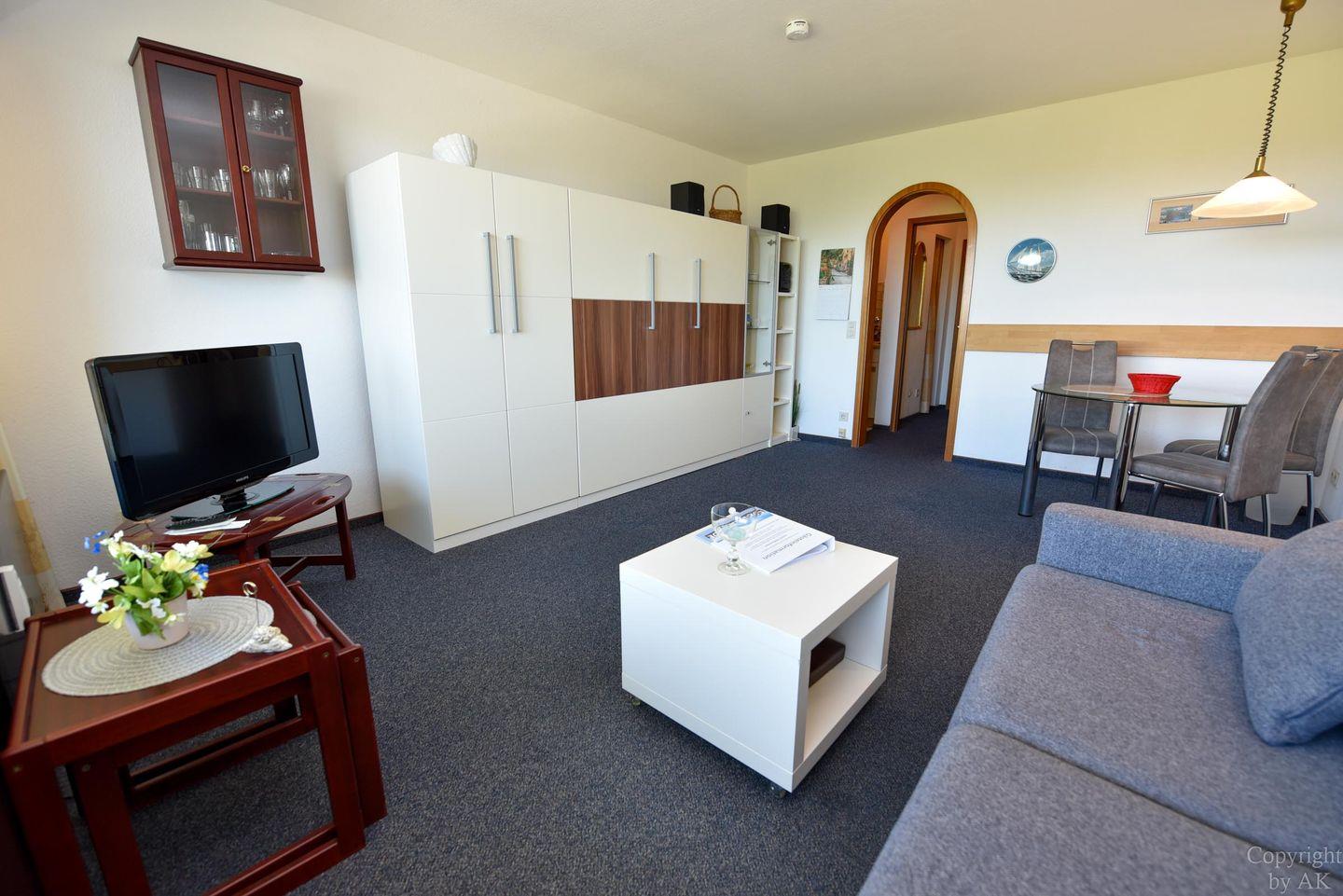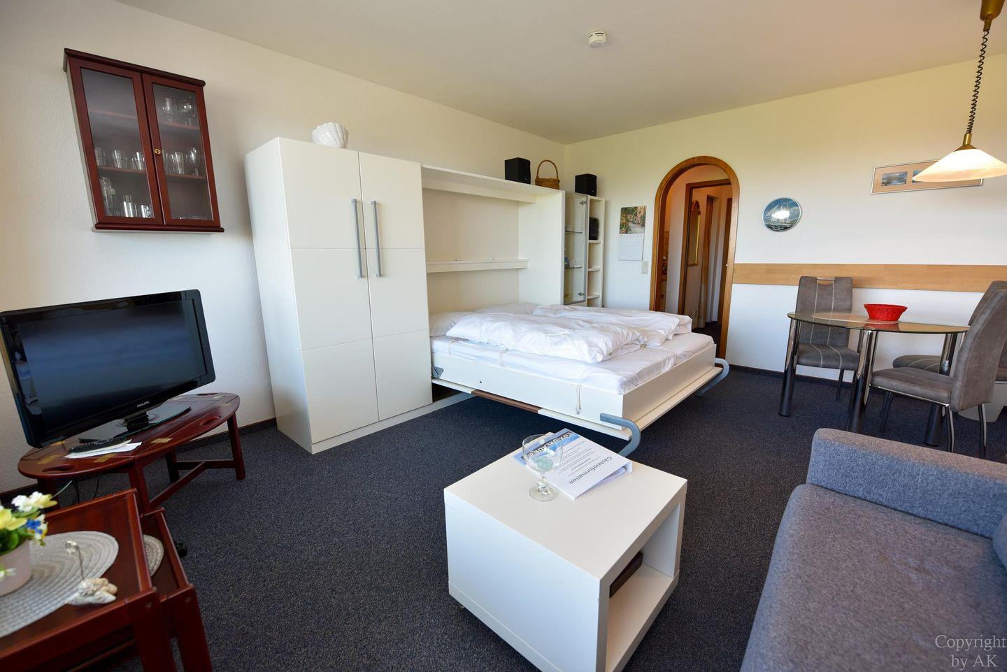 1-Zimmer Appartement im 3. OG mit großem Balkon und toller Sicht auf den Weltschifffahrtsweg. Komfortable Einrichtung für 2 bis 3 Personen. Im Wohn-/ Schlaf-/ Essbereich befindet sich u.a. ein Schrankbett, ein Schlafsofa und ein Glastisch, sowie ein Esstisch mit dazugehörigen Stühlen. Zudem verfügt das Appartement über eine separate Küchennische. Das Bad ist mit einem Wannenbad und einem WC ausgestattet. Der kostenlose Tiefgaragenstellplatz hat eine Einstellhöhe bis 195cm.