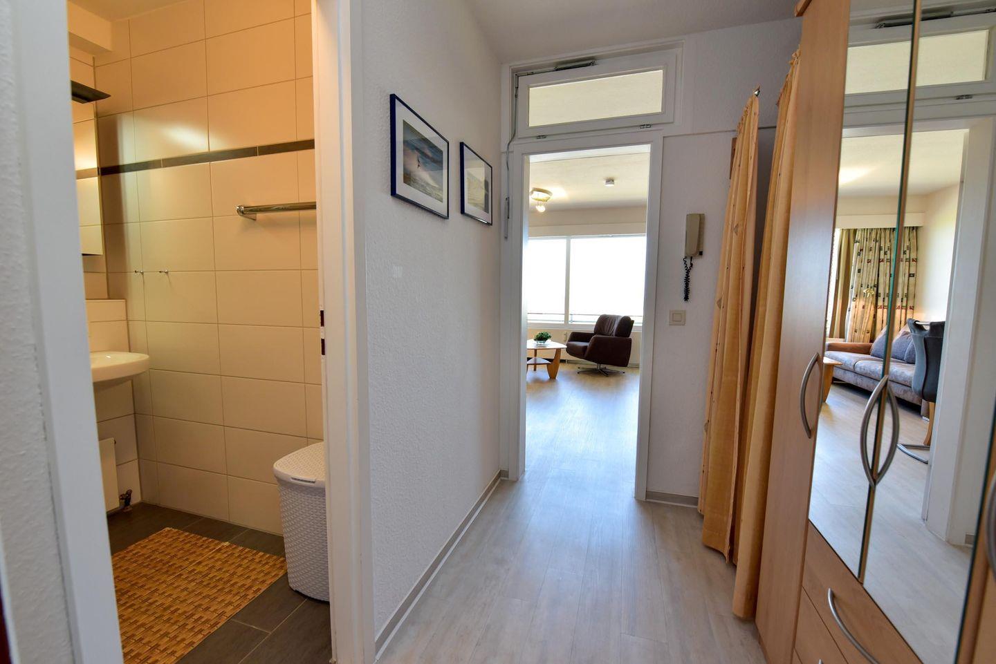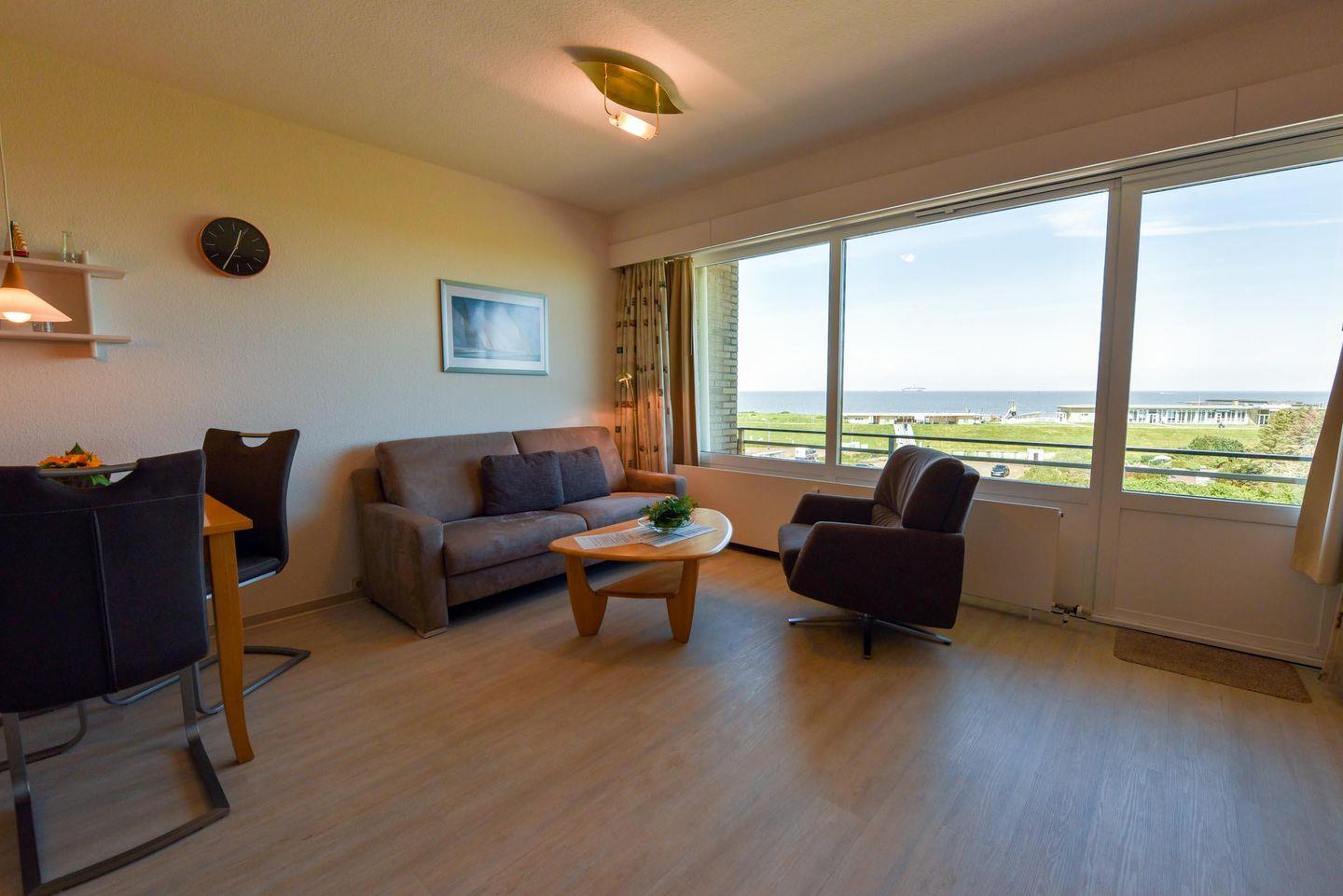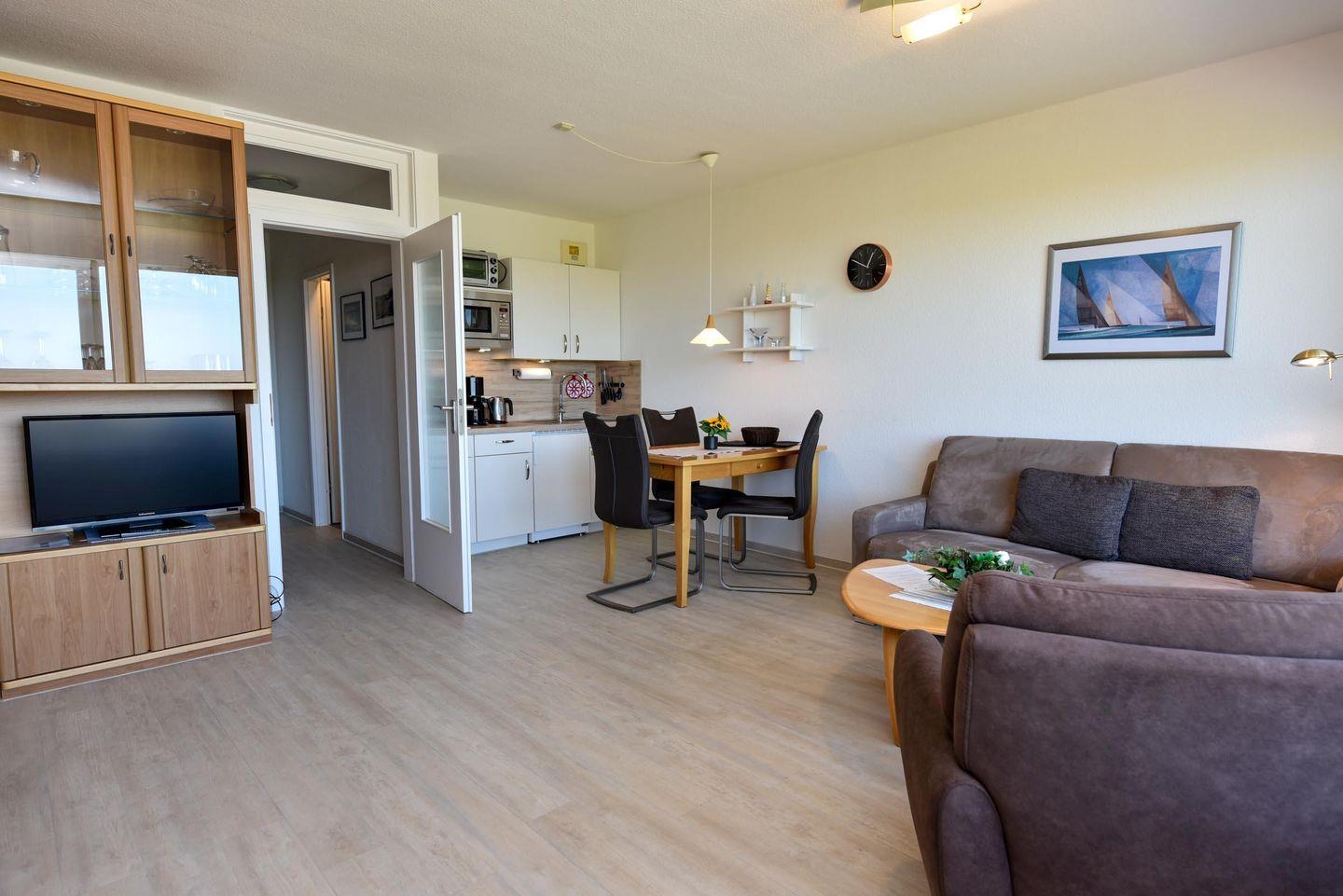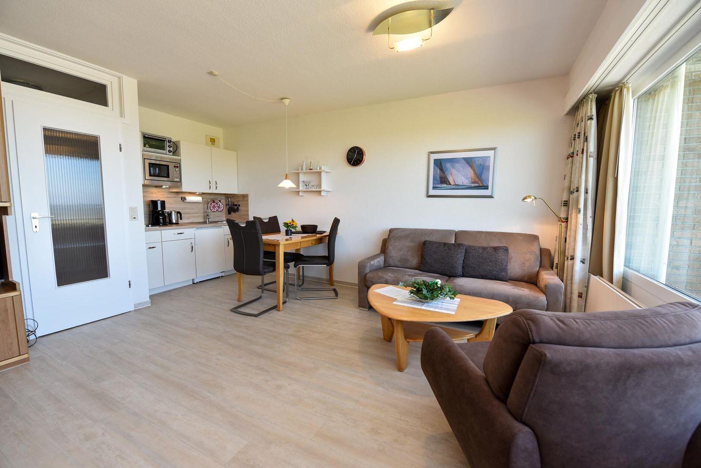 1-Zimmer Appartement für 2-3 Personen im 4. OG mit super Seesicht inklusive eigenem Strandkorb (01.05.-30.09.). Das Appartement wurde 2019 umfangreich und aufwendig renoviert. Im Wohnbereich befindet sich eine Kochnische mit Essbereich. Eine Sitzecke aus Couch, Sessel und Couchtisch lädt zum gemütlichen Verweilen ein. Als Schlafgelegenheit dient ein Doppelbett in Form eines Schrankbetts. Zusätzlich ist ein Etagenbett (90x190) abgetrennt im Flurbereich vorhanden. WC/Duschbad. Parkmöglichkeit besteht auf dem Tiefgaragenstellplatz (Einstellhöhe 149cm), oder mit einem kostenlosen Dauerparkschein ( vom 01.01. - 31.12. ) an der Nordfeldstraße, oder auf dem großen Parkplatz gegenüber.