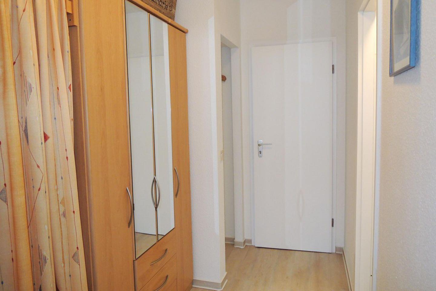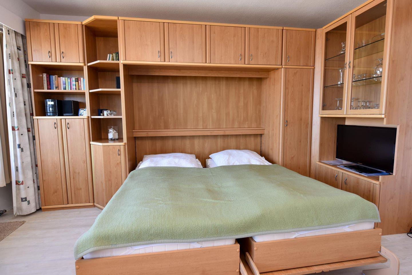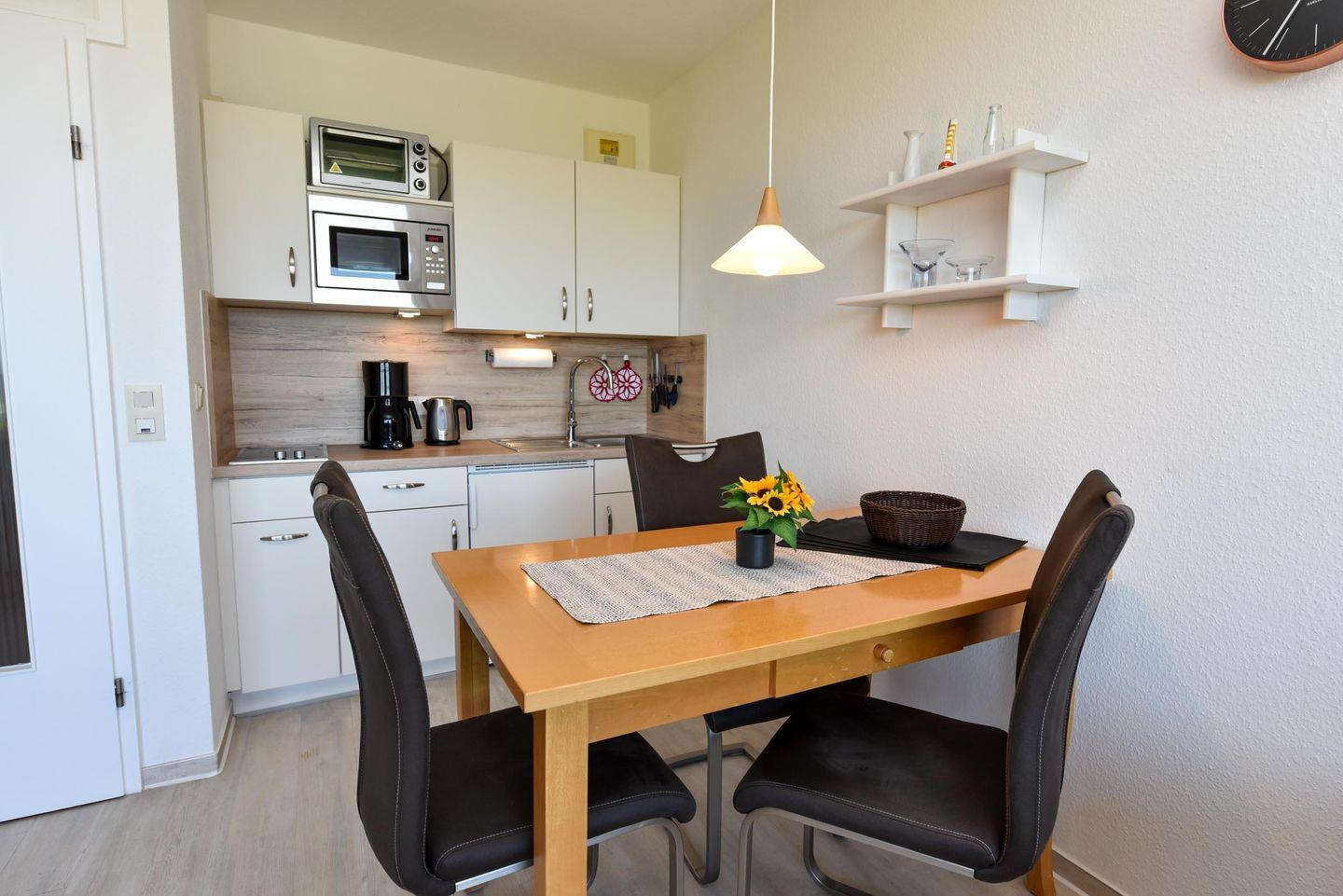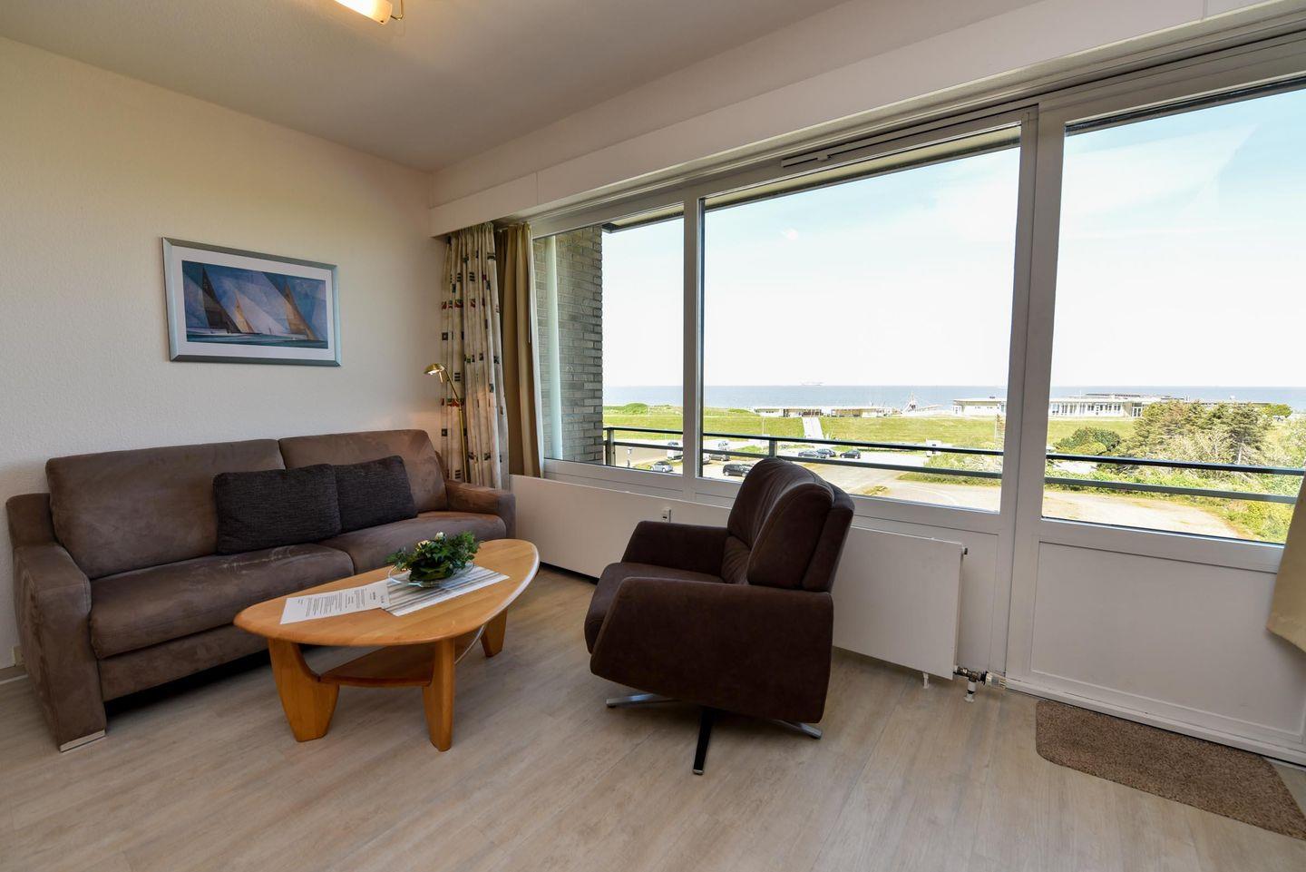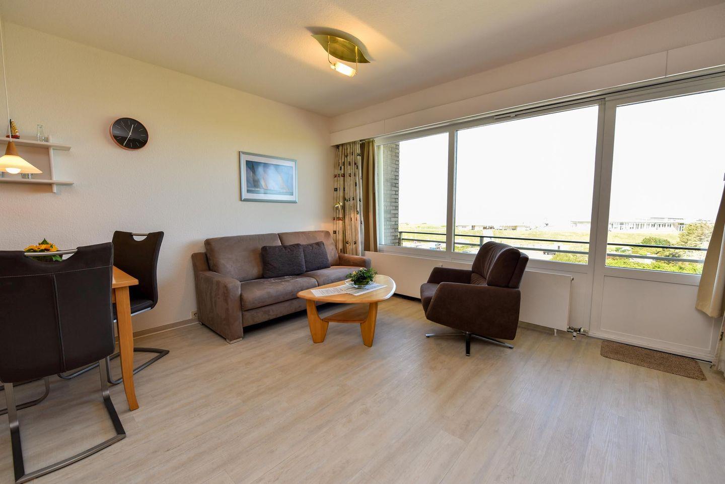 1-Zimmer Appartement für 2-3 Personen im 4. OG mit super Seesicht inklusive eigenem Strandkorb (01.05.-30.09.). Das Appartement wurde 2019 umfangreich und aufwendig renoviert. Im Wohnbereich befindet sich eine Kochnische mit Essbereich. Eine Sitzecke aus Couch, Sessel und Couchtisch lädt zum gemütlichen Verweilen ein. Als Schlafgelegenheit dient ein Doppelbett in Form eines Schrankbetts. Zusätzlich ist ein Etagenbett (90x190) abgetrennt im Flurbereich vorhanden. WC/Duschbad. Parkmöglichkeit besteht auf dem Tiefgaragenstellplatz (Einstellhöhe 149cm), oder mit einem kostenlosen Dauerparkschein ( vom 01.01. - 31.12. ) an der Nordfeldstraße, oder auf dem großen Parkplatz gegenüber.