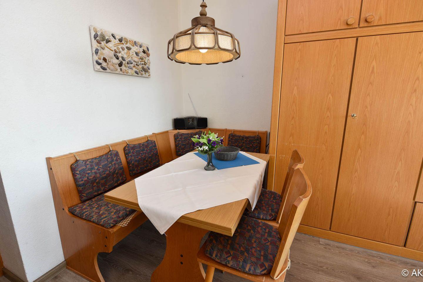 Großzügiges 1-Zimmer Appartement mit neuem Vinyl Boden im 4. OG, mit herrlich sonnigen Balkon und eigenem Strandkorb (01.05.-30.09.) am Sandstrand. Das kostengünstige Familienappartement ist komfortabel für 2 Personen mit bis zu 2 Kindern eingerichtet. Im Wohnbereich befindet sich ein Schrankbett, ein Schlafsofa und eine Couch mit 2 Sesseln. Zum Essen gibt es eine gemütliche Eckbank mit Tisch und zwei Stühle. In der kleinen Küche befindet sich u.a. auch ein 4-Platten-Herd. Duschbad/WC. Der Tiefgaragenstellplatz hat eine Einstellhöhe von 190 cm.