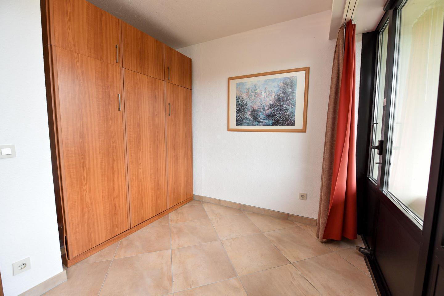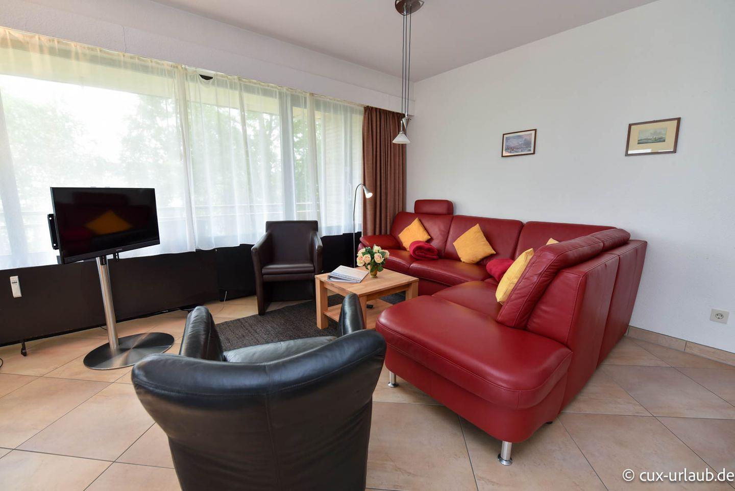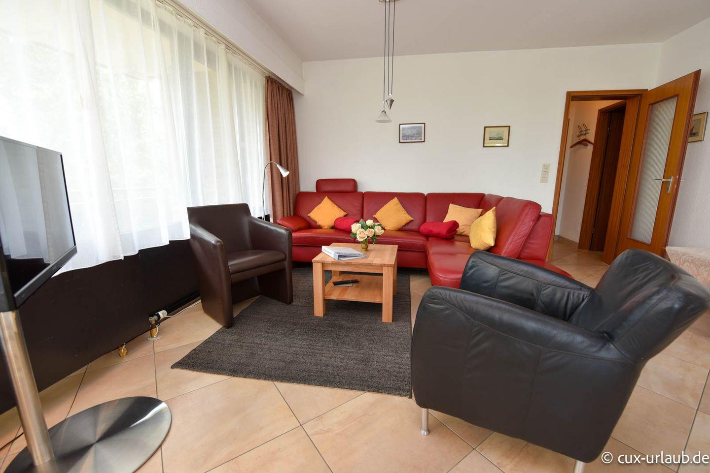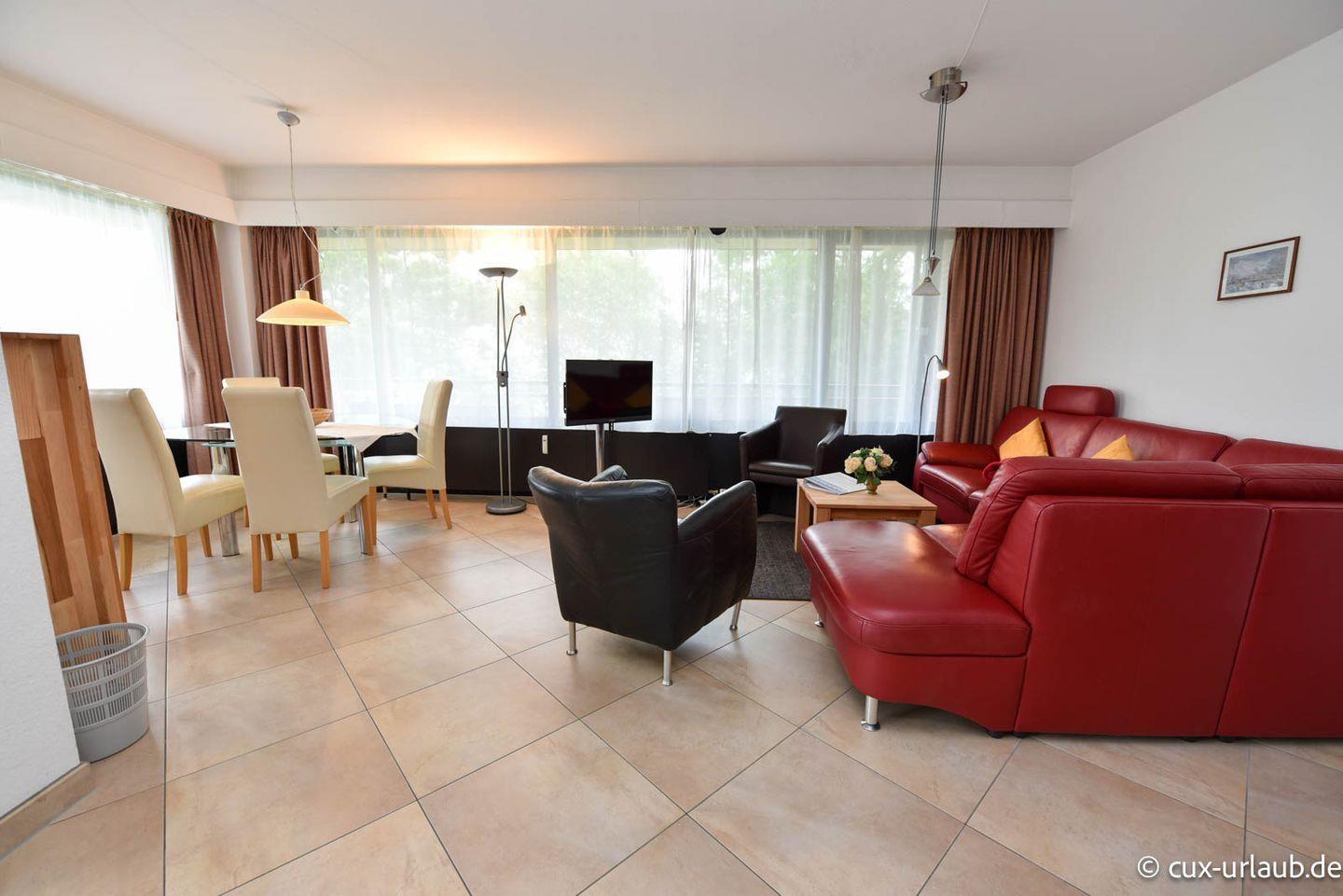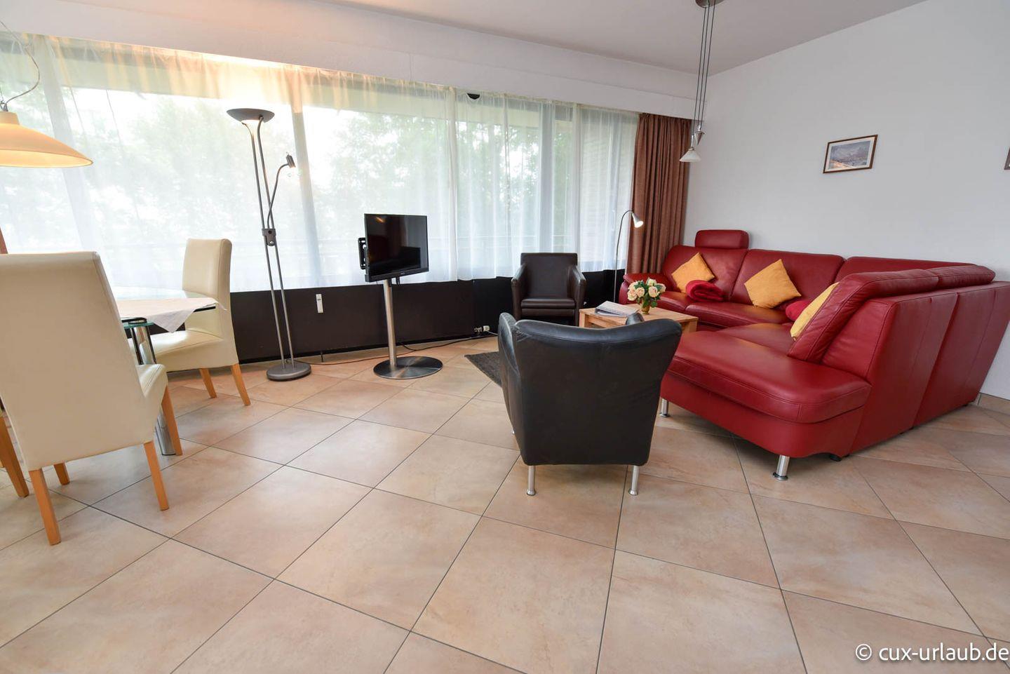 3-Zimmer Appartement für 4 Personen im 1. OG mit großem Nordostbalkon. Das Wohnzimmer ist u.a. mit einem Sofa und einem Esstisch mit 4 Stühlen ausgestattet. Vom Wohnbereich geht es zum Schlafraum in welchem sich Schrankbetten und die Tür zum Balkon befinden. Der zweite Schlafraum, welcher zwei Einzelbetten hat, ist vom Flur aus erreichbar. Es gibt Kabel-TV und eine Stereoanlage. In der modernen Küche befinden sich Spülmaschine, Mikrowelle und Backofen. Das geräumige Badezimmer ist mit einem Duschwannenbad ausgestattet und verfügt zudem über zwei Waschbecken. Der kostenlose Tiefgaragenstellplatz hat eine Einstellhöhe von 149cm.