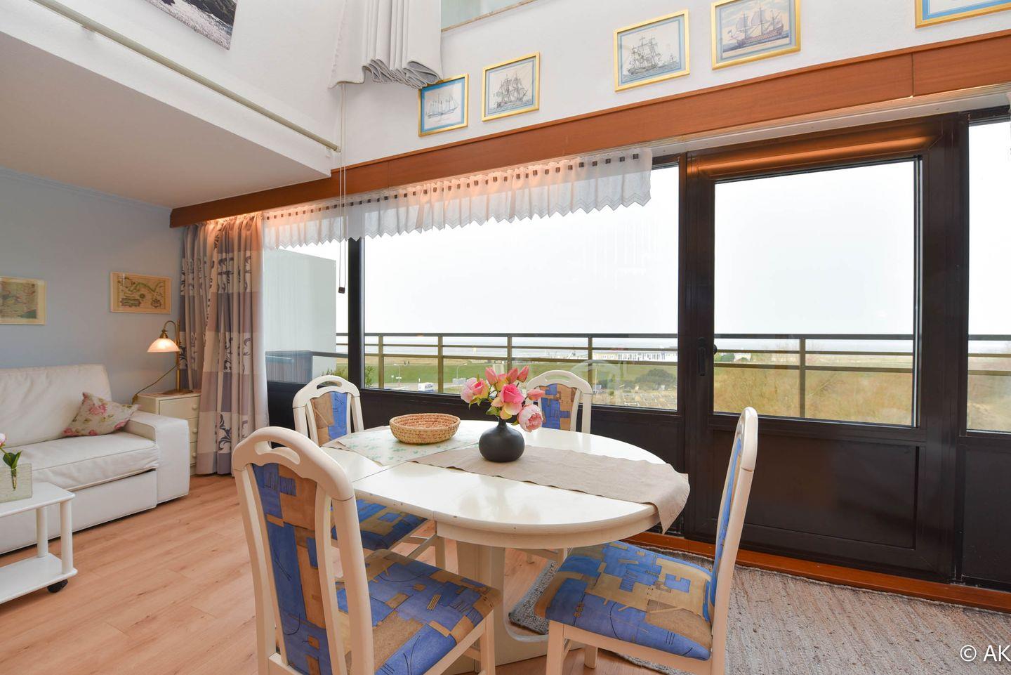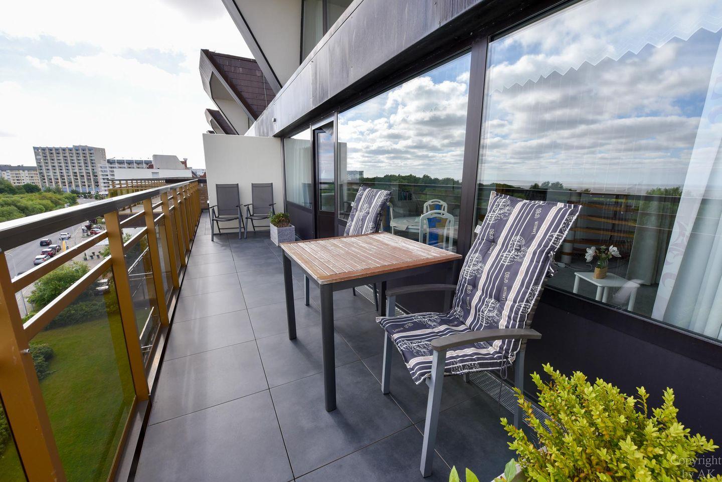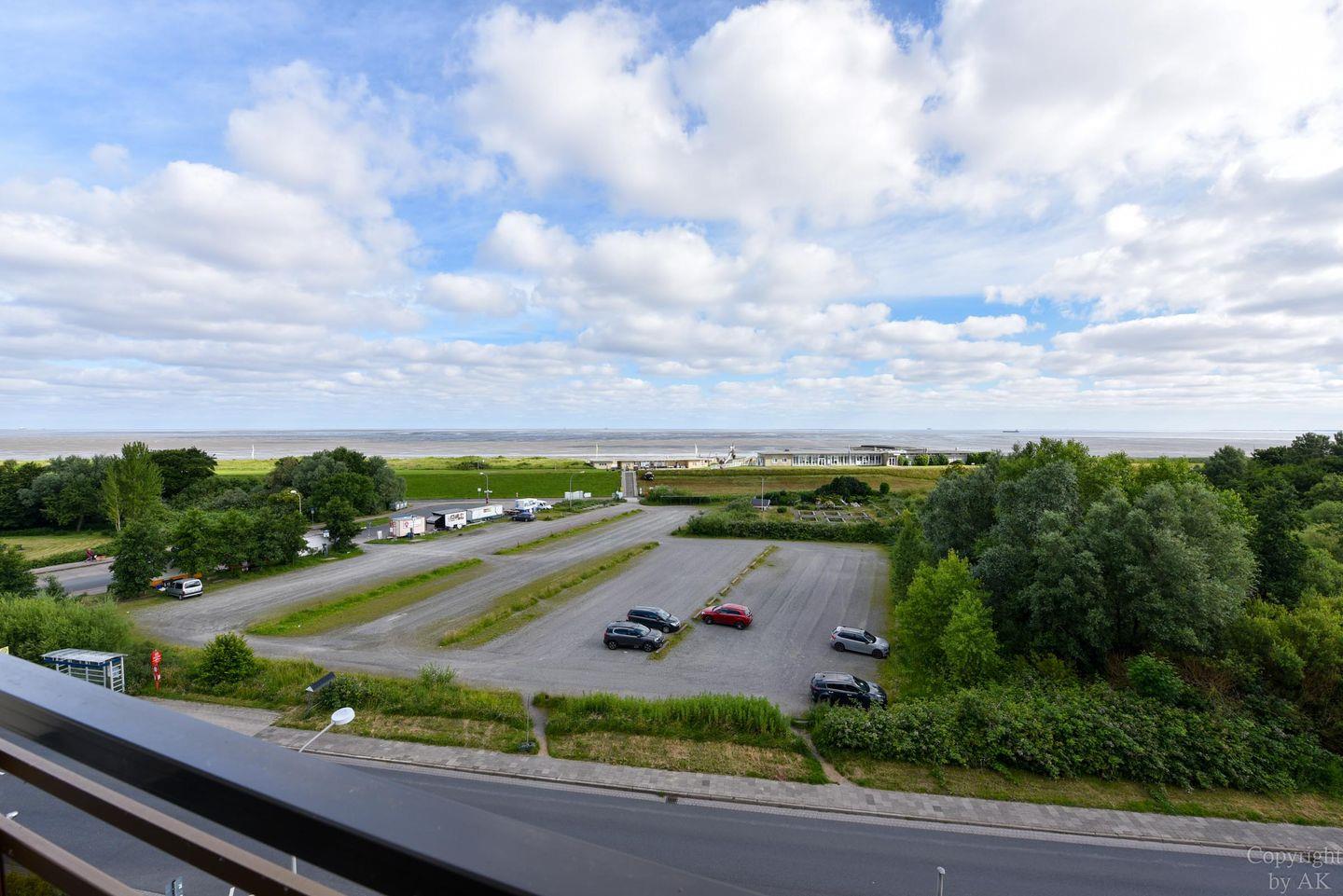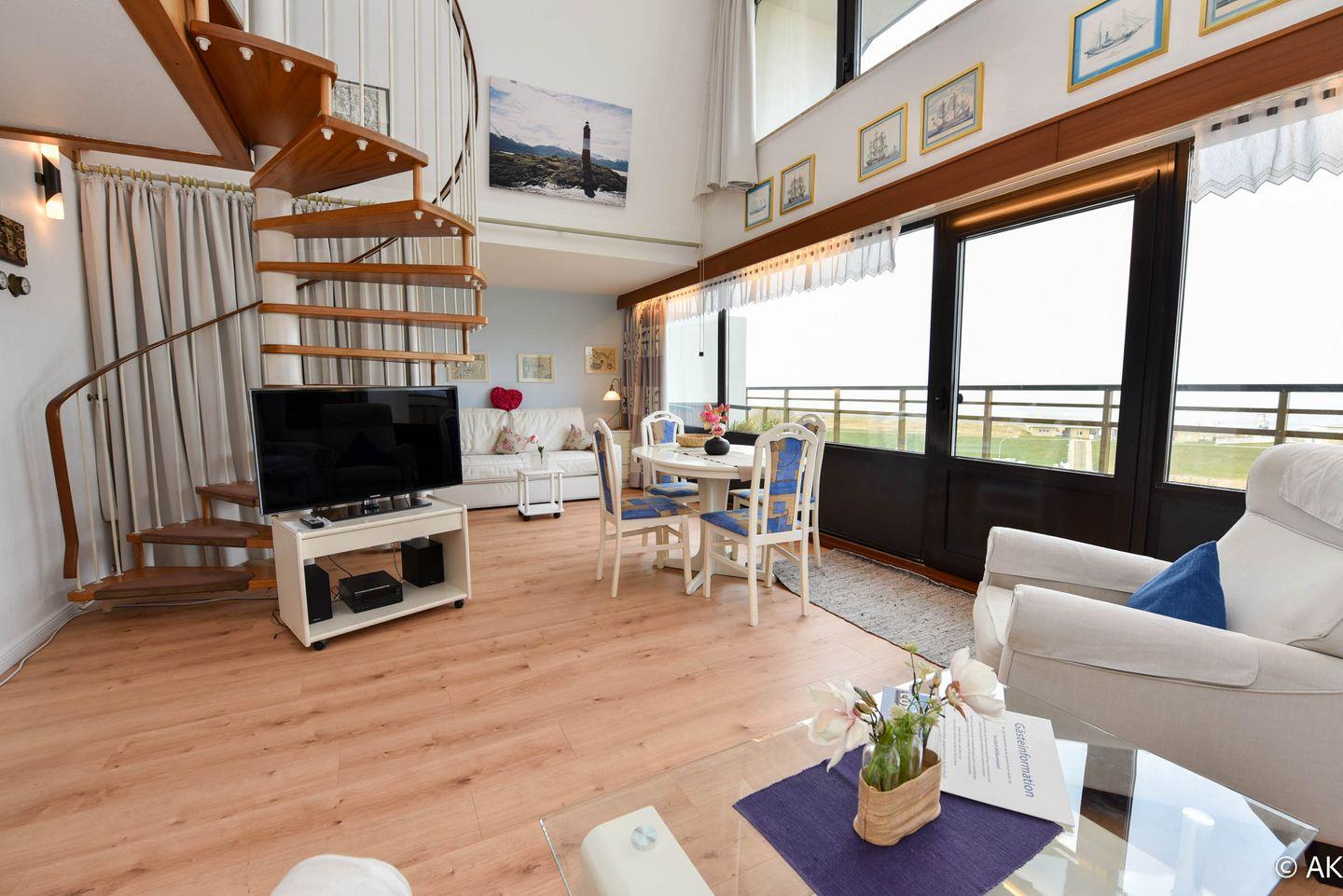 Die mit ca. 84m² sehr geräumige 2 Zimmer Penthouse-Wohnung liegt im 5. OG und bietet eine herrliche Panorama-Seesicht auf den Weltschifffahrtsweg, die Insel Neuwerk und das UNESCO-Weltkulturerbe Wattenmeer. Die Wohnung verfügt über einen großzügigen Wohnbereich mit Schlafsofas, Esstisch, Kabel-TV-Flachbild und einer großen Dachterrasse. Die Klappsessel bieten sich zum Lesen oder einfach „Blick genießen“ an. Die moderne Einbauküche mit Backofen, Mikrowelle, Geschirrspüler und Kühlschrank, lädt zum Kochen ein. Das großzügige Bad verfügt über Dusche und Badewanne. Die Empore (Stehhöhe ca. 165–175 cm) bietet zwei Einzelbetten je 120/200 cm und weitere Sessel zum Lesen und genießen des einmaligen Blicks. Ein Tiefgaragen-Stellplatz mit einer Stellhöhe von 1,90 m gehört zum App.. Das Gepäck kann mit dem Fahrstuhl bequem bis ins 5 OG transportiert werden.