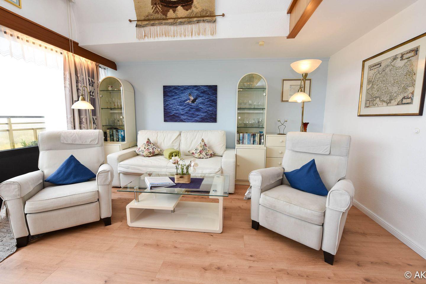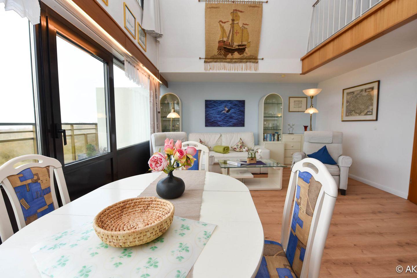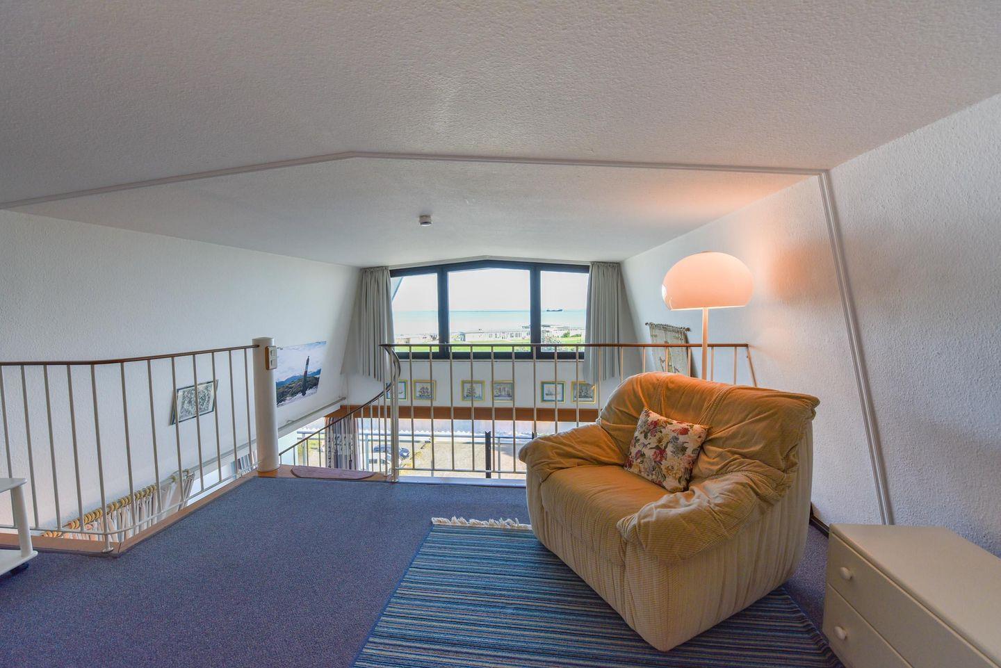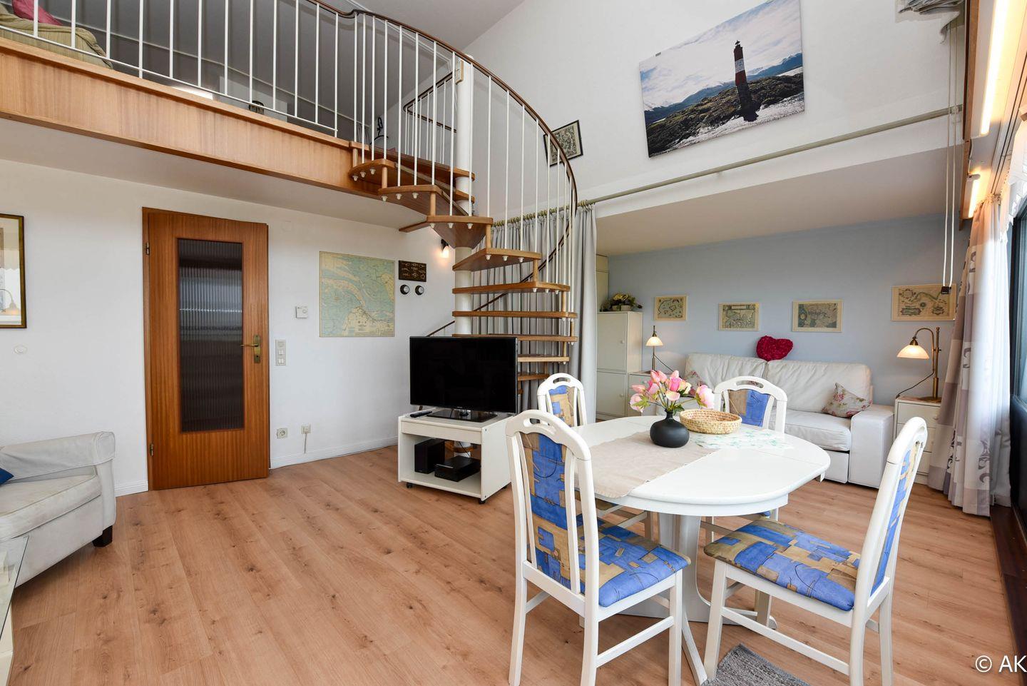 Die mit ca. 84m² sehr geräumige 2 Zimmer Penthouse-Wohnung liegt im 5. OG und bietet eine herrliche Panorama-Seesicht auf den Weltschifffahrtsweg, die Insel Neuwerk und das UNESCO-Weltkulturerbe Wattenmeer. Die Wohnung verfügt über einen großzügigen Wohnbereich mit Schlafsofas, Esstisch, Kabel-TV-Flachbild und einer großen Dachterrasse. Die Klappsessel bieten sich zum Lesen oder einfach „Blick genießen“ an. Die moderne Einbauküche mit Backofen, Mikrowelle, Geschirrspüler und Kühlschrank, lädt zum Kochen ein. Das großzügige Bad verfügt über Dusche und Badewanne. Die Empore (Stehhöhe ca. 165–175 cm) bietet zwei Einzelbetten je 120/200 cm und weitere Sessel zum Lesen und genießen des einmaligen Blicks. Ein Tiefgaragen-Stellplatz mit einer Stellhöhe von 1,90 m gehört zum App.. Das Gepäck kann mit dem Fahrstuhl bequem bis ins 5 OG transportiert werden.