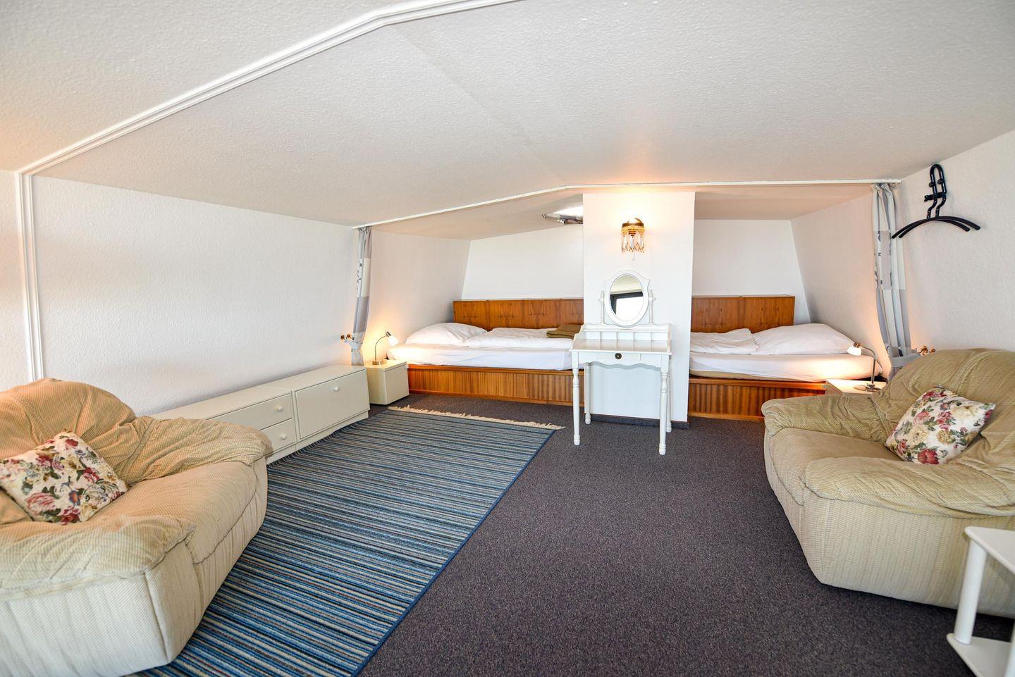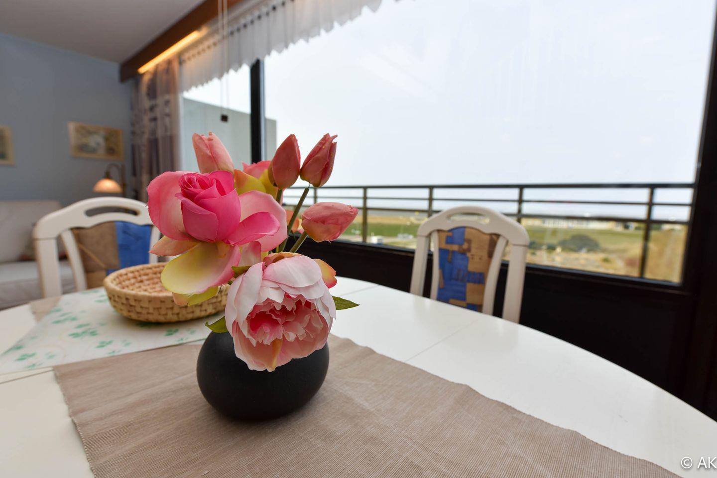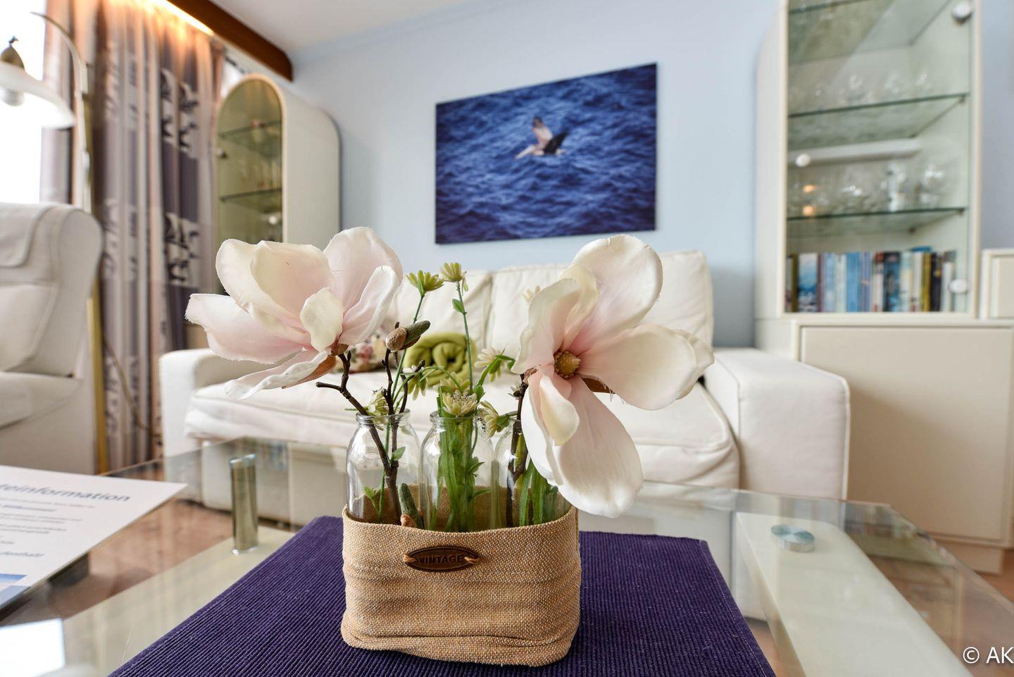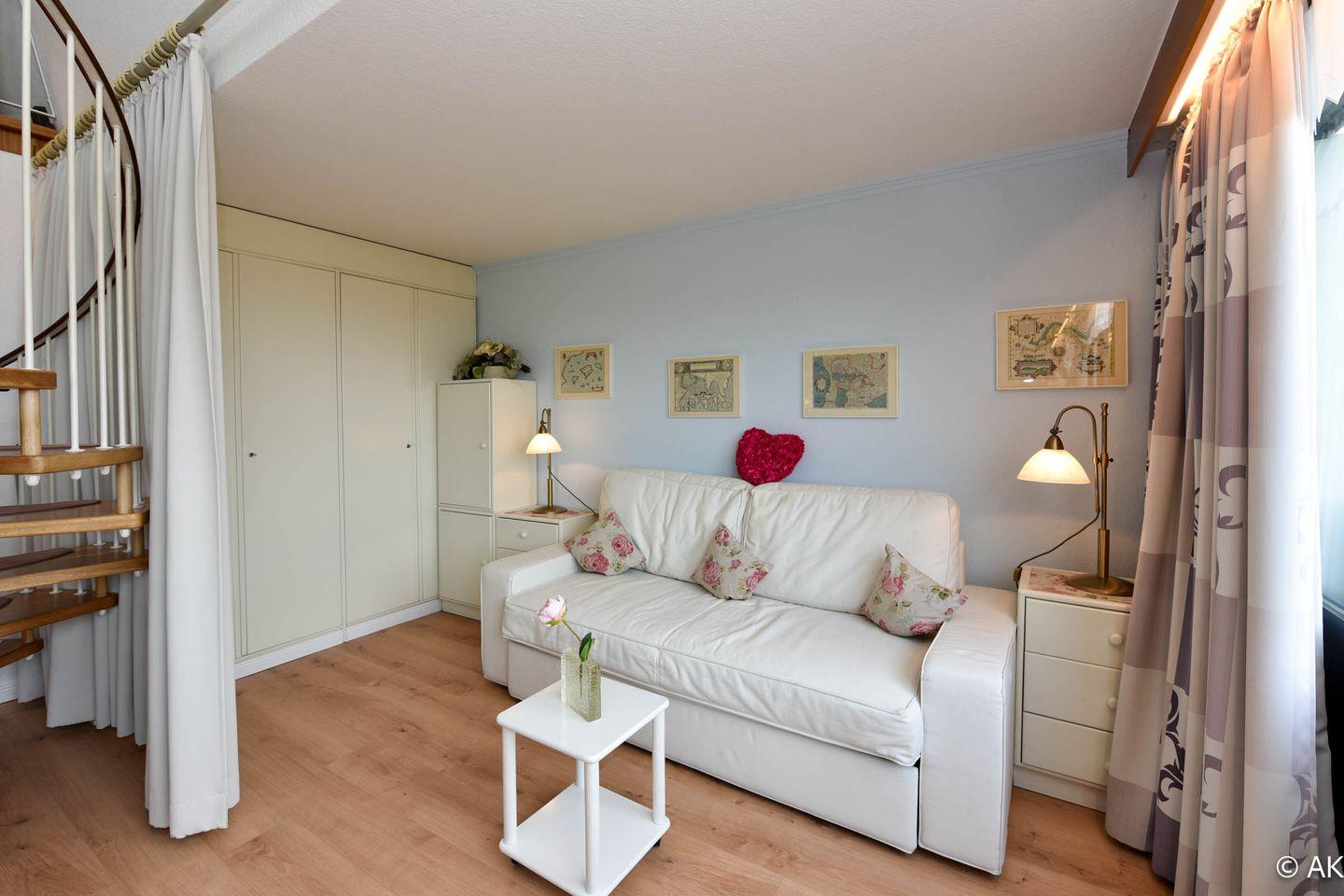 Die mit ca. 84m² sehr geräumige 2 Zimmer Penthouse-Wohnung liegt im 5. OG und bietet eine herrliche Panorama-Seesicht auf den Weltschifffahrtsweg, die Insel Neuwerk und das UNESCO-Weltkulturerbe Wattenmeer. Die Wohnung verfügt über einen großzügigen Wohnbereich mit Schlafsofas, Esstisch, Kabel-TV-Flachbild und einer großen Dachterrasse. Die Klappsessel bieten sich zum Lesen oder einfach „Blick genießen“ an. Die moderne Einbauküche mit Backofen, Mikrowelle, Geschirrspüler und Kühlschrank, lädt zum Kochen ein. Das großzügige Bad verfügt über Dusche und Badewanne. Die Empore (Stehhöhe ca. 165–175 cm) bietet zwei Einzelbetten je 120/200 cm und weitere Sessel zum Lesen und genießen des einmaligen Blicks. Ein Tiefgaragen-Stellplatz mit einer Stellhöhe von 1,90 m gehört zum App.. Das Gepäck kann mit dem Fahrstuhl bequem bis ins 5 OG transportiert werden.