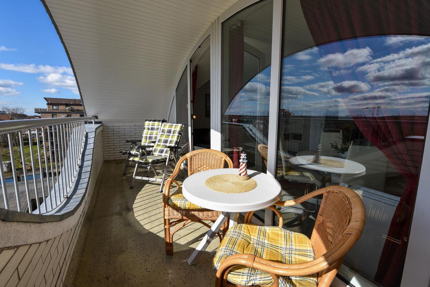 Die "LOTSEN-SUITE" ist ein großzügiges 2-Zimmer Appartement 4.OG. Die Suite bietet bis zu 4 Personen auf ca. 63 m² viel Platz. Sie betreten das App. durch die Diele mit Spiegelschuhschrank und Garderobe. Der Wohnraum mit Flach-TV, Stereoanlage und DVD Player ,einer Eßgruppe mit 4 Stühlen und gemütlichem Schlafsofa mit 2 Schlafplätzen und einem Sessel hat Wohlfühlcharakter. Im Schlafraum finden Sie ein Boxspringbett, einen großen Kleiderschrank, einen 2. Flachbild-TV und einen Safe. Die voll ausgestattete Küche mit Ceranfeld, Geschirrspüler, Mikrowelle mit Backofenfunktion und einem kleinen Esstisch mit 2 Stühlen lässt keine Wünsche offen. Das moderne Duschbad mit WC und Spiegelschrank überzeugt ebenfalls. Zusätzlich gibt es in der Wohnung einen großen Abstellraum mit Kleiderschrank zum unterbringen von Koffern und den Balkonmöbeln .Der große Südbalkon ist komplett überdach. Ebenfalls in der 4. Etage gibt es einen Wasch und Trockenautomaten, gegen geringe Bezahlung nutzbar. Ihr Auto steht geschützt in der Tiefgarage auf einem reserviertem Parkplatz.