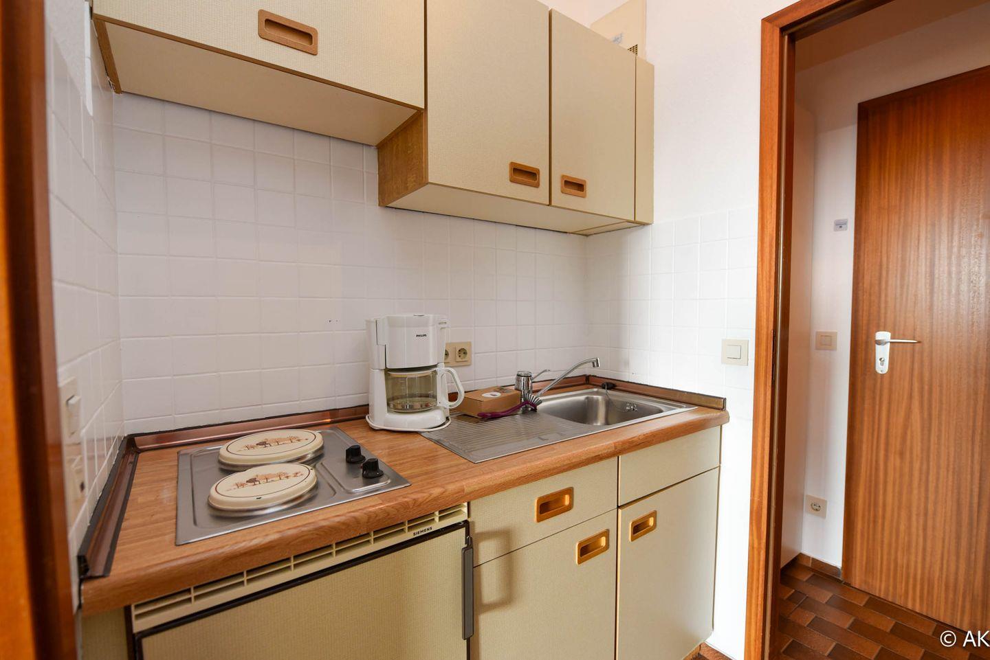 Das Appartement ist für zwei Personen eingerichtet und verfügt über eine praktische Küchenzeile, in der Sie kleinere Gerichte zubereiten können. Das moderne Duschbad mit WC rundet die Ausstattung ab.