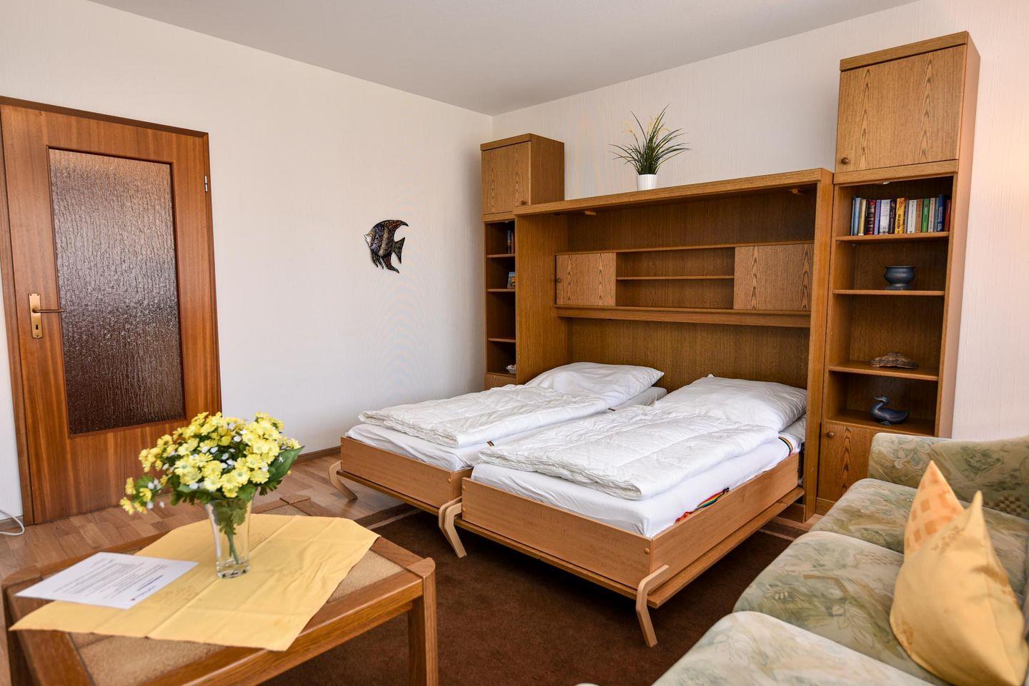 Die Wohnung bietet einen kombinierten Wohn- und Schlafraum mit Schrankbett und gemütlicher Couchgarnitur sowie ein separates Schlafzimmer mit einem komfortablen Doppelbett in Komforthöhe – ideal für erholsame Nächte.