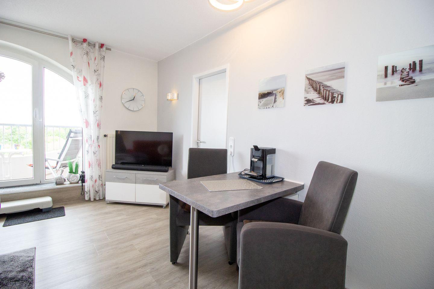 Haus "Deichgraf", App.-Nr. 345, bis 2 Pers., 3. Etage, ca. 38 qm Größe, Nordseite, Meerblick, Schlafzimmer mit 2 Einzelbetten, Offene Küche mit Ceranfeld, Geschirrspüler und Mikrowellen-Backofen-Kombination, Wohnbereich mit Sofa und Relax-Sessel, Bad mit Dusche und WC, Balkon, Kabel-TV, kostenl. WLAN-Zugang im App., Haustiere sind nicht gestattet, Nichtraucherwohnung, Außenstellplatz.