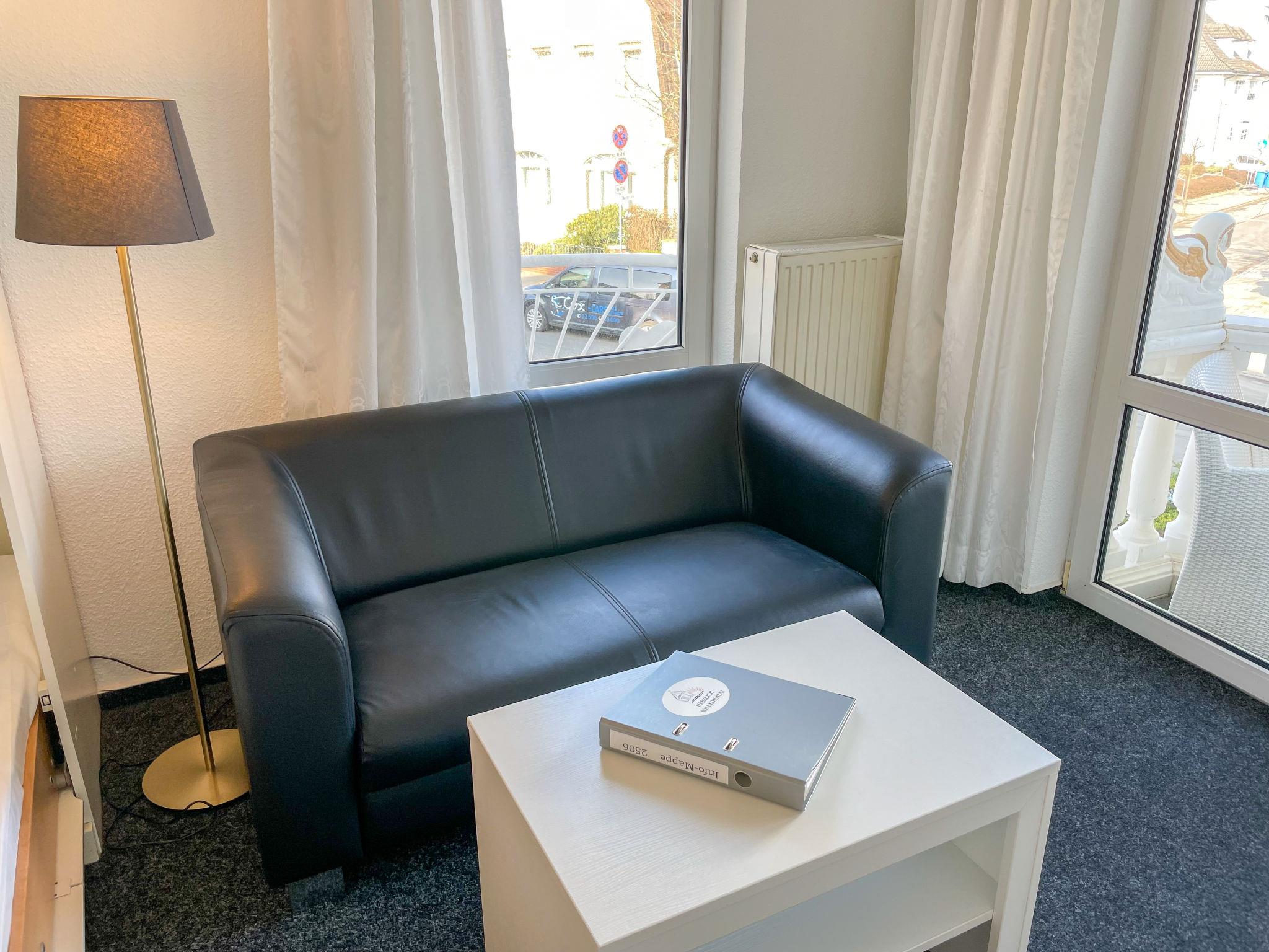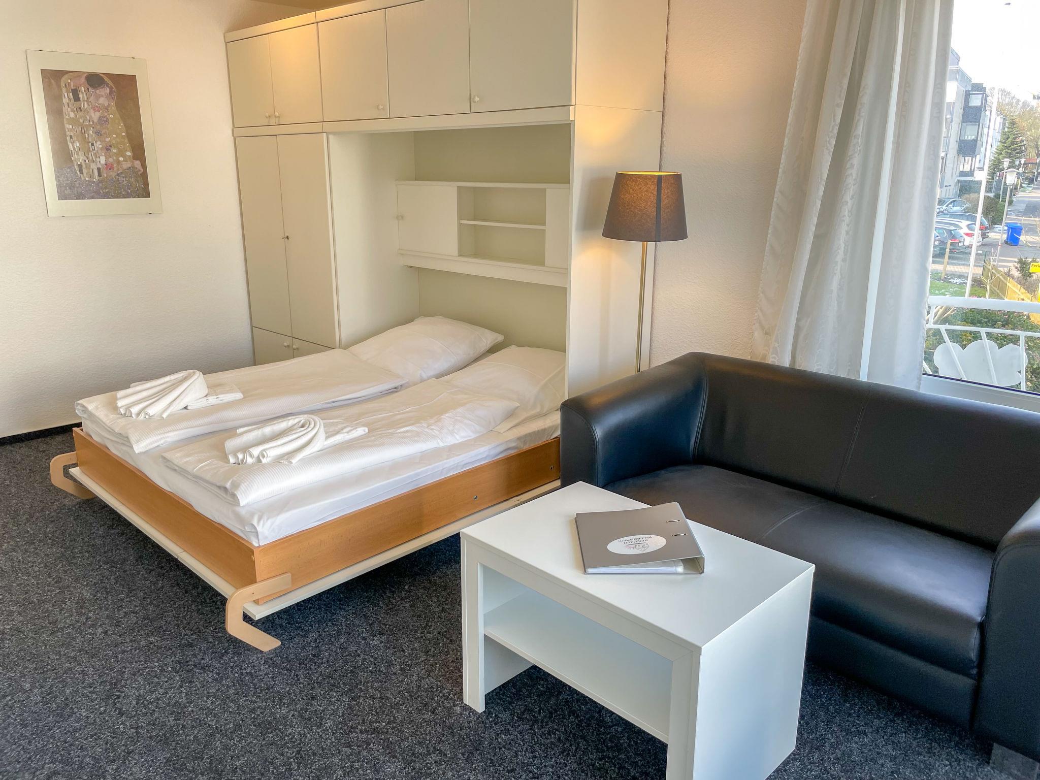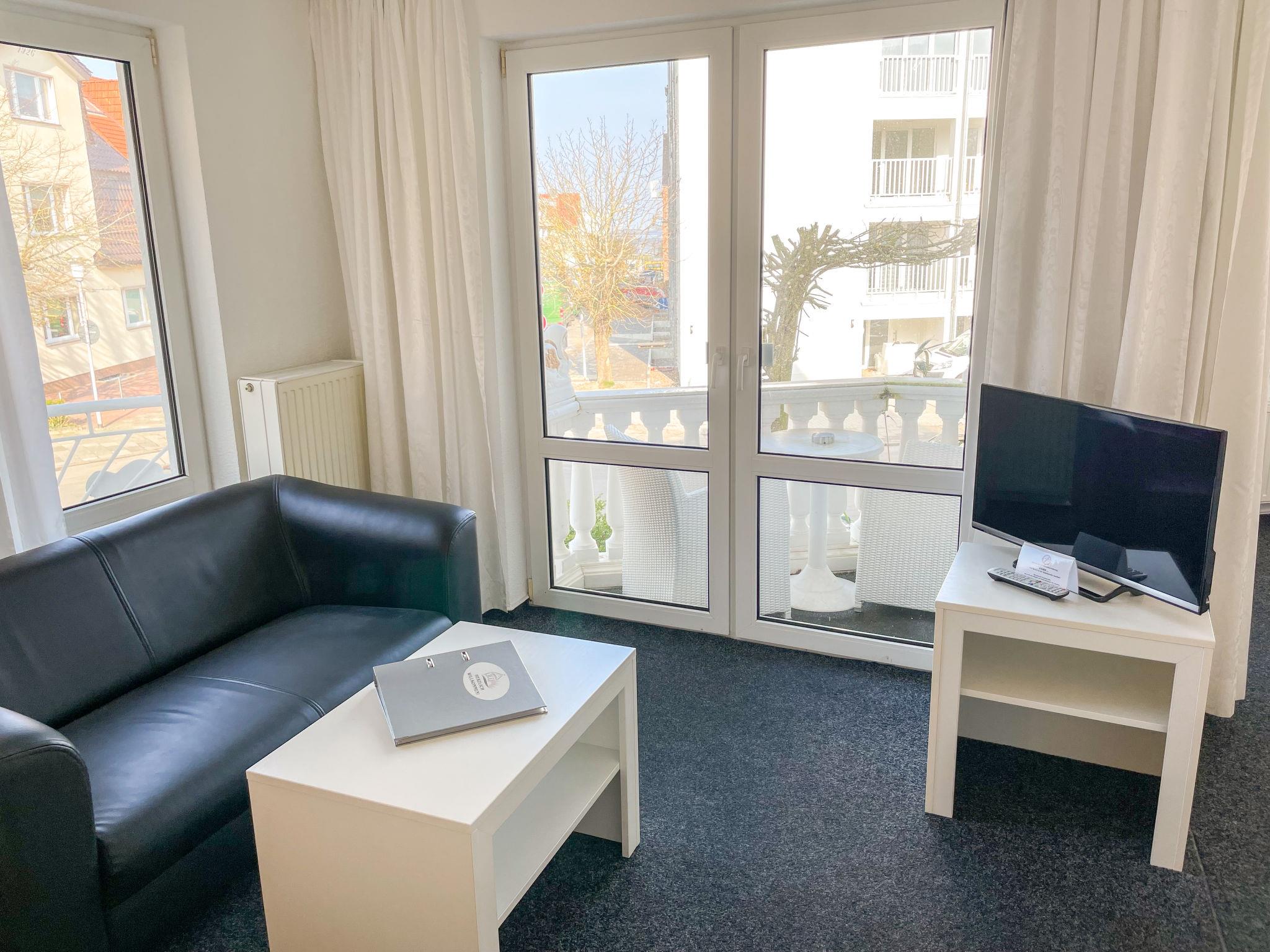"Duhnen", 1-room apartment 30 m2. Cosy furnishings: open living/sleeping room with 1 double fold-away bed, dining table, satellite TV and radio. Kitchenette (2 hot plates, toaster, kettle, microwave, electric coffee machine). Shower/WC. Heating. Balcony or terrace. Balcony furniture. Facilities: children's high chair, baby cot. Internet (WiFi, free). Please note: non-smokers only. Maximum 1 pet/ dog allowed. Smoke alarm, fire extinguisher.