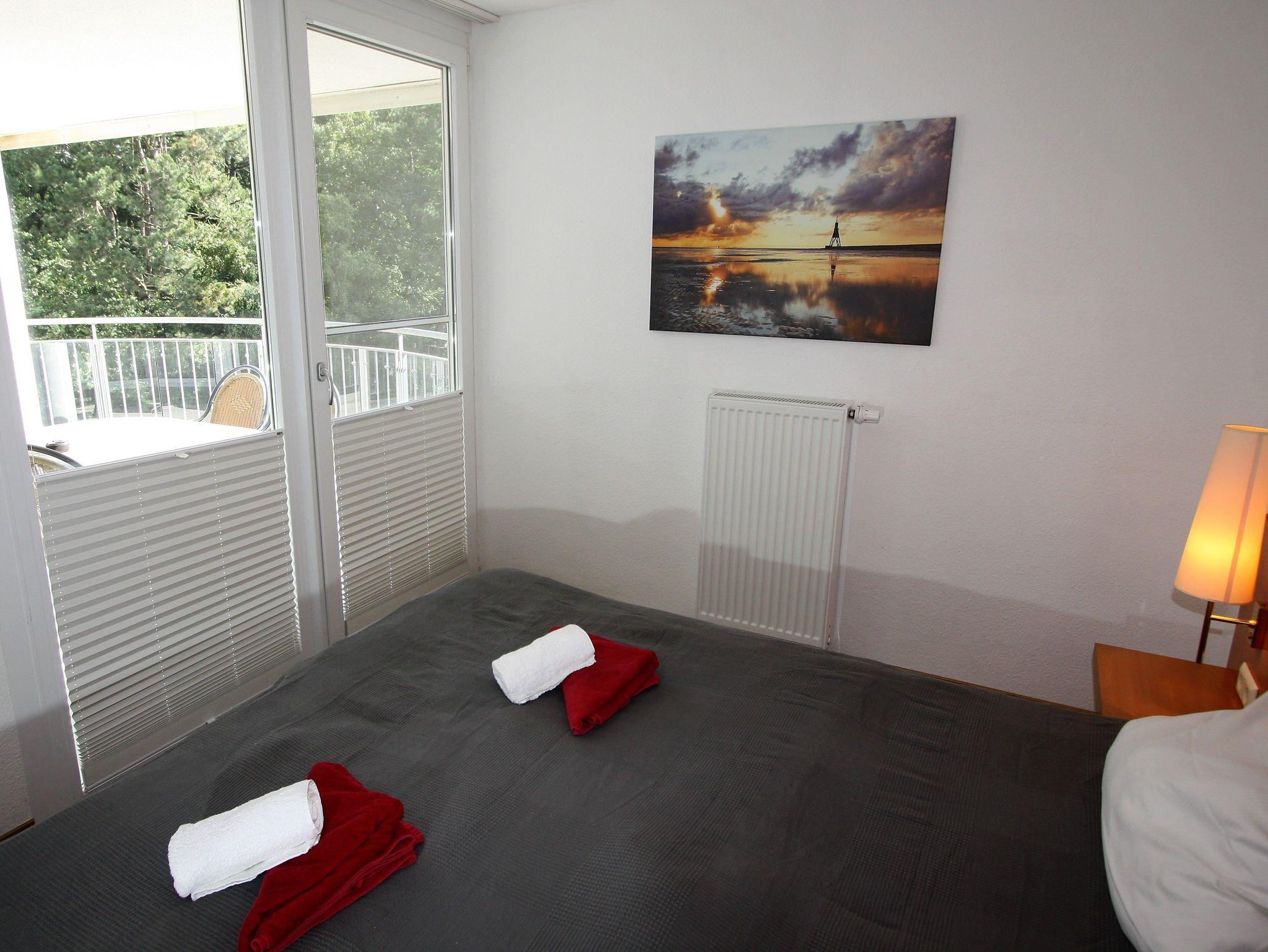 unsere 75 m² große 3?Zimmer?Ferienwohnung Nr. 1.25 für bis zu 6 Personen liegt im 2. OG mit teilweise Blick auf die See und ist mit dem Lift erreichbar. Es gibt einen 13 m² großen Balkon mit sechs Gartenstühlen und einem großen Tisch.