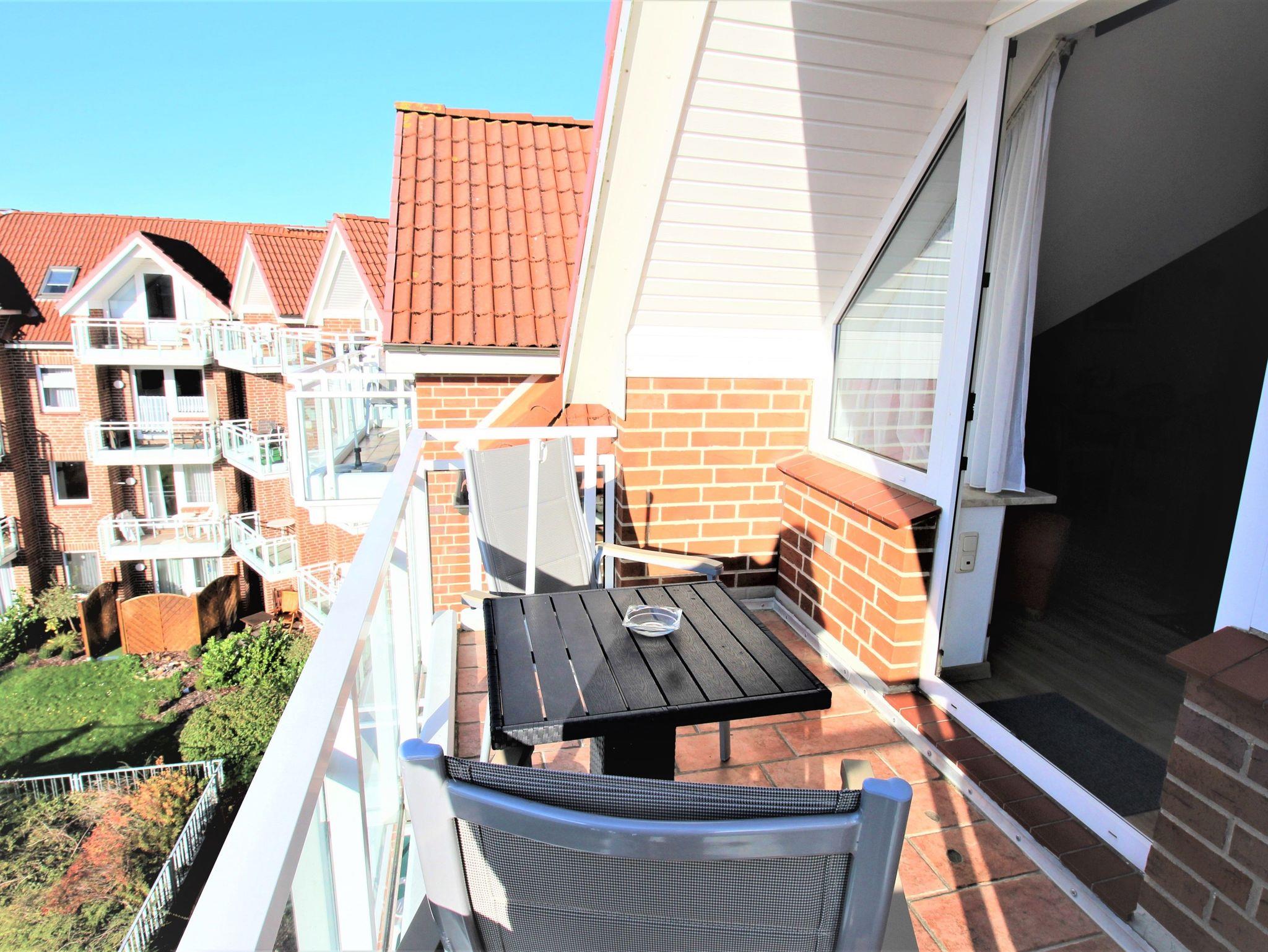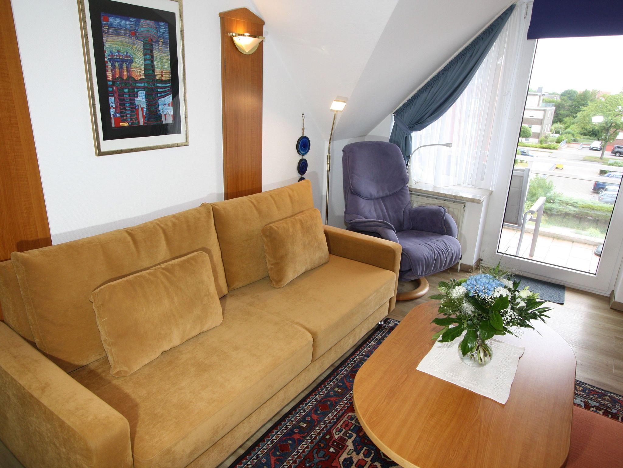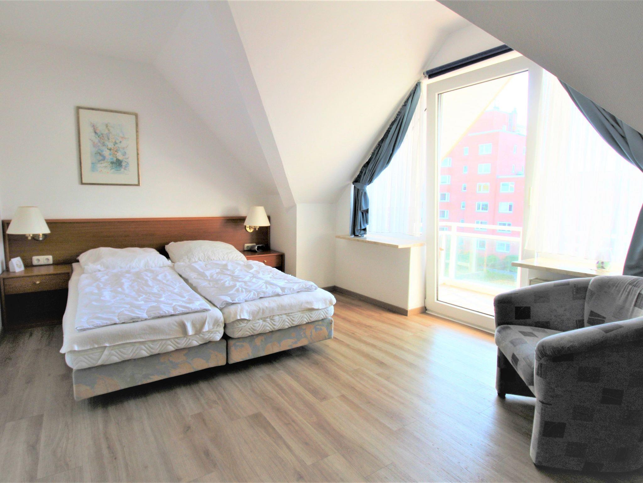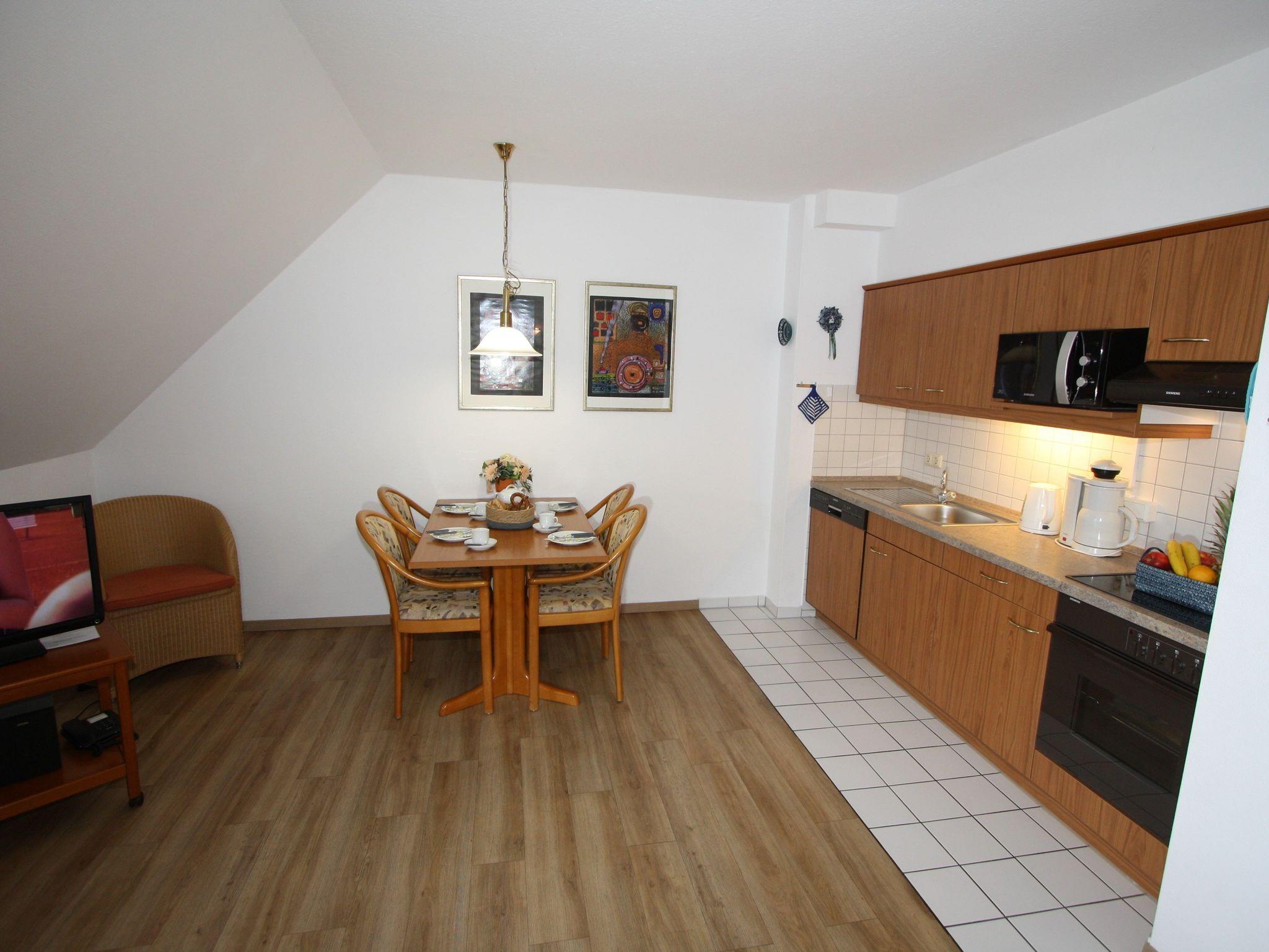 Sie wohnen in einem 2-Zimmer-Appartement für bis zu 4 Personen auf 48 m² im Dachgeschoss. Ein Schlafzimmer mit Doppelbett, Wohn-/Schlafraum mit bequemer Doppelbettcouch, separater Essplatz, voll ausgestatteter Küchenbereich mit Geschirrspüler, Dusche/WC, zwei Balkone, SAT-TV.