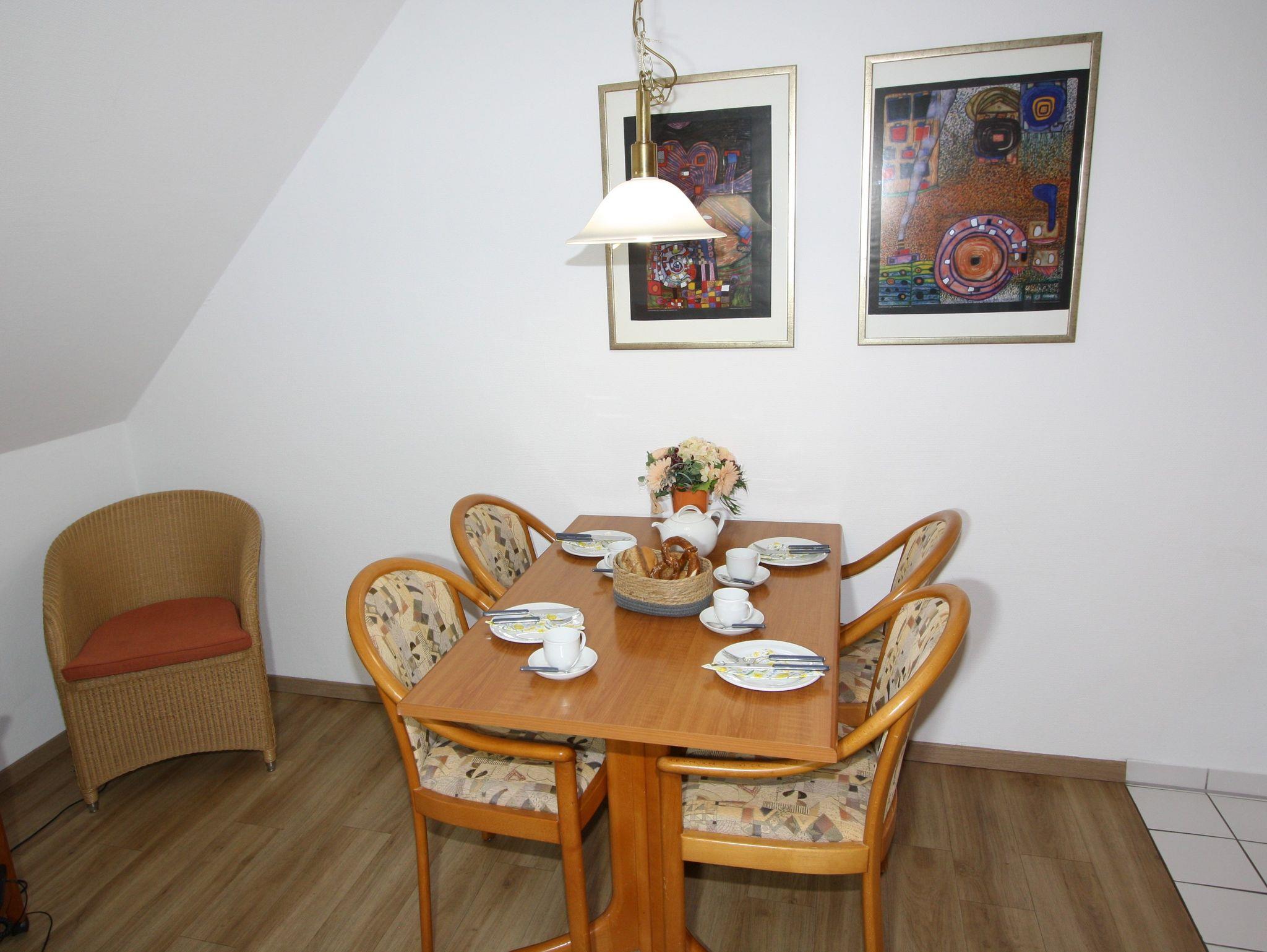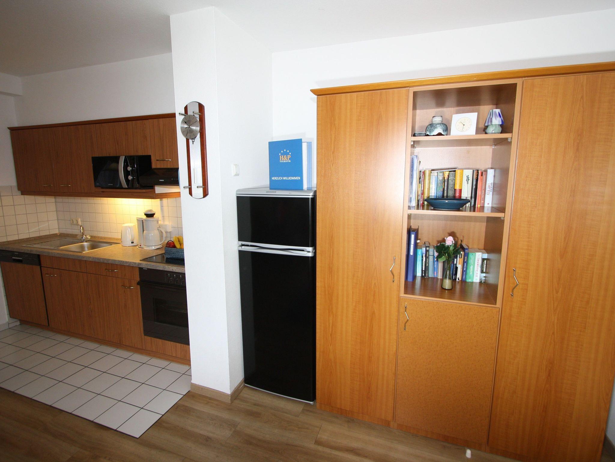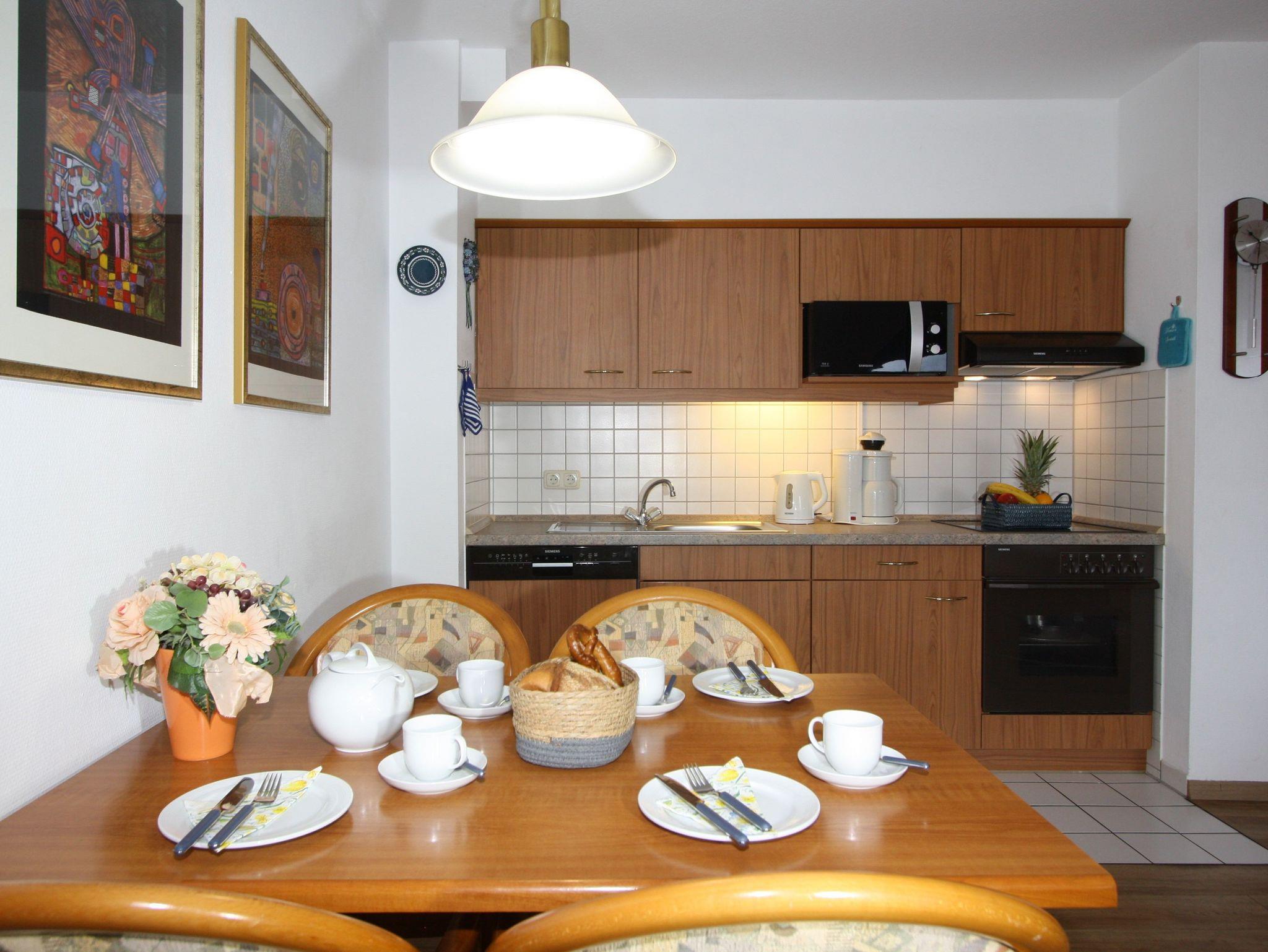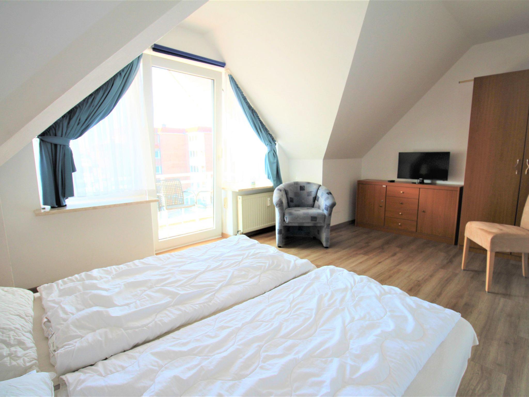 Sie wohnen in einem 2-Zimmer-Appartement für bis zu 4 Personen auf 48 m² im Dachgeschoss. Ein Schlafzimmer mit Doppelbett, Wohn-/Schlafraum mit bequemer Doppelbettcouch, separater Essplatz, voll ausgestatteter Küchenbereich mit Geschirrspüler, Dusche/WC, zwei Balkone, SAT-TV.