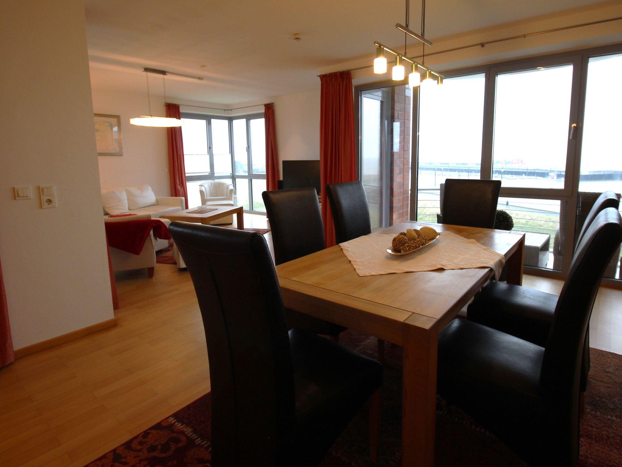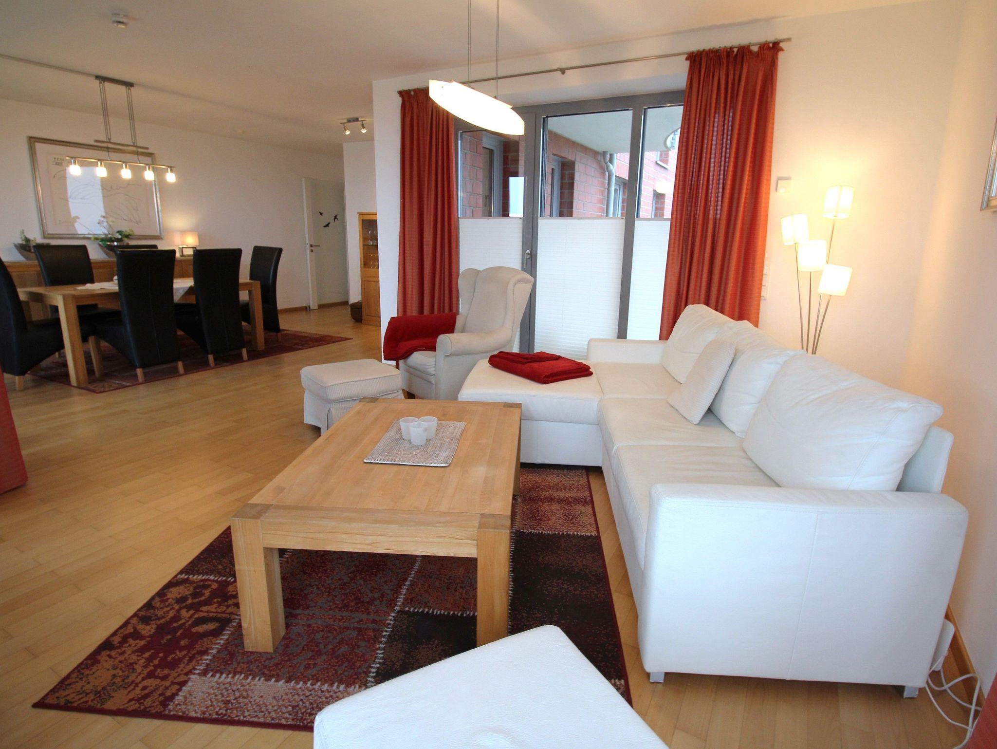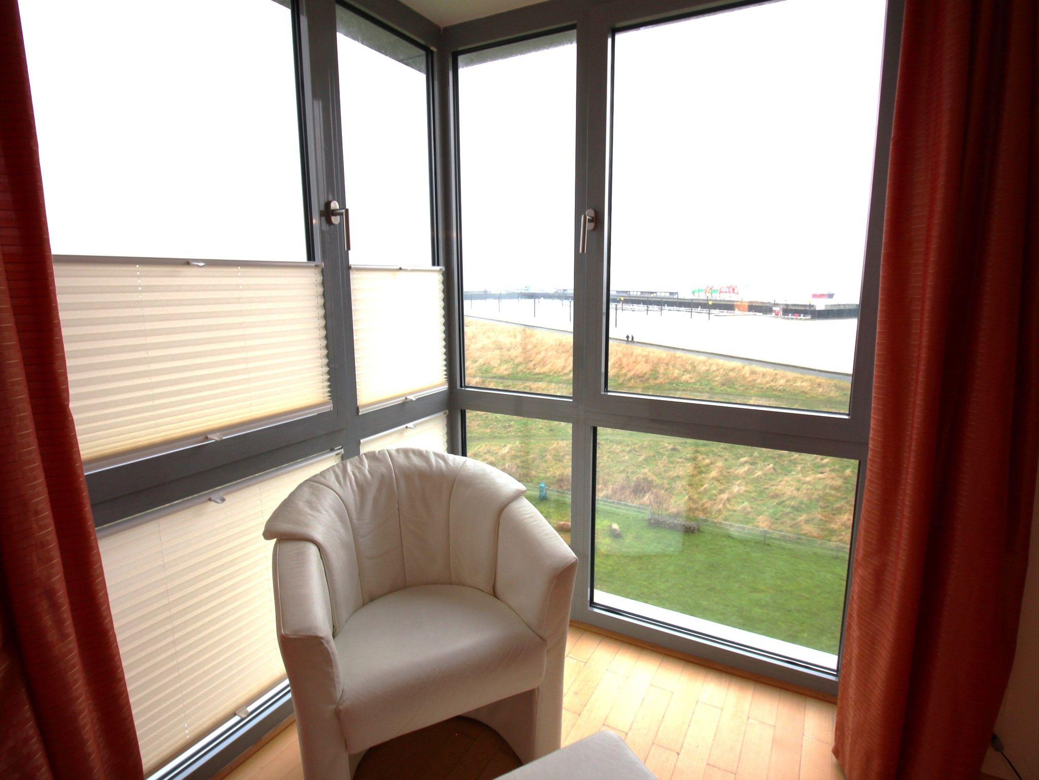 Stilvoll eingerichtete Ferienwohnung mit gehobener Ausstattung in der zweiten Etage der Residenz am Yachthafen, mit weiter Panorama-Seesicht vom Bereich der Kugelbake bis zum Radarturm.