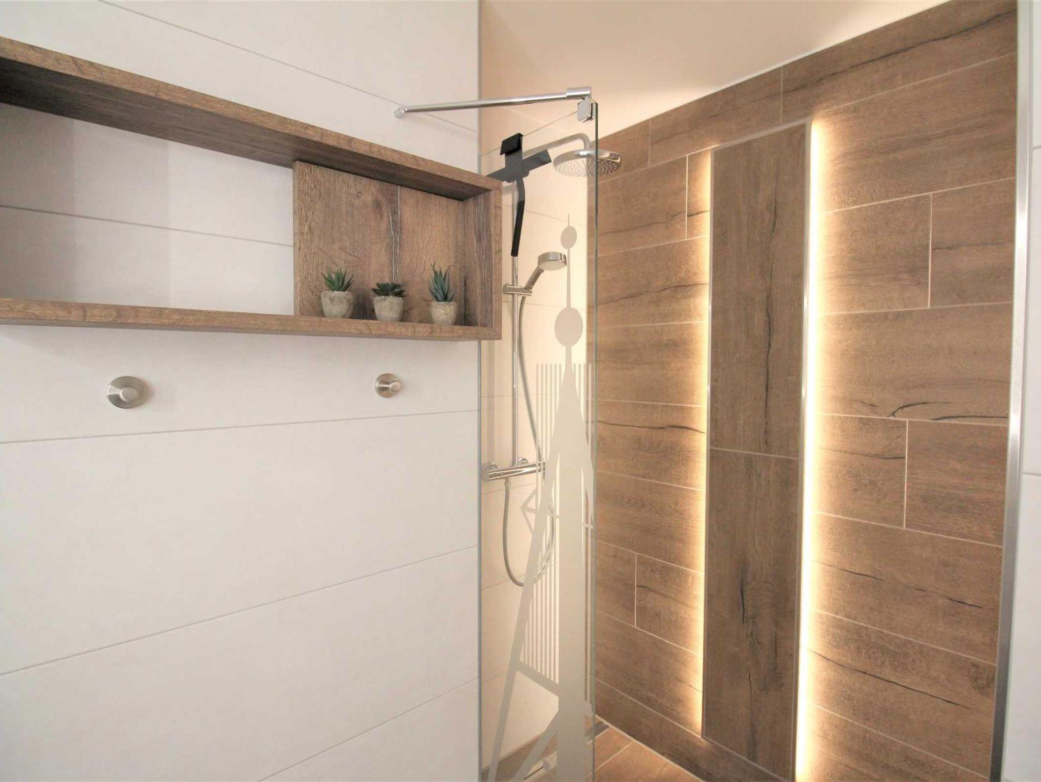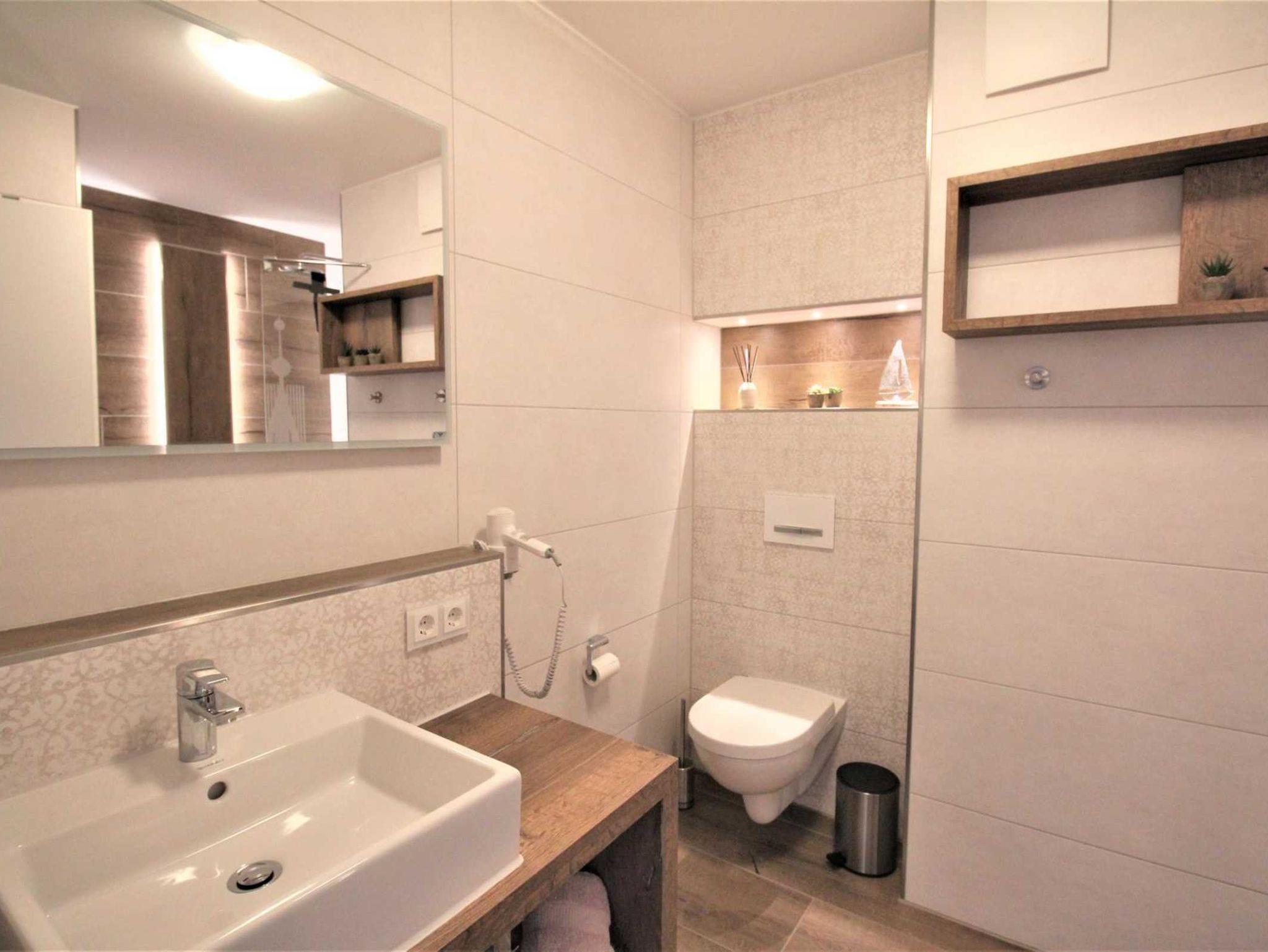 ? Badezimmer mit Waschtisch, barrierefreier Regendusche, WC, Föhn und Handtuchheizkörper