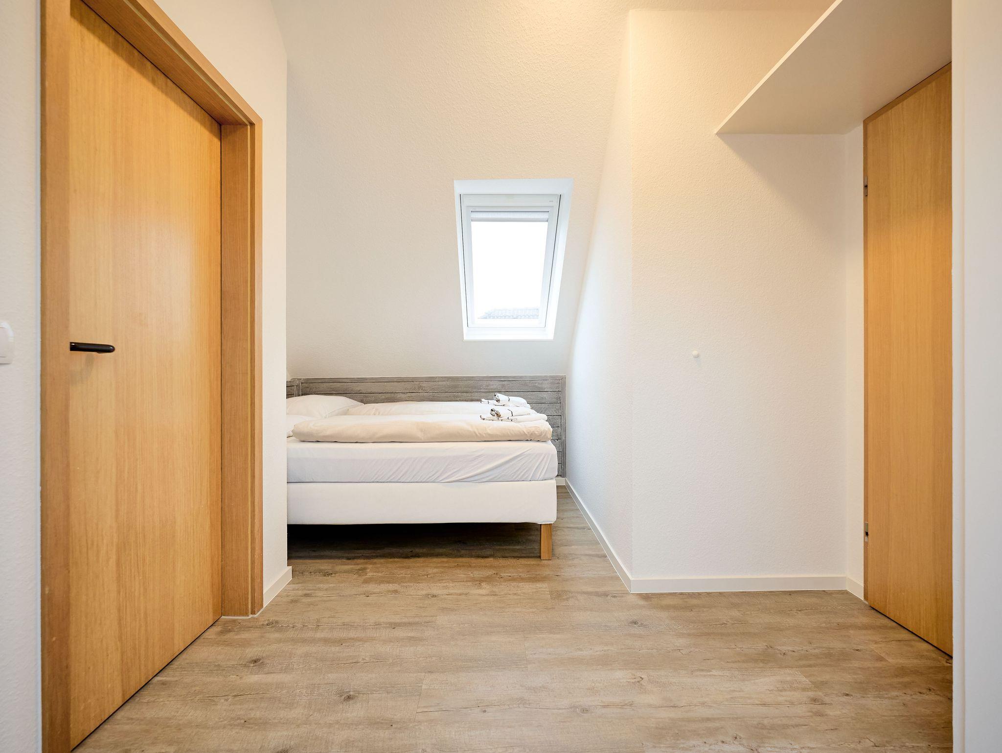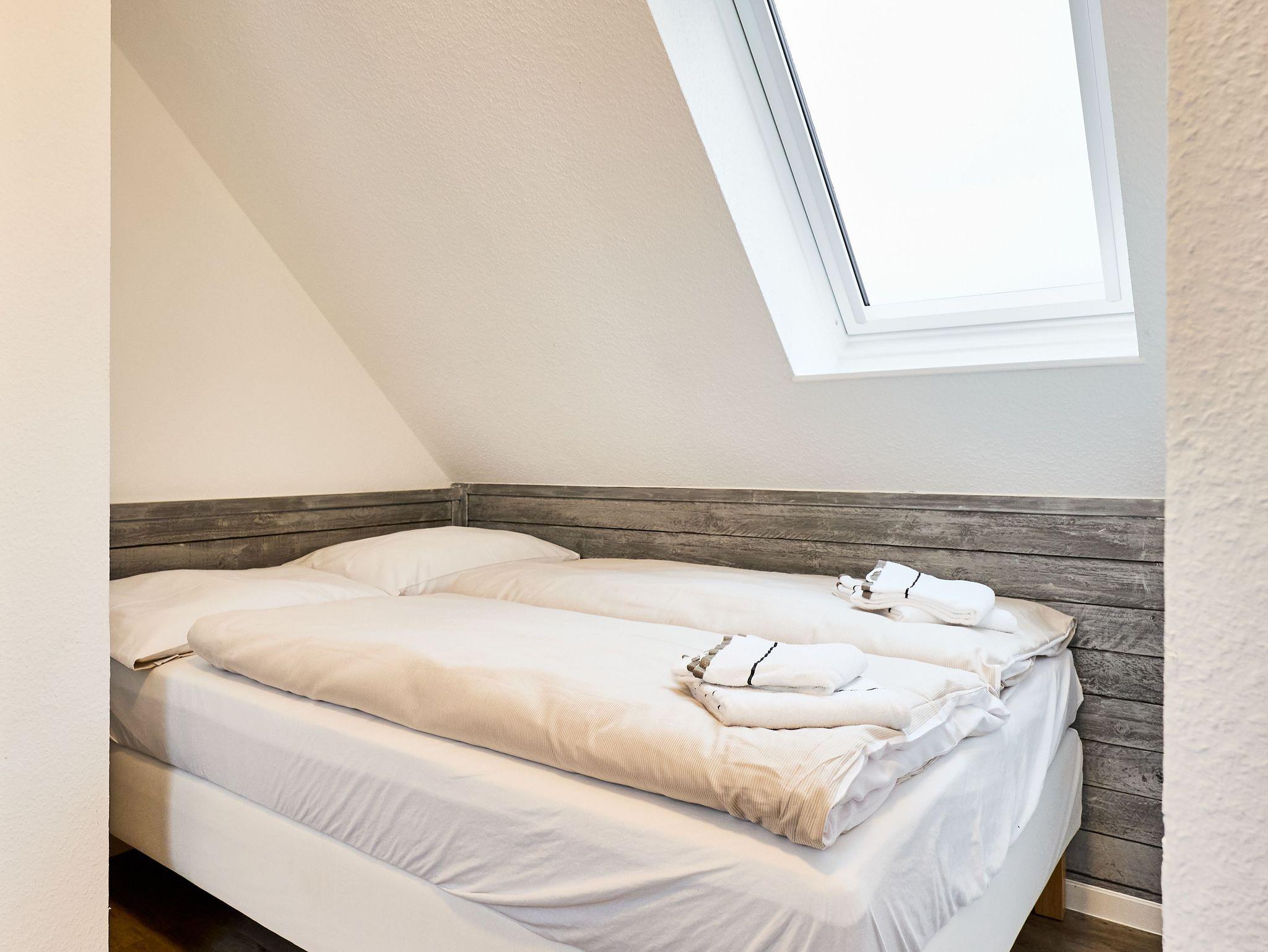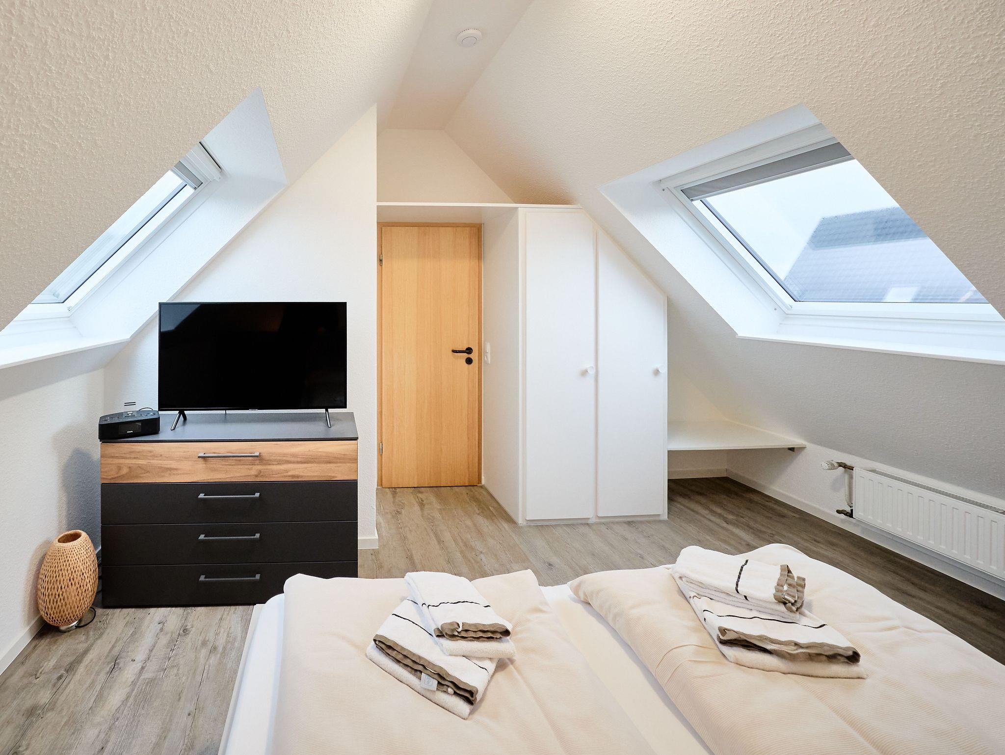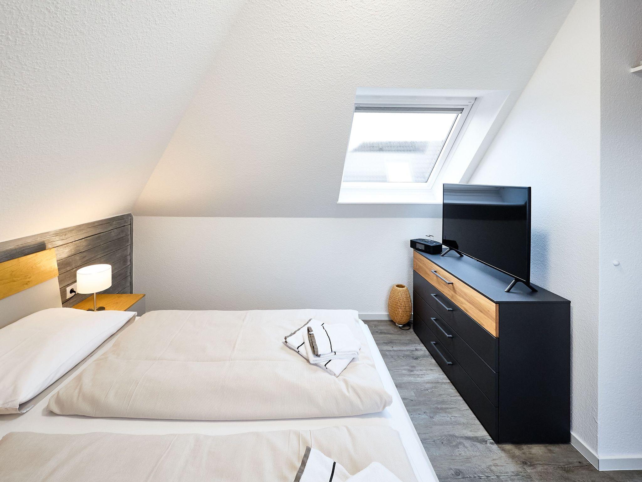 Das Hauptschlafzimmer im Dachgeschoss verfügt über ein Doppelbett (180×200 cm), Kleiderschrank und 2. TV-Gerät mit Internetfernsehen und Streaming. Das Kinder-/Durchgangszimmer ist mit einem 140?cm breiten Doppelbett ausgestattet und trennt das Hauptschlafzimmer sowohl vom Badbereich als auch vom Treppenhaus.