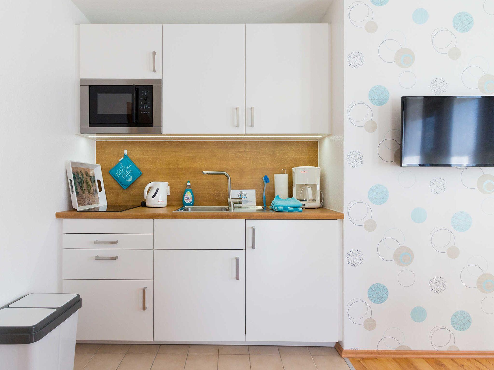 Ein Flachbildschirm mit Kabel TV sowie kostenloses WLAN mit schneller Internetanbindung steht Ihnen zur Verfügung. Die im Wohn - Schlafraum integrierte Küchenzeile ist mit einem großen Kühlschrank mit Gefrierfach sowie einer Mikrowelle und einem Induktionskochfeld ausgestattet. Außerdem finden Sie in der Küche alles, was für eine unbeschwerte Zeit nötig ist.