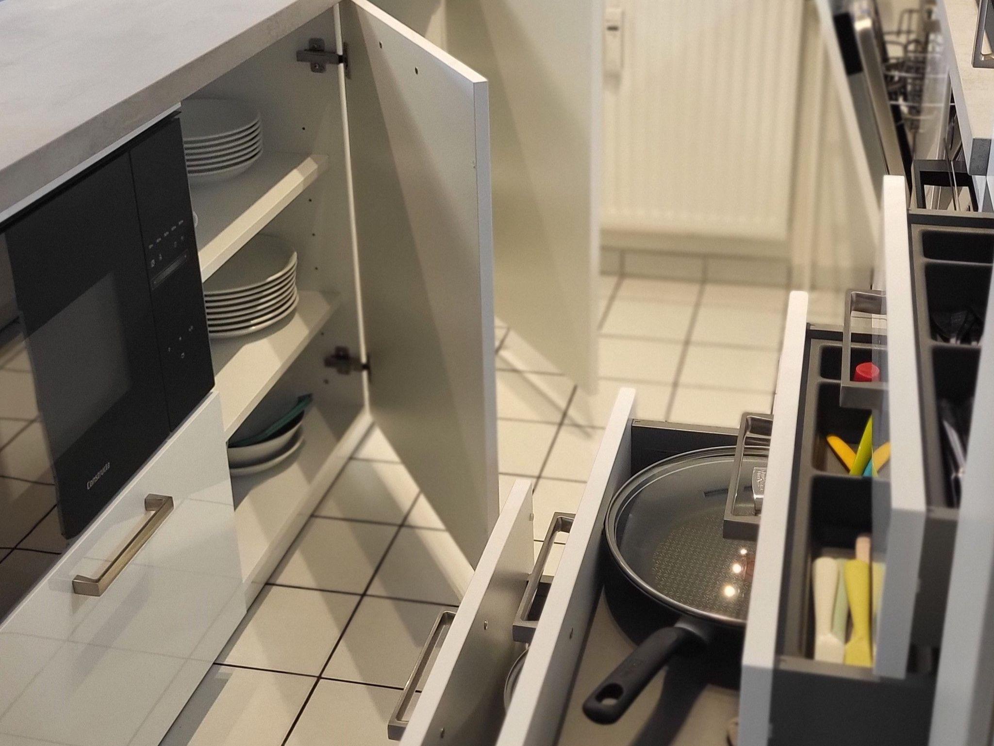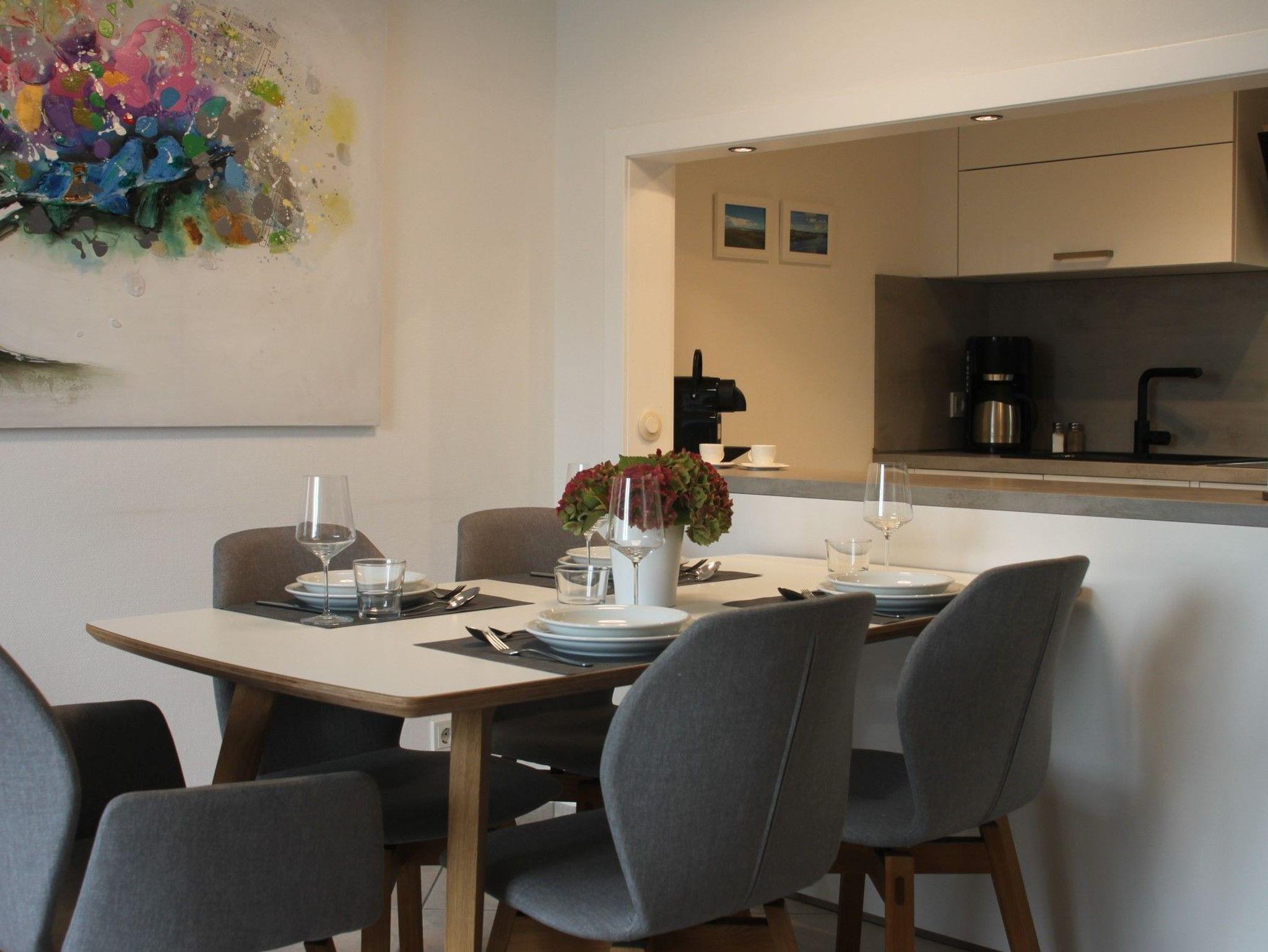 Die komplett eingerichtete Küche mit Durchreiche zum Esstisch verfügt über ein großes Kochfeld, Backofen, Mikrowelle, Kaffee- sowie Nespresso-Maschine und Geschirrspüler.