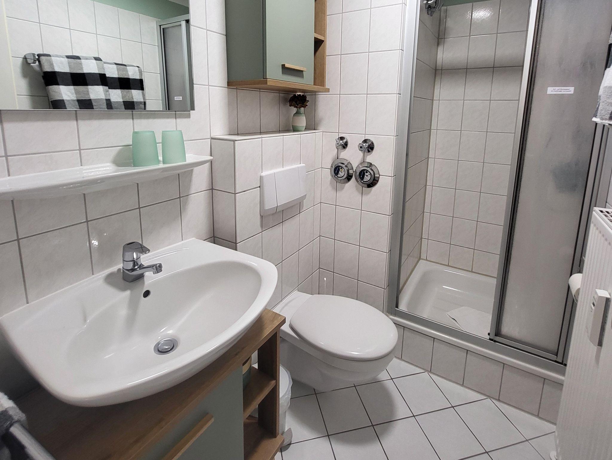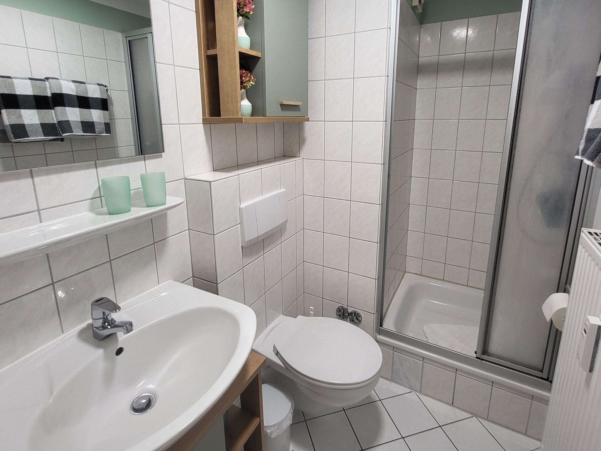Die zwei Badezimmer sind jeweils mit Dusche und WC ausgestattet und liegen je auf einer Etage. Zur Wohnung gehört ein eigener Parkplatz direkt vor der Eingangstür.