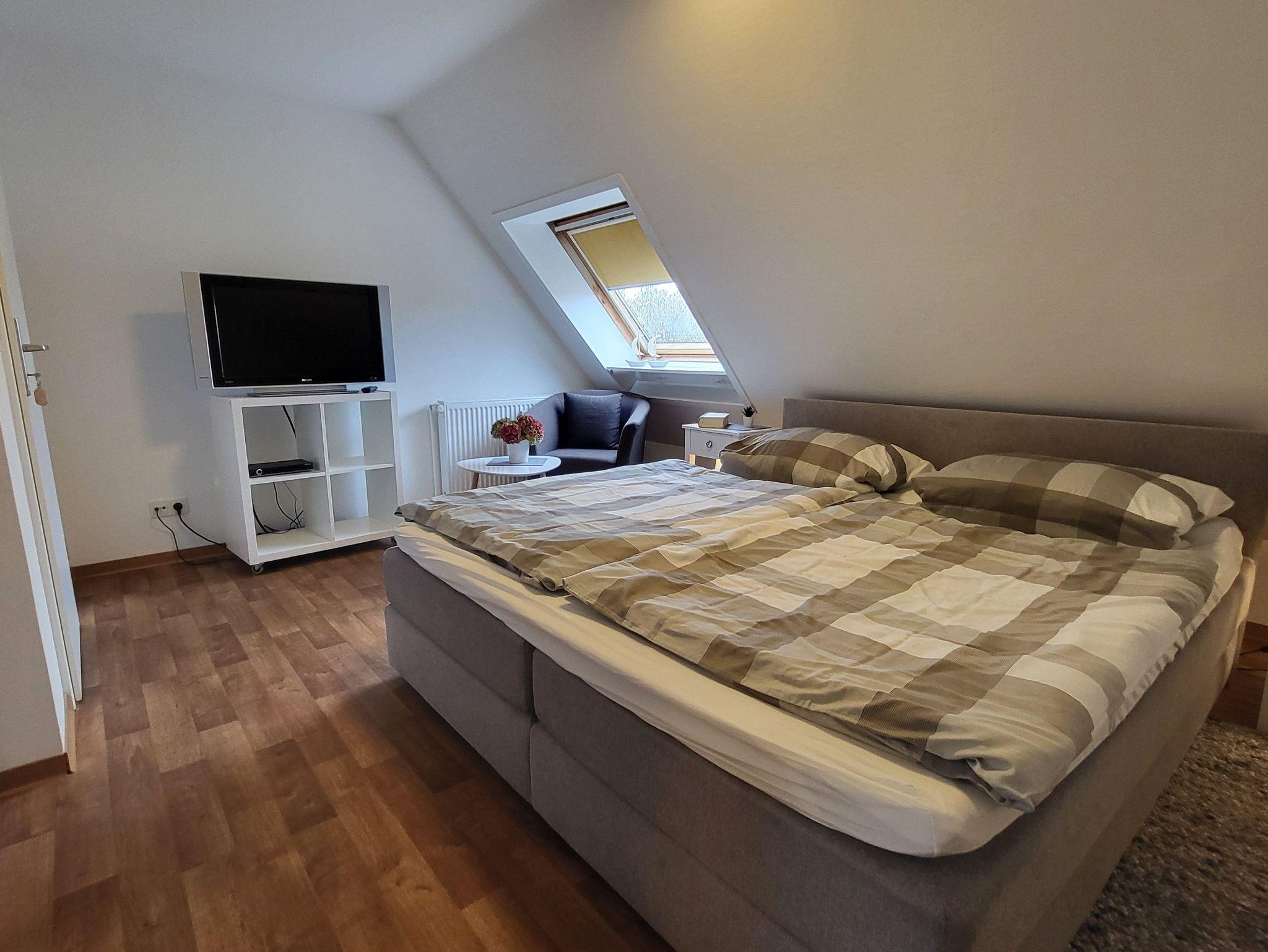 Das Appartement verfügt über drei separate Schlafzimmer: Ein Schlafzimmer mit Boxspring-Doppelbett und einer durchgehenden Liegefläche (Topper) von 180 x 200 cm mit Kabel-TV, ein weiteres Schlafzimmer mit zwei getrennten Boxspringbetten und Kabel-TV sowie DVD-Player, im dritten Schlafzimmer ein Bett mit Matratze und herausziehbarem Lattenrost.