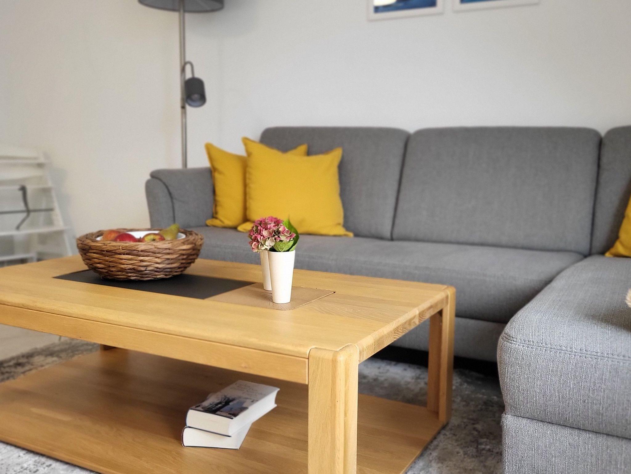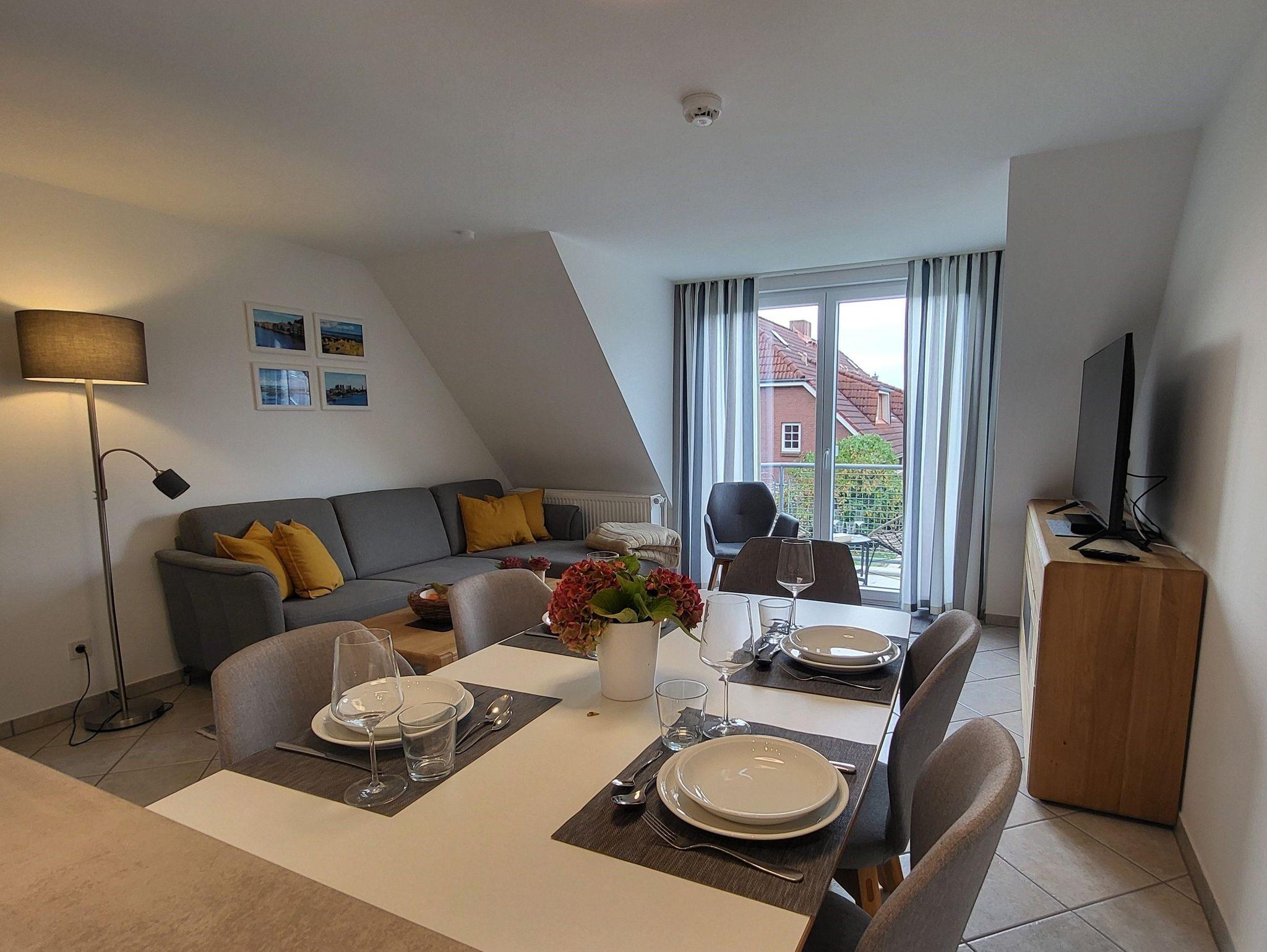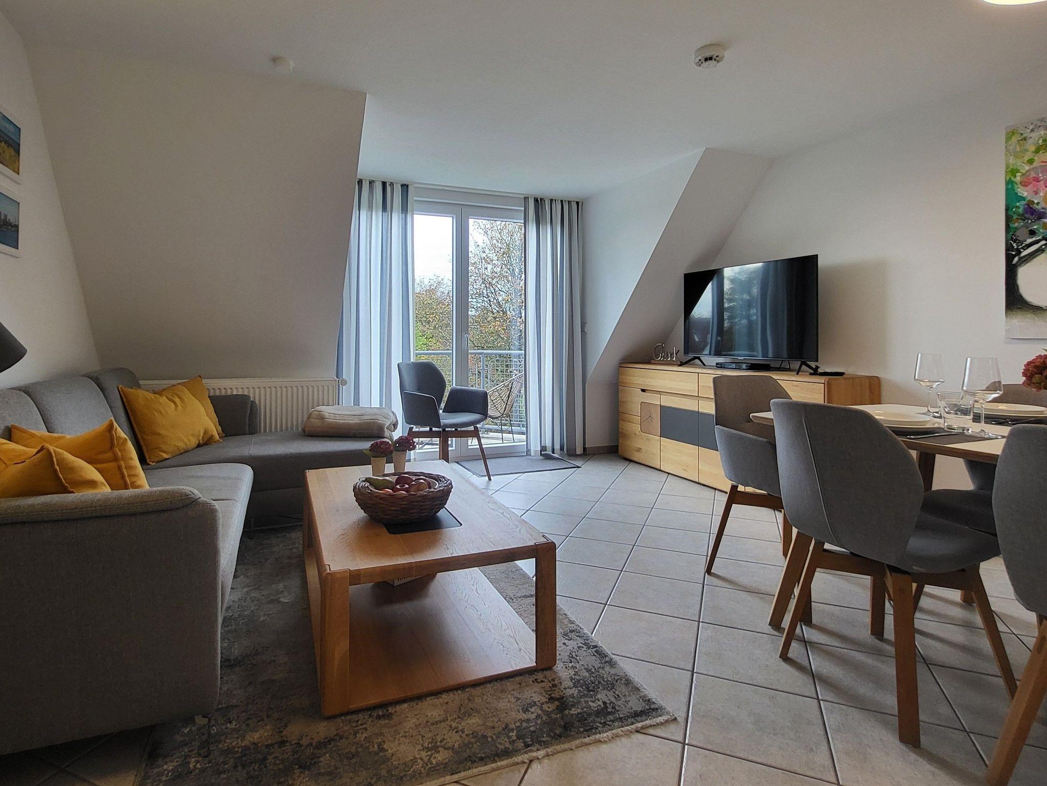 Das Wohnzimmer mit Smart-TV und Blu-ray-Player hat eine bequeme Couch, einen separaten Essplatz und einen Zugang zum Süd-West-Balkon.