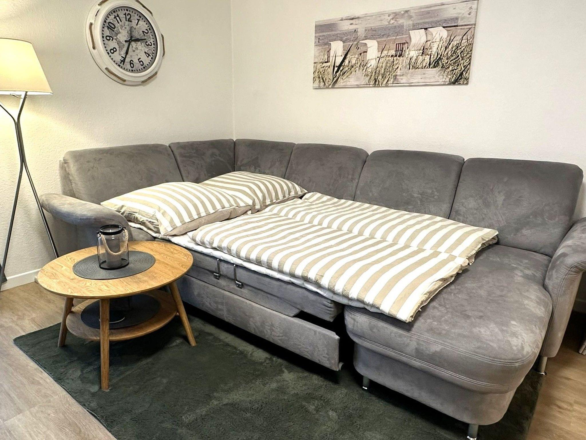 Das WOHNZIMMER ist mit einer bequemen Doppelbettcouch und einem Essplatz mit vier Stühlen ausgestattet. Die voll ausgestattete integrierte KÜCHE lässt keine Wünsche offen. Ein Geschirrspüler ist genauso selbstverständlich wie ein Kühlschrank mit Gefrierfach, Backofen, Mikrowelle, Kaffeemaschine, eine zusätzliche Senseo-Kaffeemaschine, Wasserkocher und Toaster.