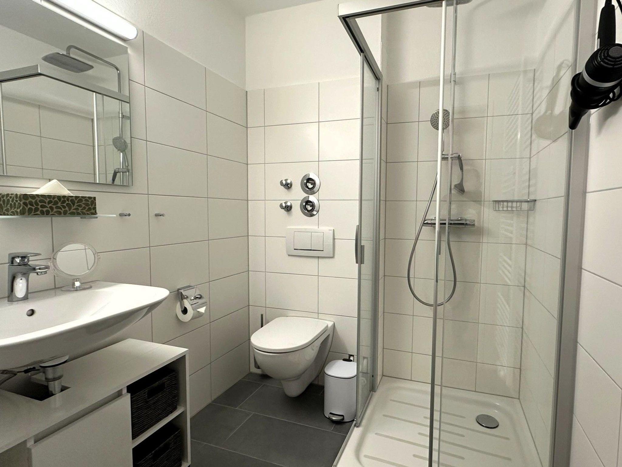 Das neue Badezimmer mit Dusche/WC ist modern gestaltet, ein Föhn ist vorhanden. Das im Haus befindliche SCHWIMMBAD mit Gegenstromanlage und Tageslicht sowie die finnische SAUNA können Sie selbstverständlich kostenlos nutzen.