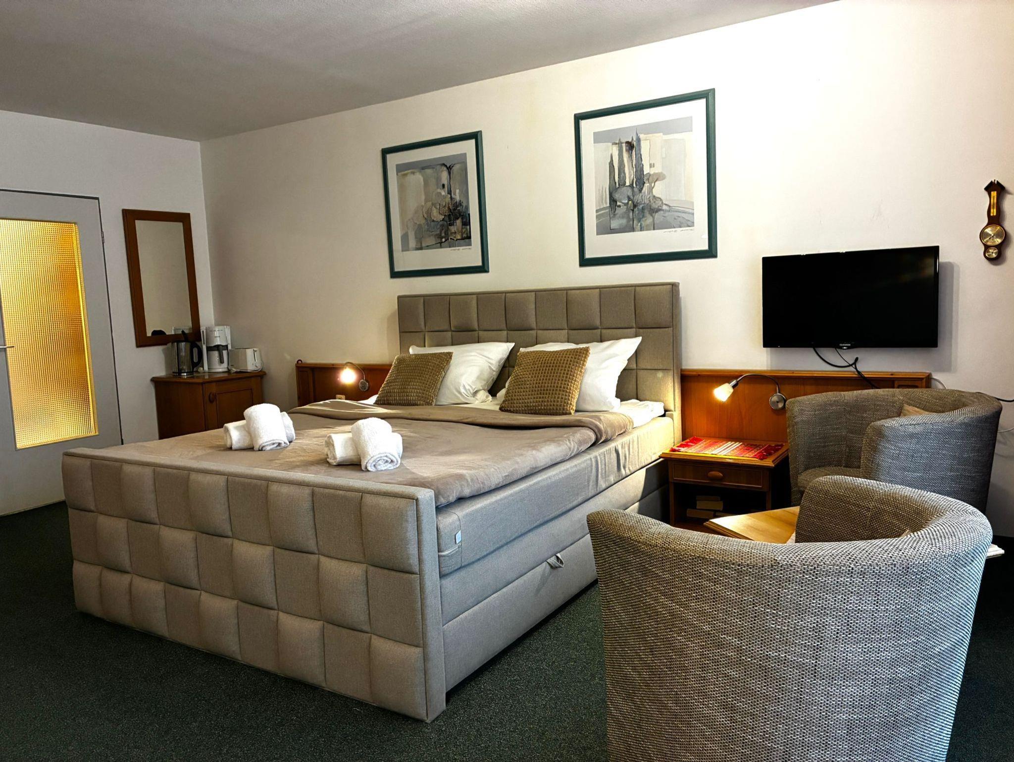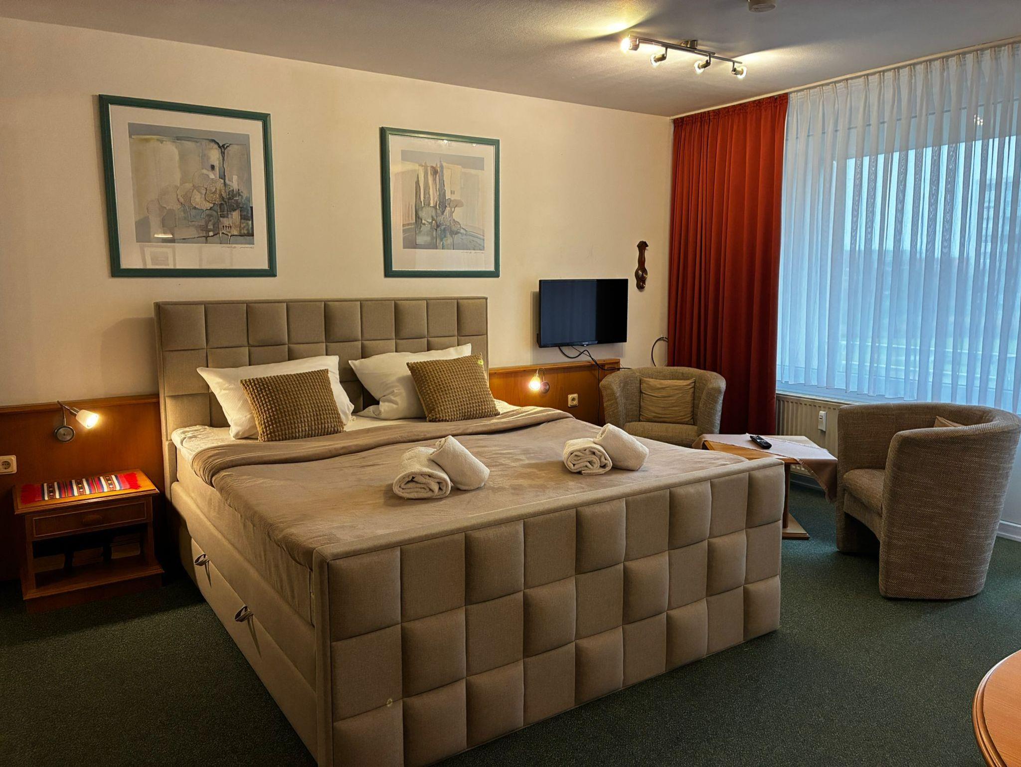 Sie wohnen in einem 1-Zimmer-Appartement für bis zu 2 Personen im 2. OG auf ca.34 m² Wohnfläche. Ein Wohn-/Schlafraum mit Doppelbett (210 cm), separater Essplatz und voll ausgestattete Pantryküche: 2-Platten-Ceranfeld, Mikrowelle, Dusche/WC, Kabel-TV, Hifi-CD-Stereoanlage, Ostbalkon (Morgensonne), ruhige Innenhofanlage, WLAN kostenlos, großer Garten mit Spielplatz, Strandkörben, Sitzbänken, Kegelbahn,Tiefgarageneinstellplatz.