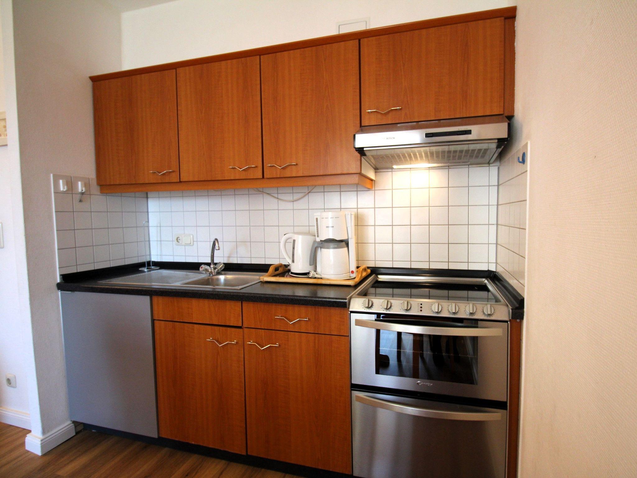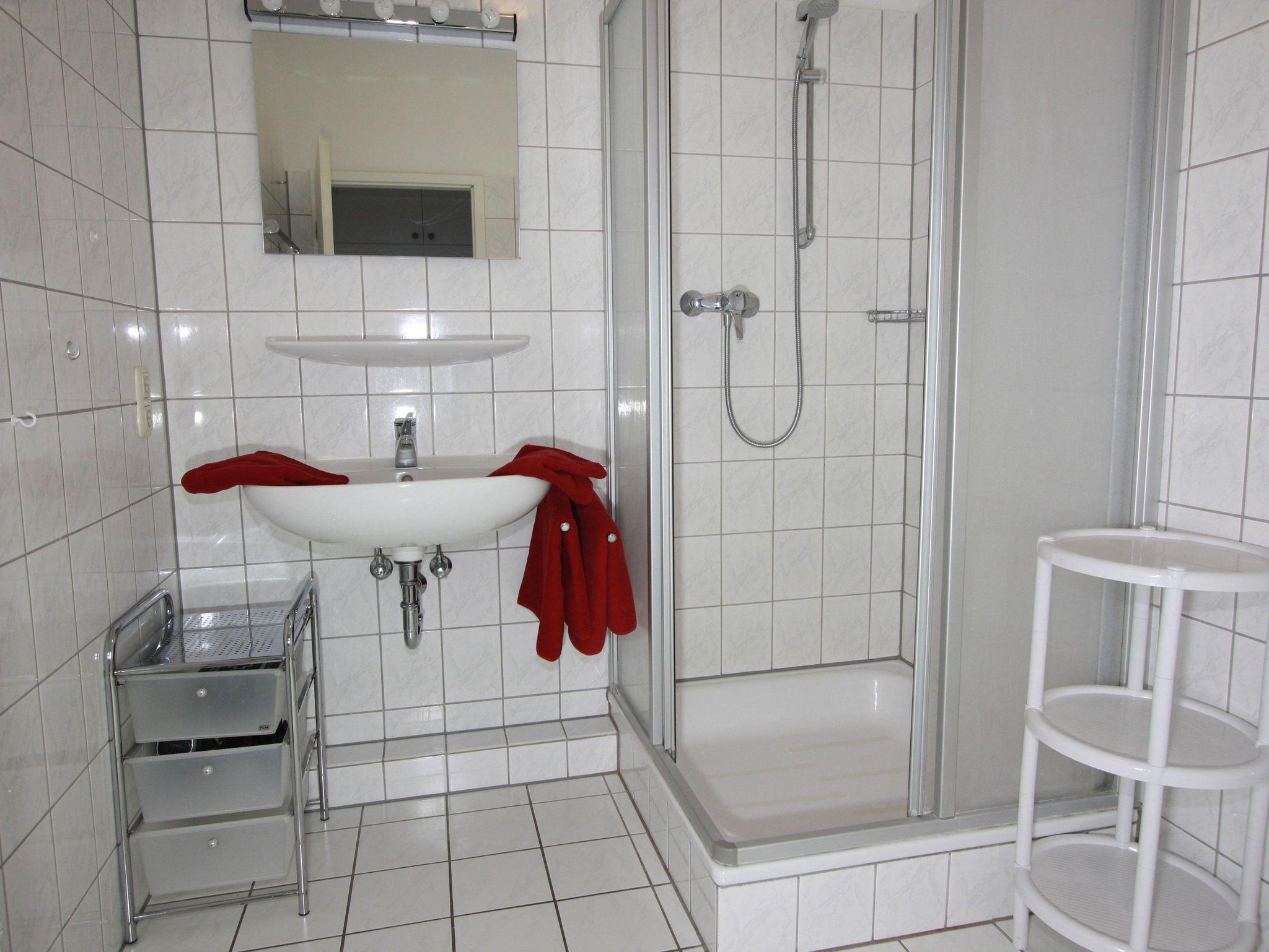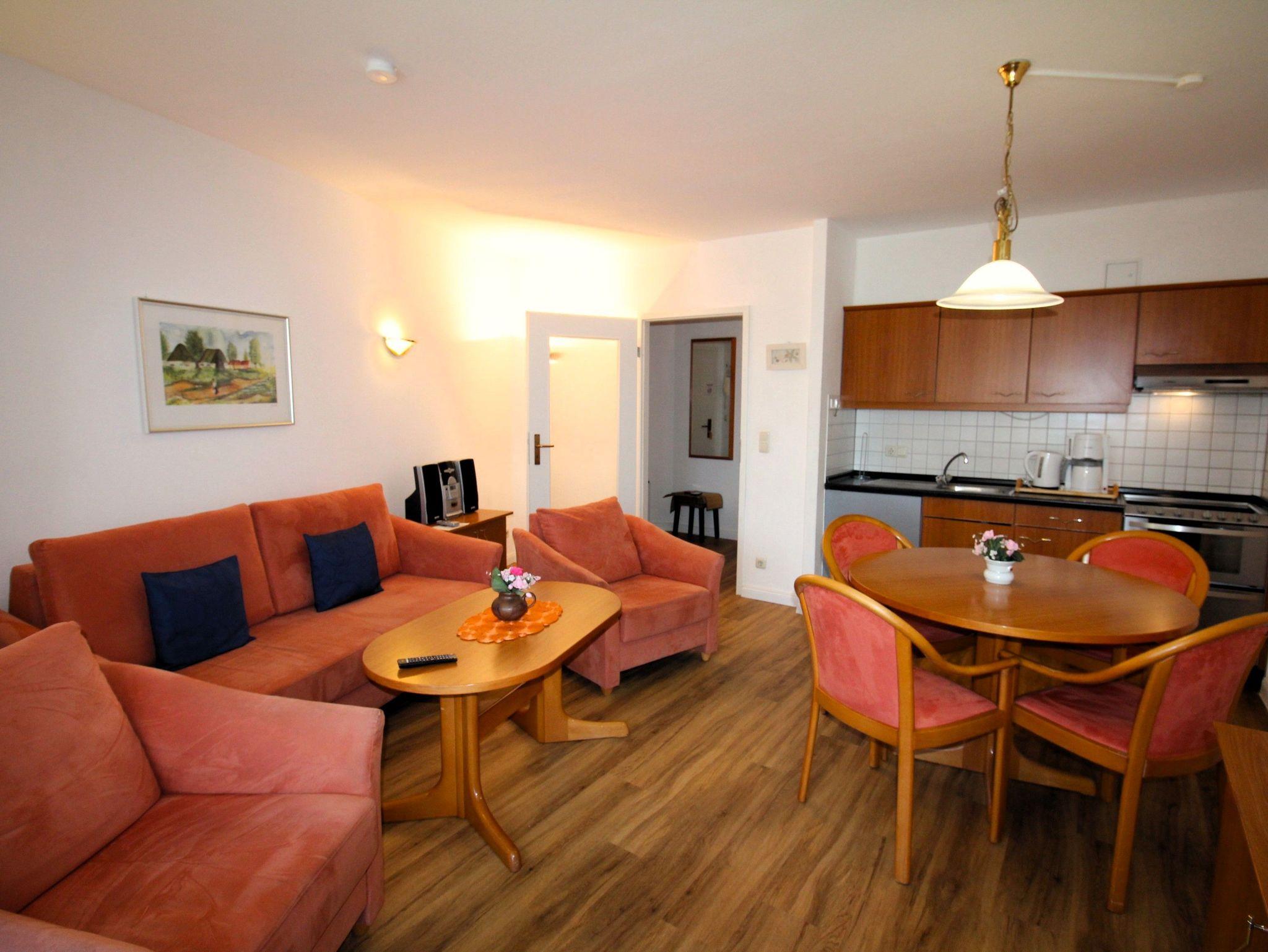 Sie wohnen in einem 2-Zimmer-Appartement für bis zu 4 Personen auf 51 m² Wohnfläche im 1. Obergeschoss. Ein Schlafzimmer mit Doppelbett, Wohn-/Schlafraum mit bequemer Doppelbettcouch, separater Essplatz, voll ausgestatteter Küchenbereich mit Geschirrspüler und Backofen, Dusche/WC mit Föhn, Balkon, SAT-TV, HiFi-Anlage mit CD-Wechsler und Telefon. PKW-Einstellplatz in einer Einzelgarage mit einer Einfahrtshöhe von 2,00 m.