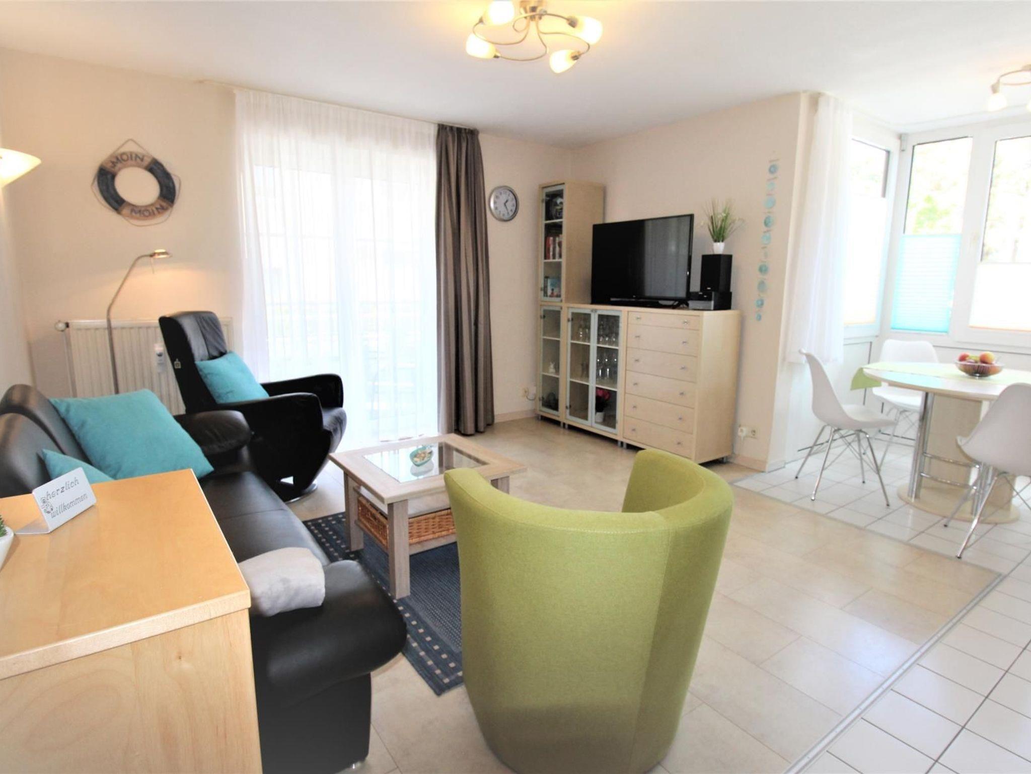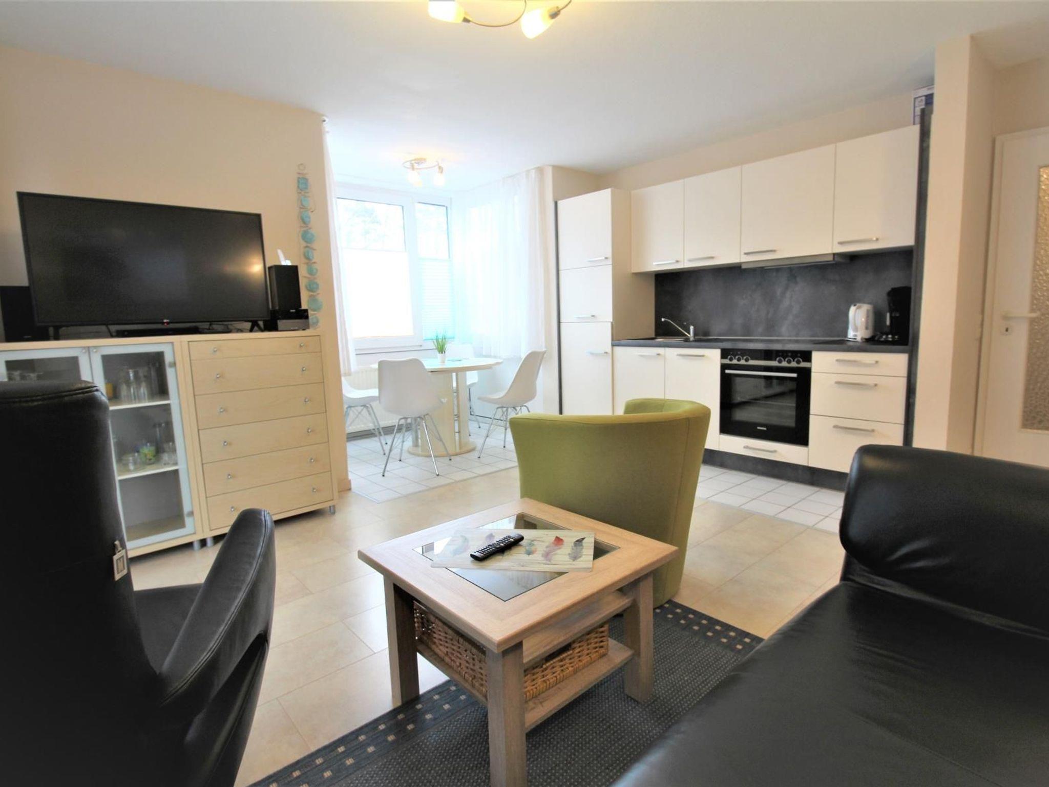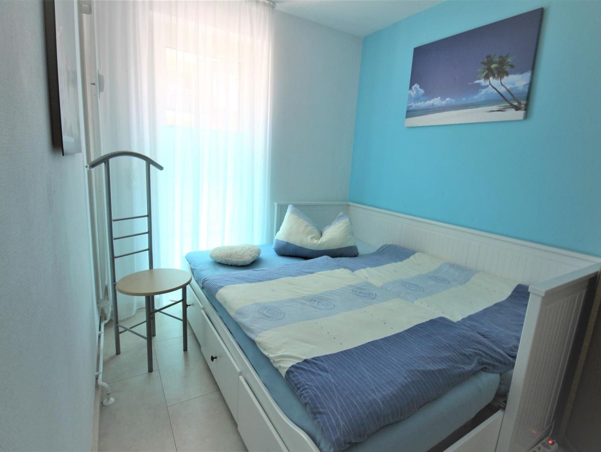 3-Zimmer-Appartement für bis zu 4 Personen auf ca. 50-55 m². Zwei Schlafzimmer mit Doppel-/Einzel- oder Etagenbetten. Wohnraum mit Couch, TV, separatem Essplatz im Erker und voll ausgestattetem Küchenbereich. Balkon. Bad mit Dusche/WC. WLAN und PKW-Stellplatz vorhanden.