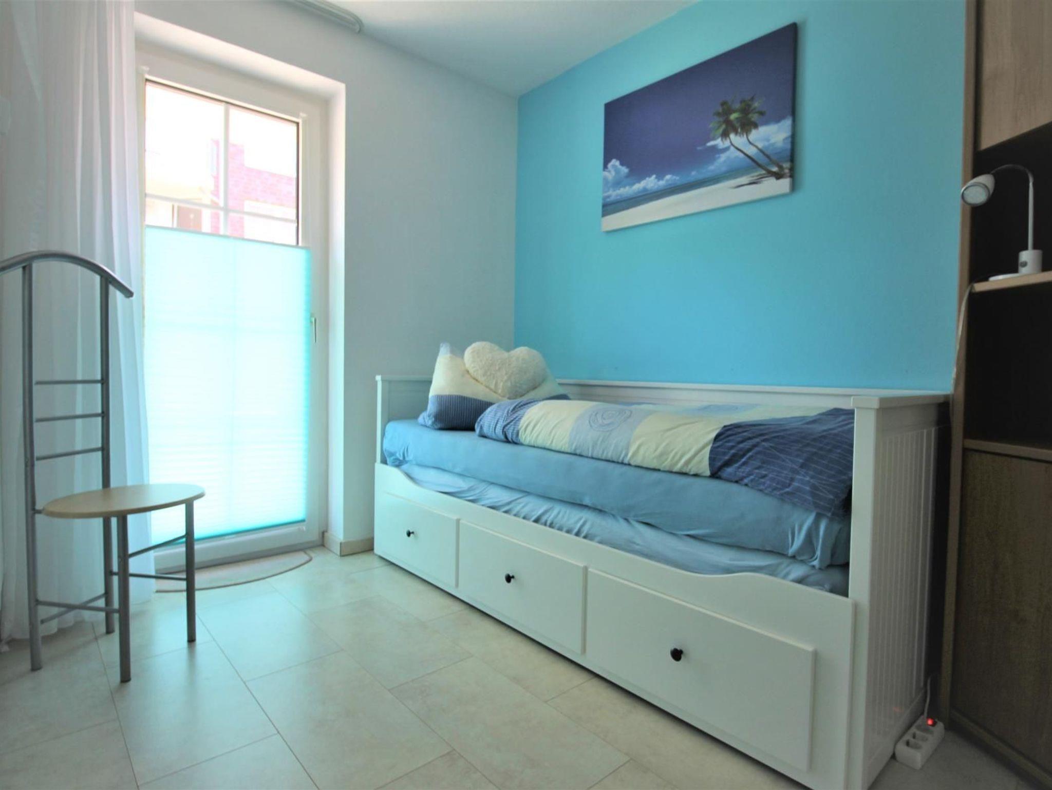 Der zweite Schlafraum ist mit einem 200 cm langen Ausziehbett und einem kleinen Kleiderschrank