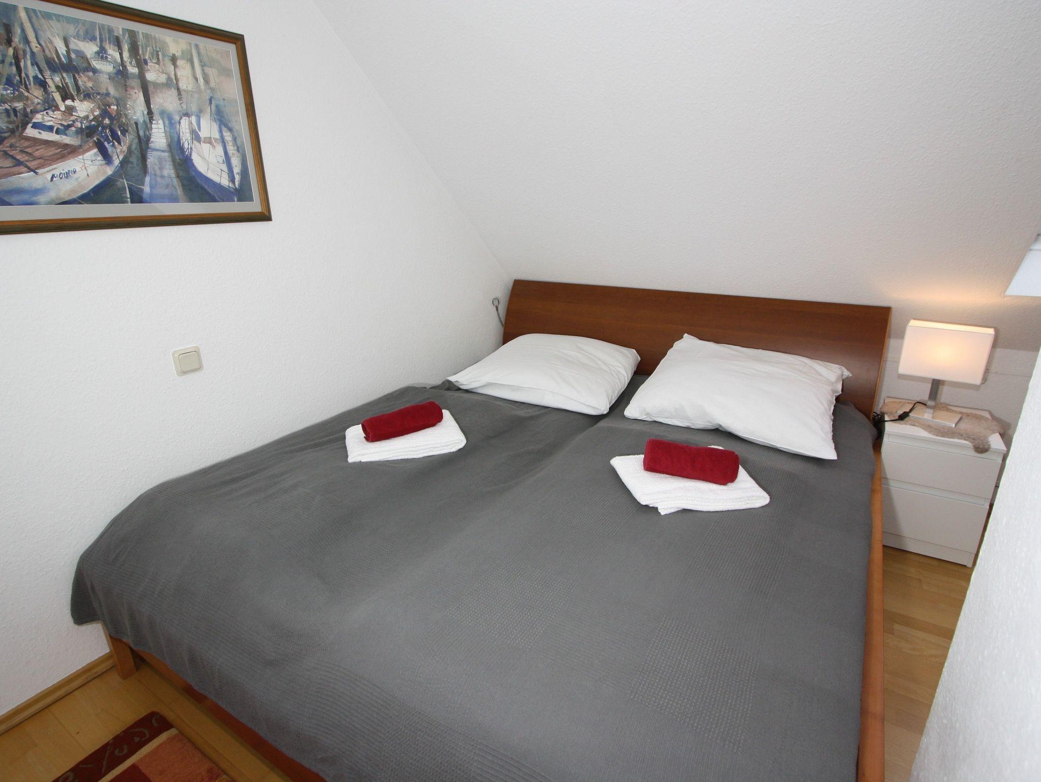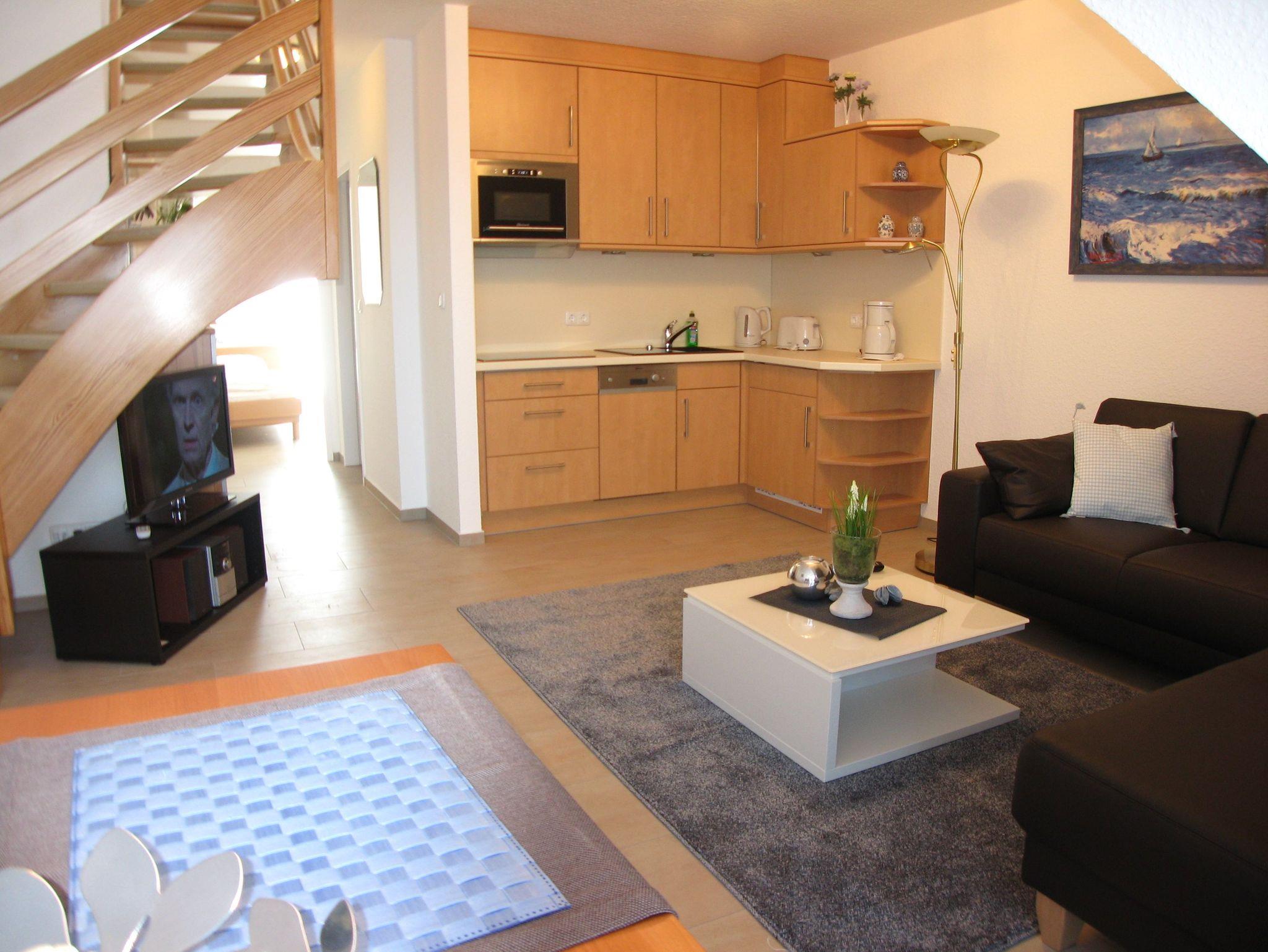 Sie verfügt über zwei separate Schlafzimmer. Ein Schlafzimmer mit zwei getrennt stehenden Einzelbetten, sowie ein Schlafzimmer mit Doppelbett im gemütlichen Dachgeschoss. Im offenen Wohnraum befindet sich eine bequeme Couchgarnitur mit Blick auf einen Flachbild-TV. Zudem steht Ihnen ein kostenloser Internetzugang unbegrenzt zur Verfügung.
