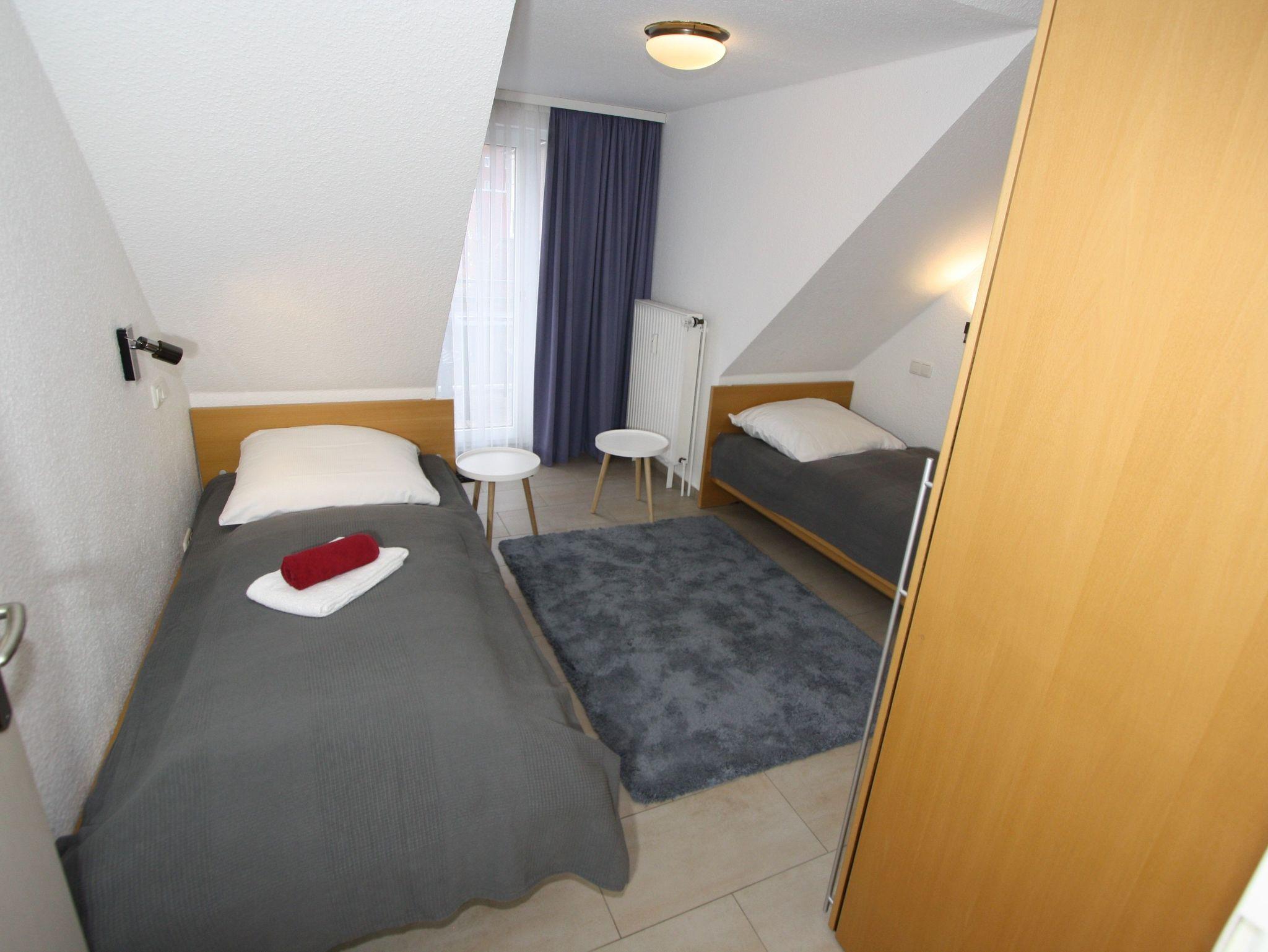 3-Zimmer-Appartement für bis zu 4 Personen auf ca. 5 m². Zwei Schlafzimmer mit Doppelbett bzw. Einzelbetten, Wohnraum mit Couch, TV, separatem Essplatz, voll ausgestattetem Küchenbereich, Balkon, Bad mit Dusche/WC. WLAN und PKW-Stellplatz vorhanden.