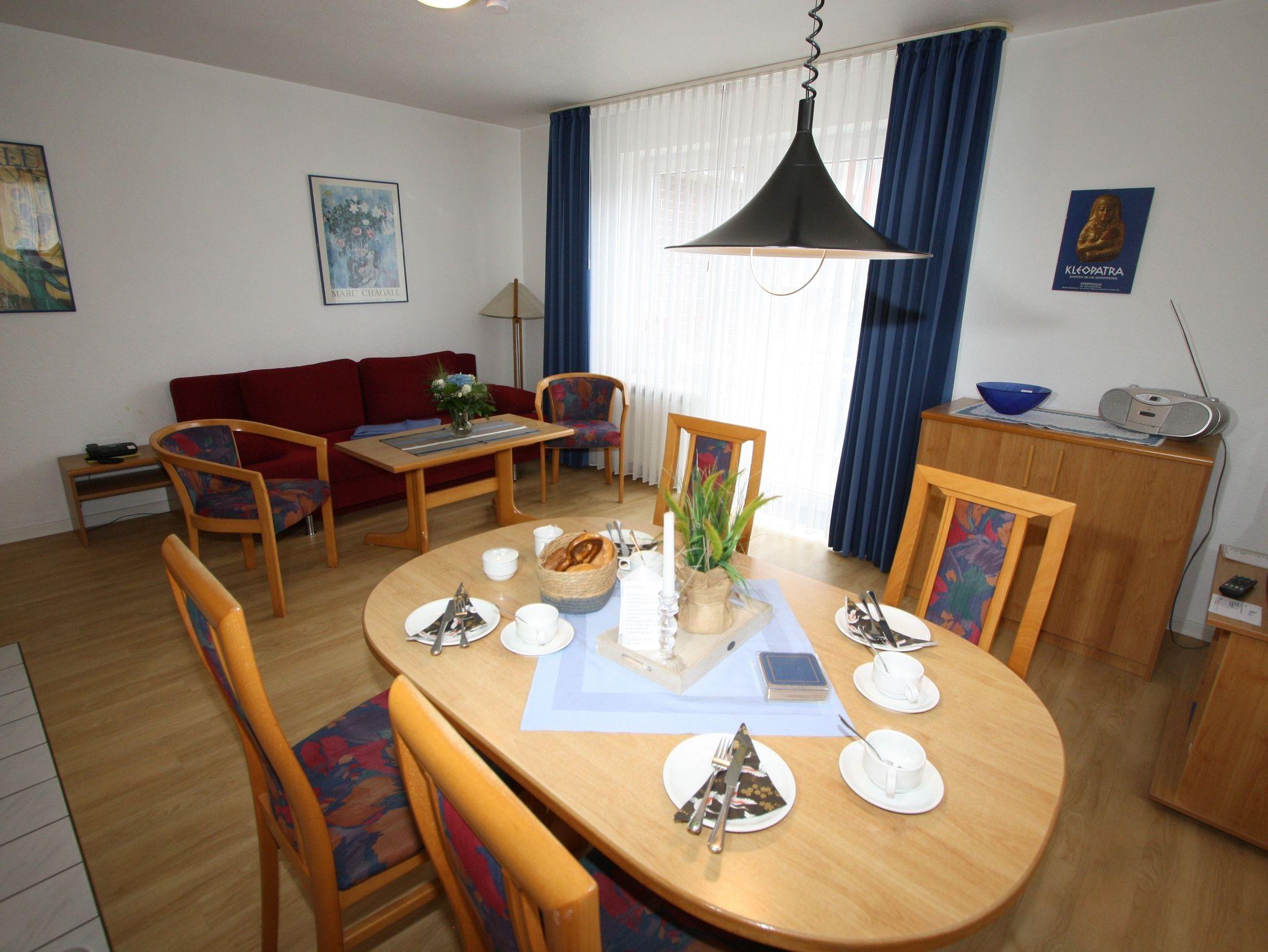 Bei der Sitzgruppe im Wohnzimmer können Sie die Couch bei Bedarf zu einem Doppelbett ausziehen. Digital-SAT-TV und Telefon (für Sie innerhalb Deutschlands kostenlos) sind selbstverständlich vorhanden. Der große Esstisch wird vielleicht zum Mittelpunkt.