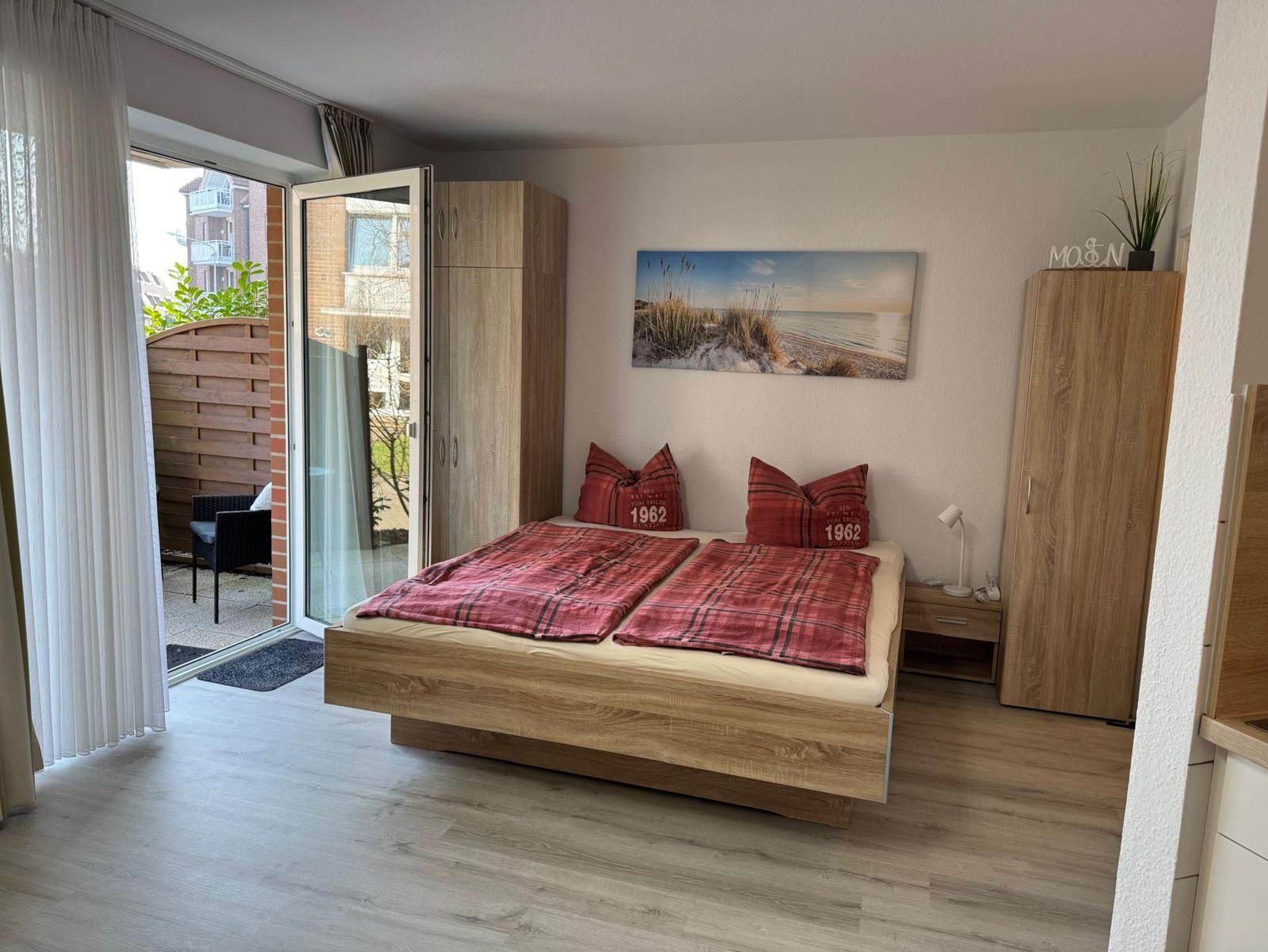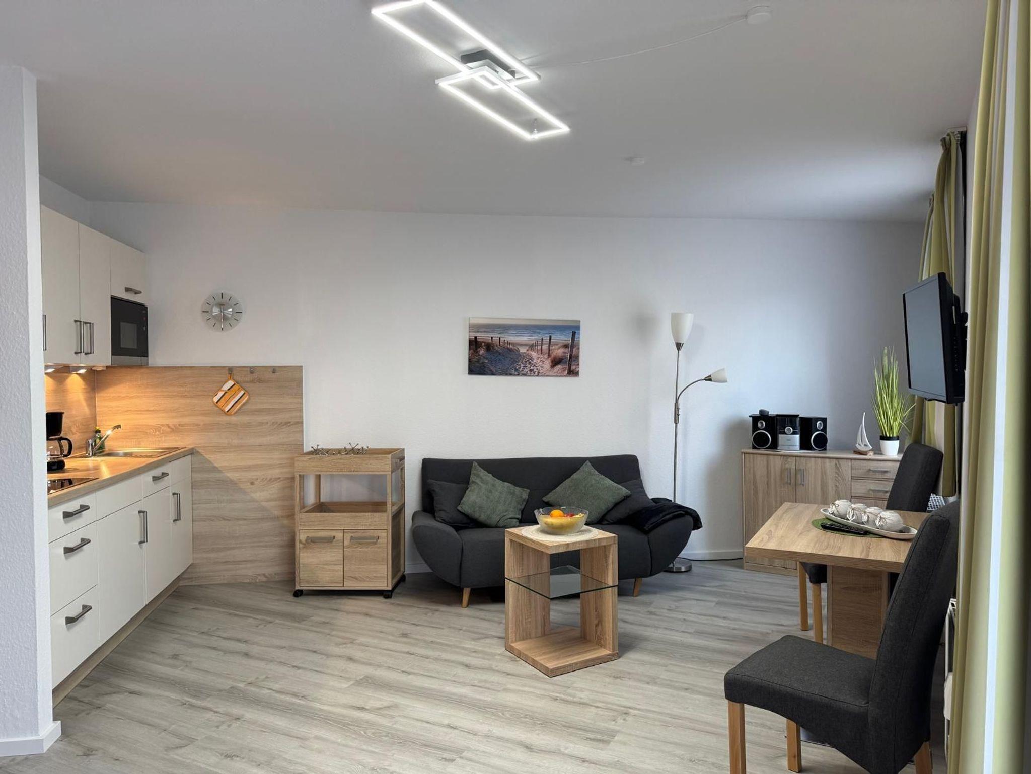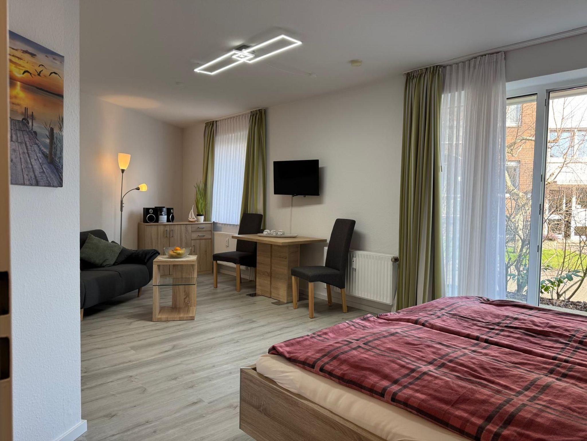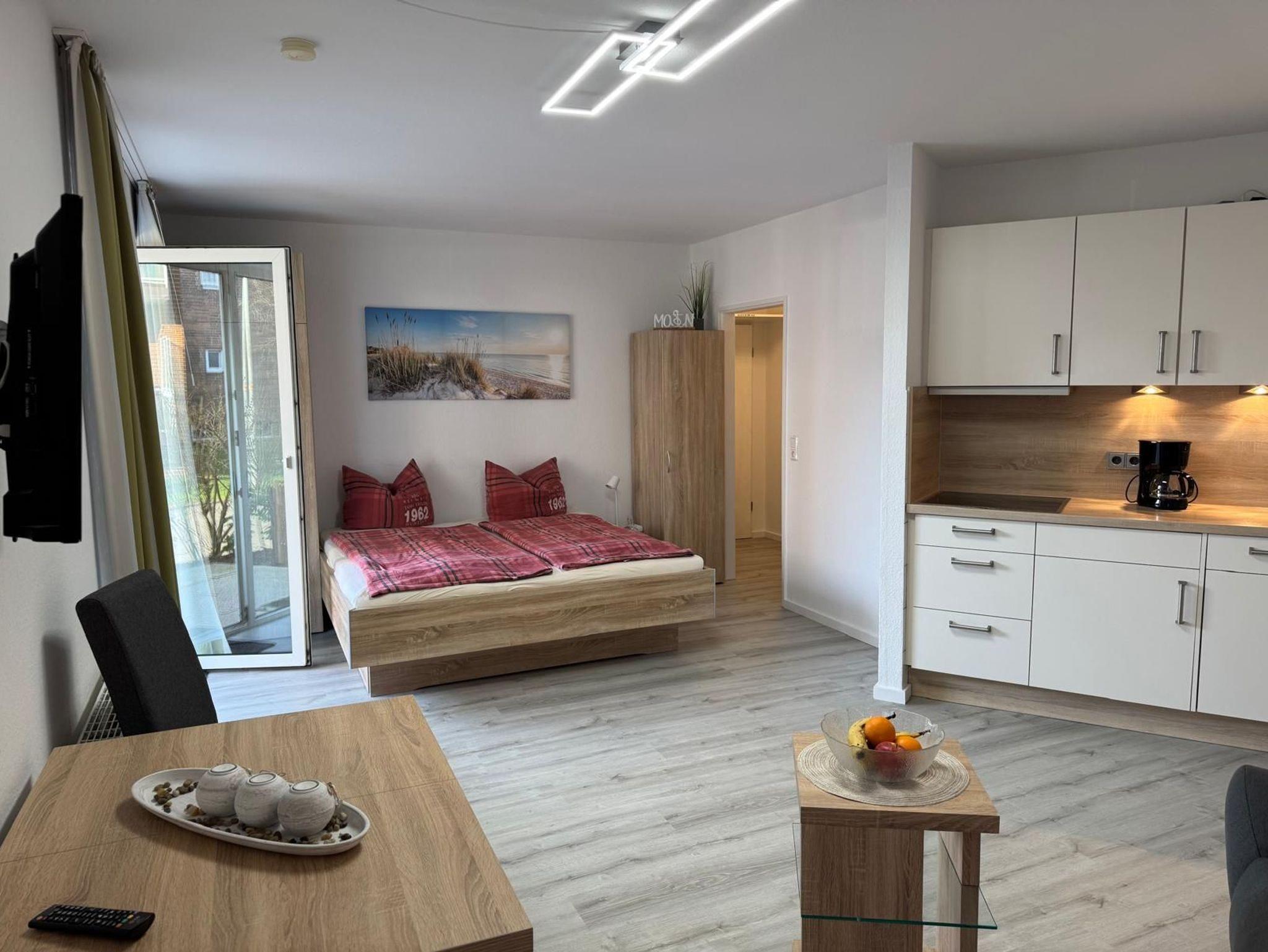 1-Zimmer-Appartement für 1-2 Personen auf ca. 35 m². Wohn-Schlafraum mit Doppelbett und Couch, TV, separatem Essplatz, Küchenbereich, Balkon oder Terrasse, Bad mit Dusche/WC. PKW-Stellplatz vorhanden.