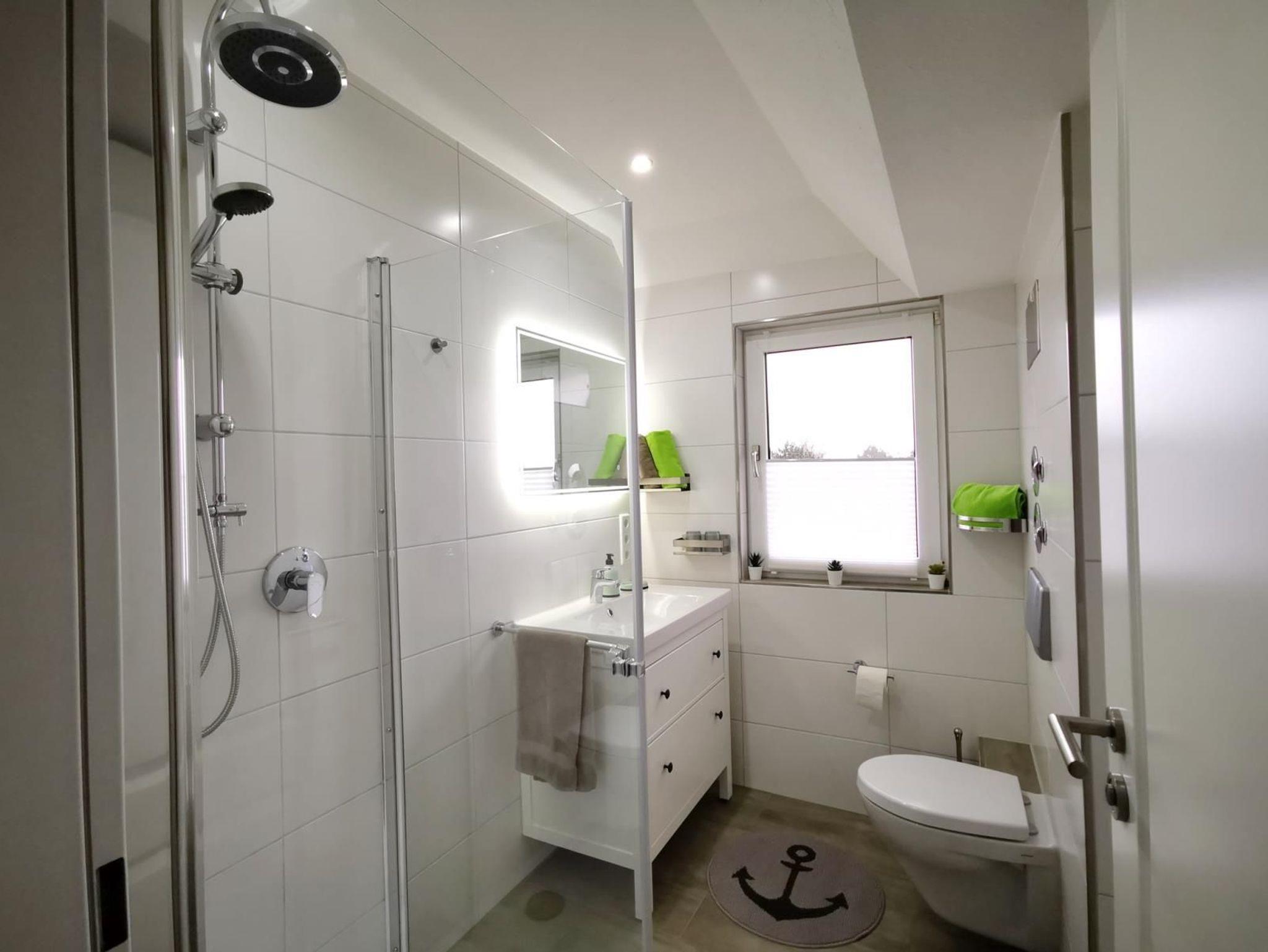 Das helle Tageslichtbad verfügt über eine großzügige Dusche mit niedrigem Einstieg und bietet genügend Stauraum. Ein Föhn ist vorhanden.