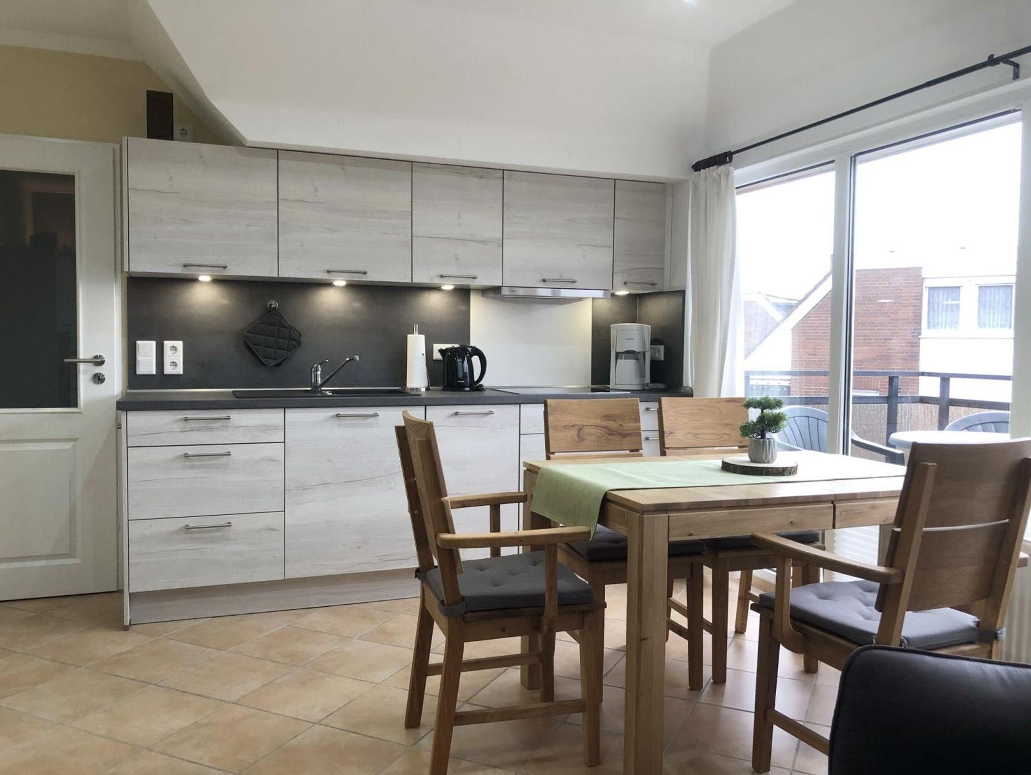 Die 2-Zimmer-Wohnungbefindet sich in der obersten Etage (3. Stockwerk), die Sie bequem mit dem Fahrstuhl erreichen. Durch den kleinen Eingangsbereich gelangen Sie in das lichtdurchflutete Wohn-/Esszimmer. Dieses ist eingerichtet mit einer hellen, komplett ausgestatteten komfortablen Einbauküche mit Geschirrspüler, großem Kühl-/Gefrierschrank, Backofen, E-Herd mit Ceranfeld sowie einer Mikrowelle. Zur Ausstattung gehören zusätzlich eine Filter-Kaffeemaschine, eine Senseo-Kaffeemaschine, Milchaufschäumer, Wasserkocher, Toaster sowie ein Eierkocher.