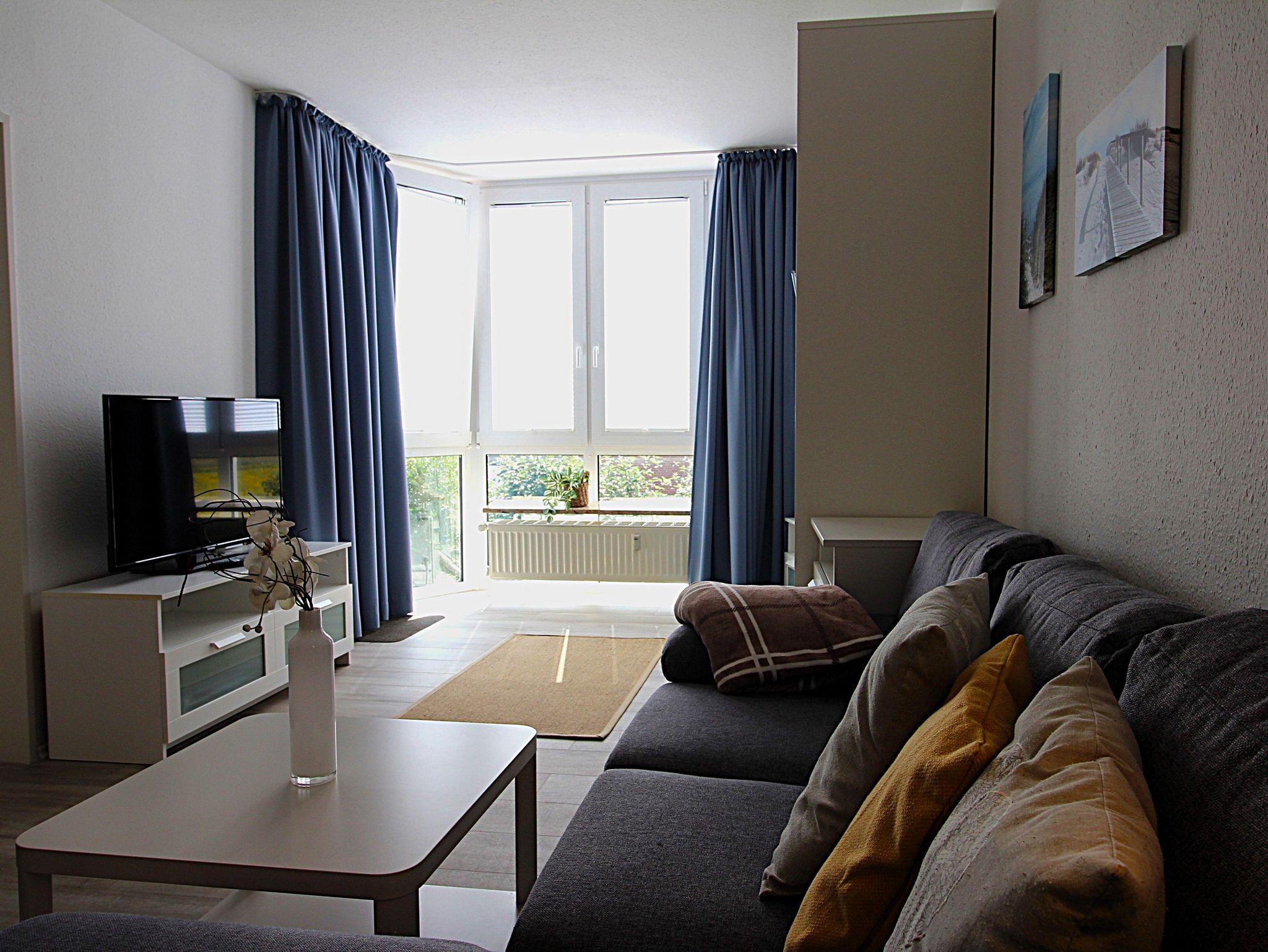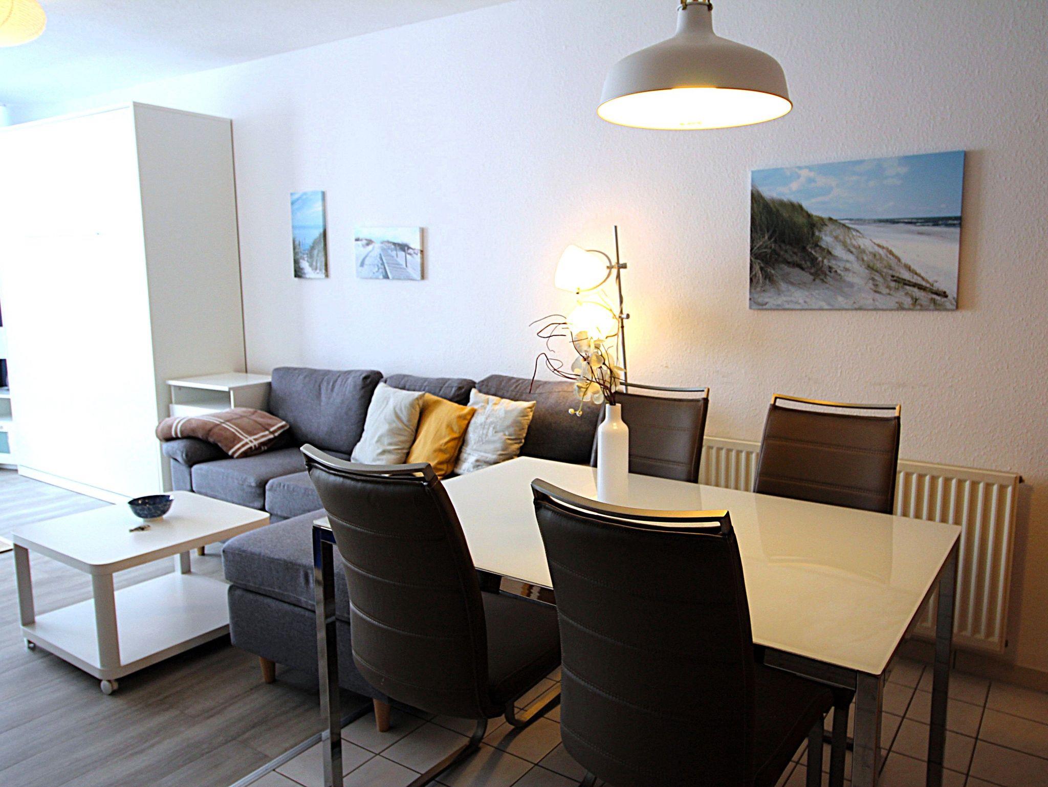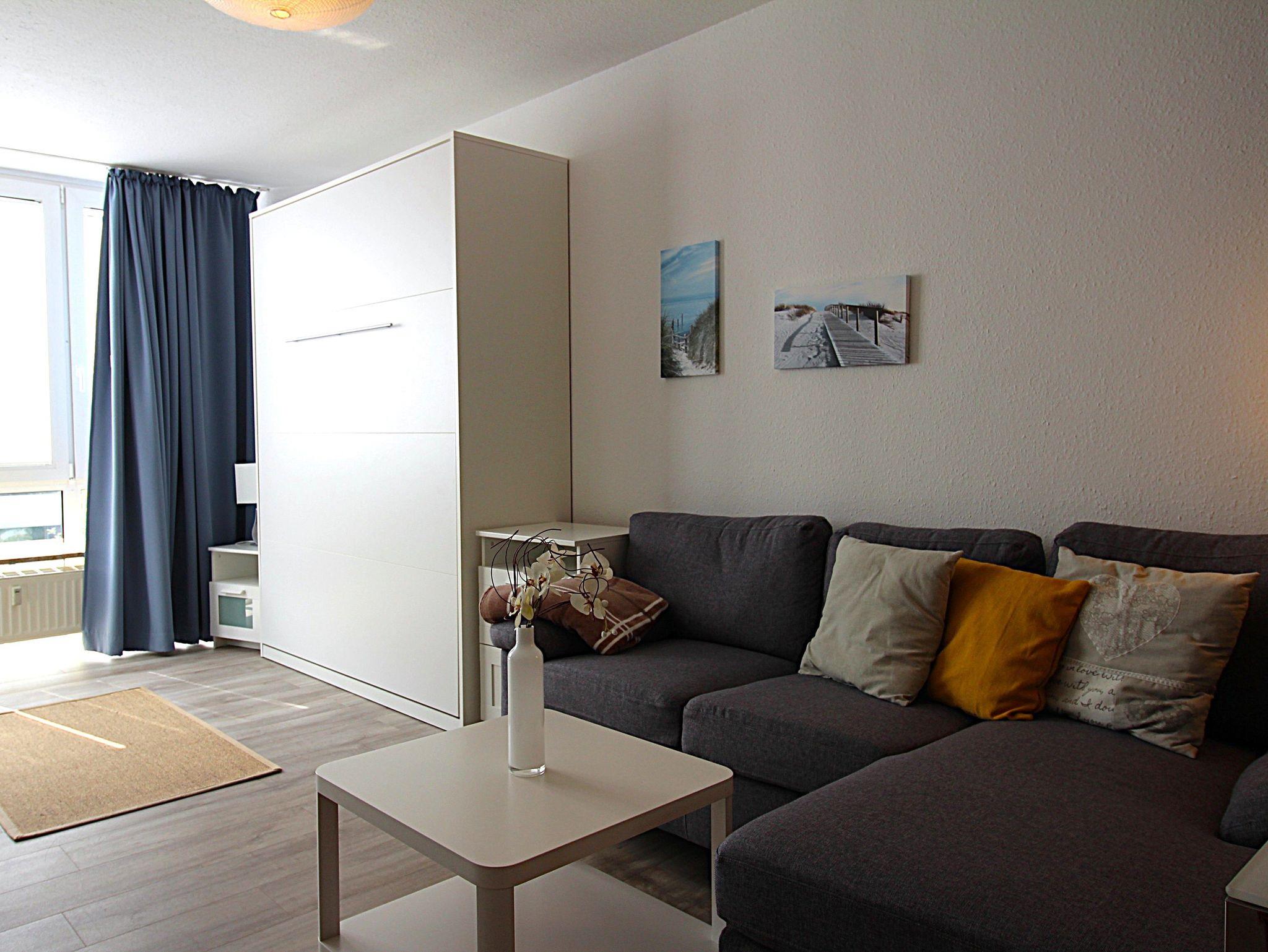 Die Wohnung für bis zu 4 Personen ist gepflegt und ansprechend eingerichtet. Sie ist durch große Glasfronten in Wohn-/Esszimmer und Schlafzimmer schön hell und freundlich. Ein modernes, komfortables Schrankbett für bis zu 2 Personen (Erwachsene) mit hochwertigem Lattenrost und Matratze steht im Wohnbereich. Entspannte Tage vom häufig hektischen Alltag sind hier möglich.