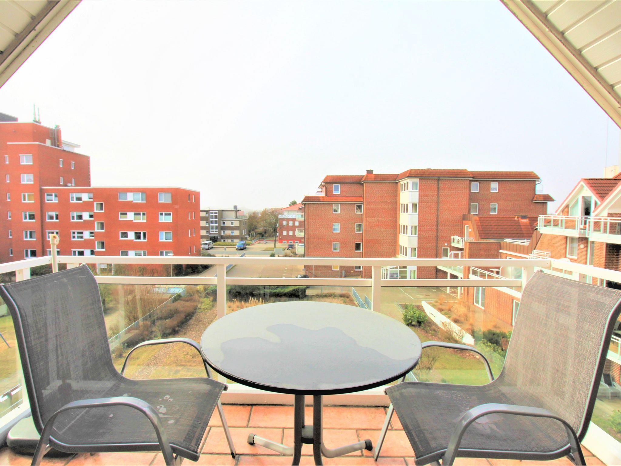Der Balkon ist mit Sitzgelegenheiten für bis zu 4 Personen und einem Tisch bestückt. Als Sonnenschutz dient ein Sonnenschirm.