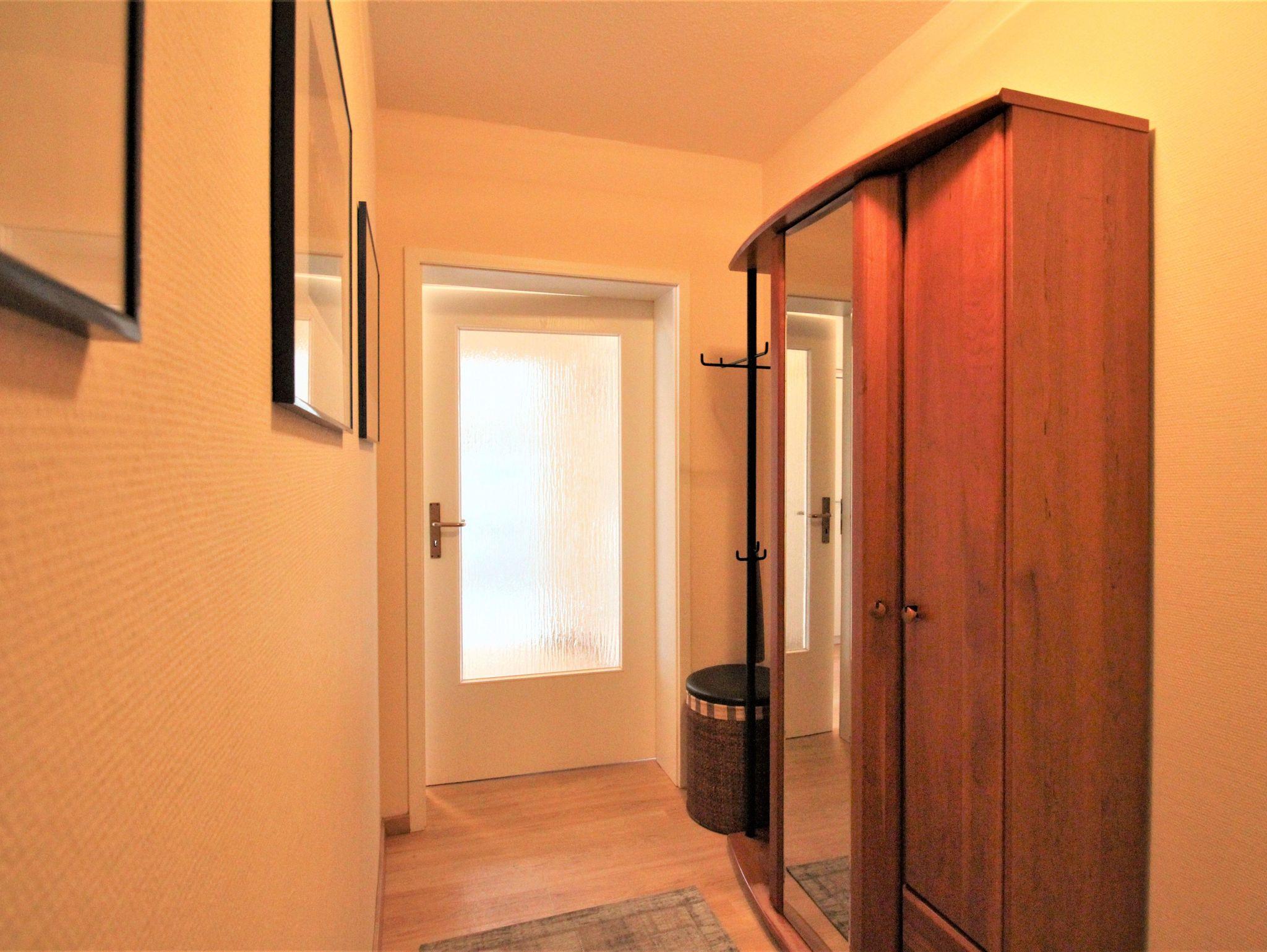 Wenn Sie die Wohnung betreten, empfängt Sie eine großzügige Diele mit einem Garderobenschrank, in dem ein Safe untergebracht ist.
