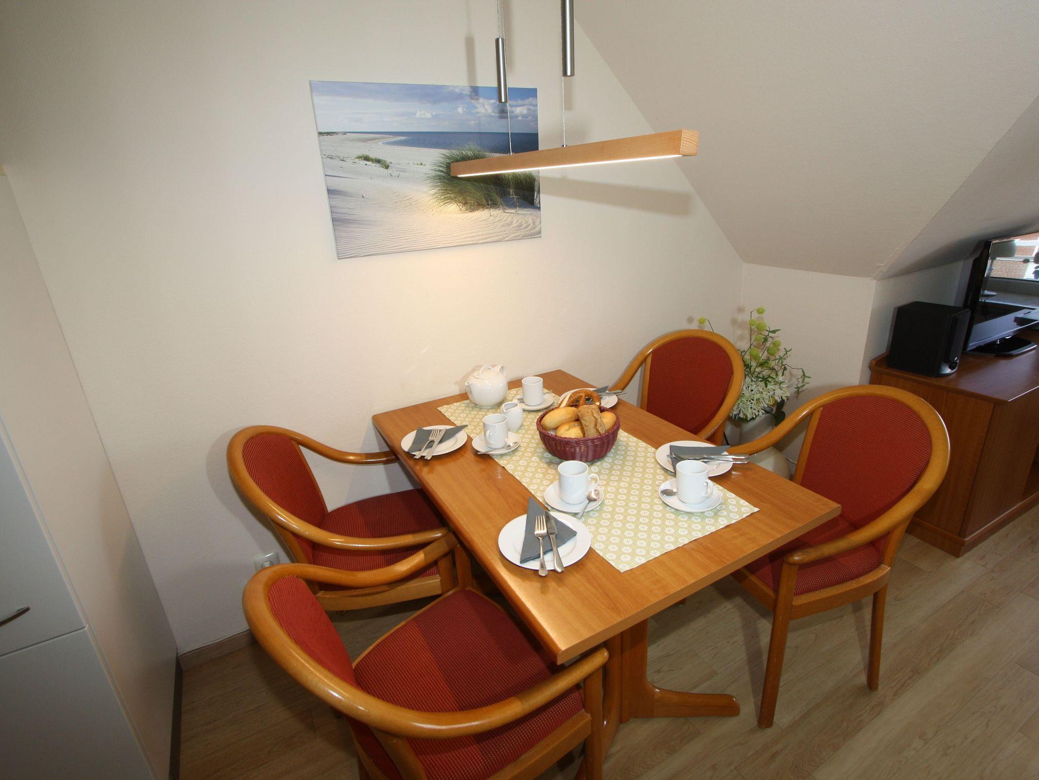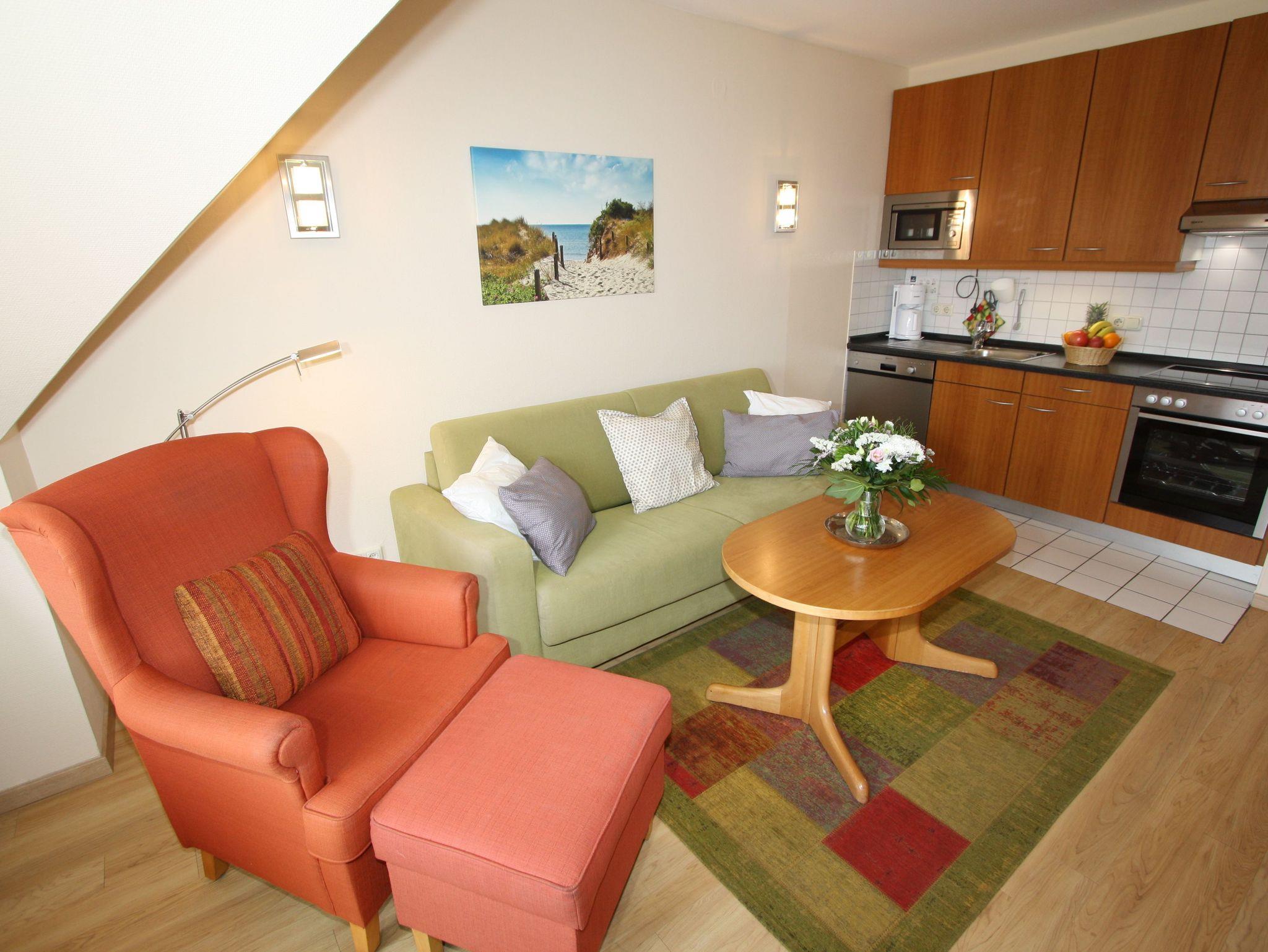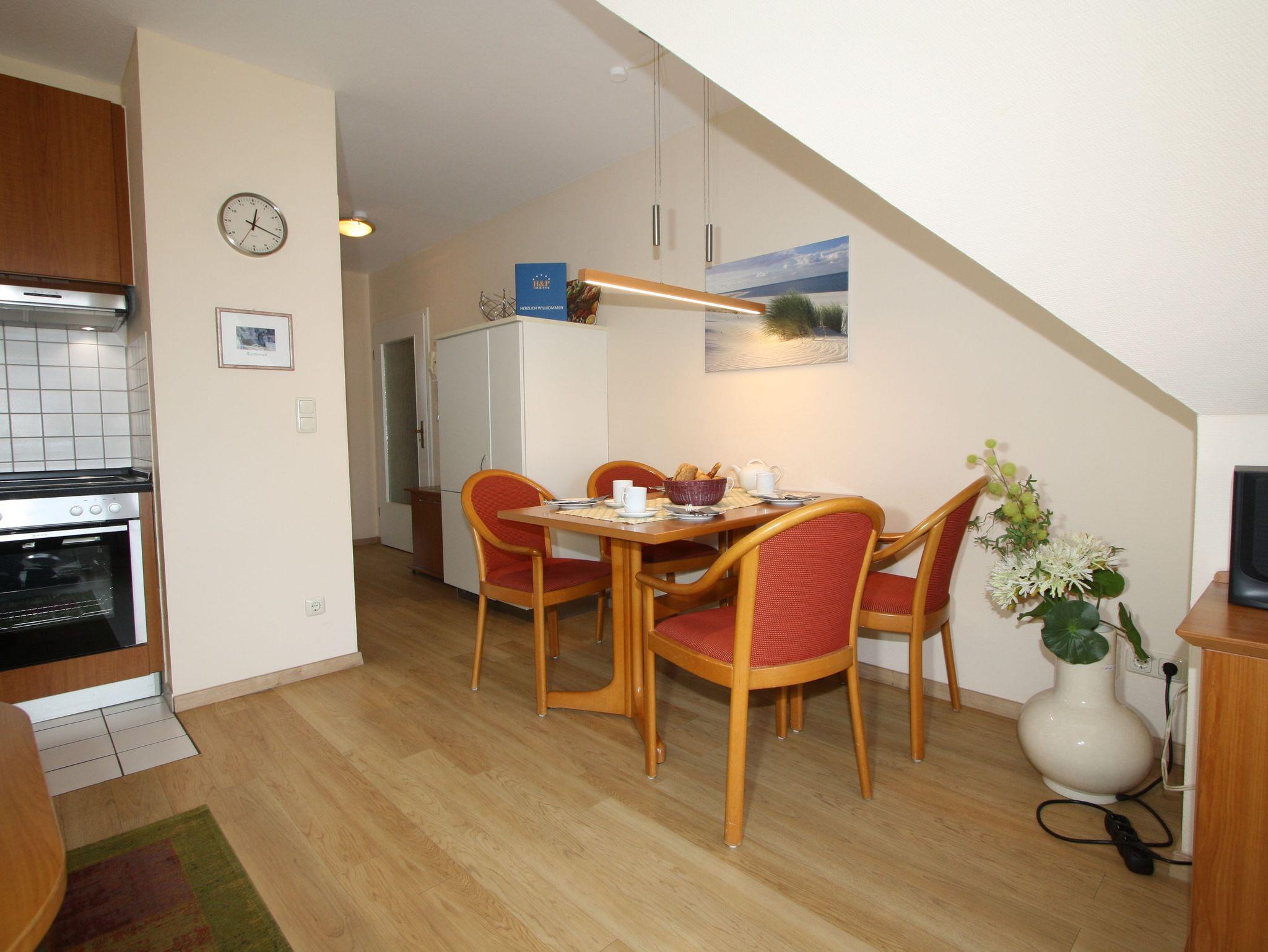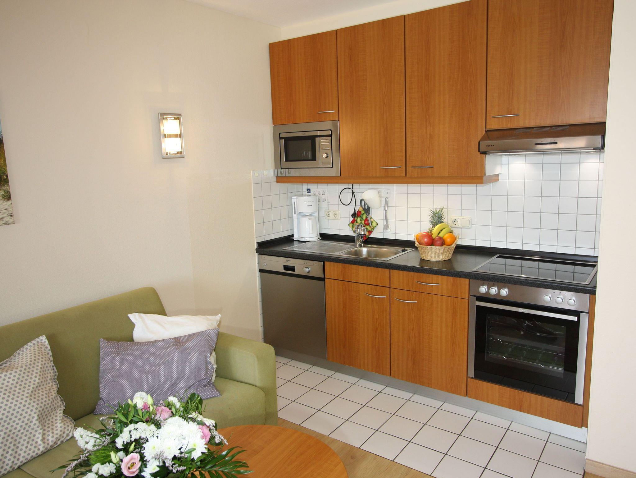 In der Küchenzeile befindet sich ein Herd, eine Mikrowelle und ein Geschirrspüler. Geschirr und Besteck sind ausreichend vorhanden, sowie ein Tchibo-Kaffeeautomat, Kaffeemaschine, Wasserkocher, Toaster, Eierkocher, Mixer und Waffeleisen.