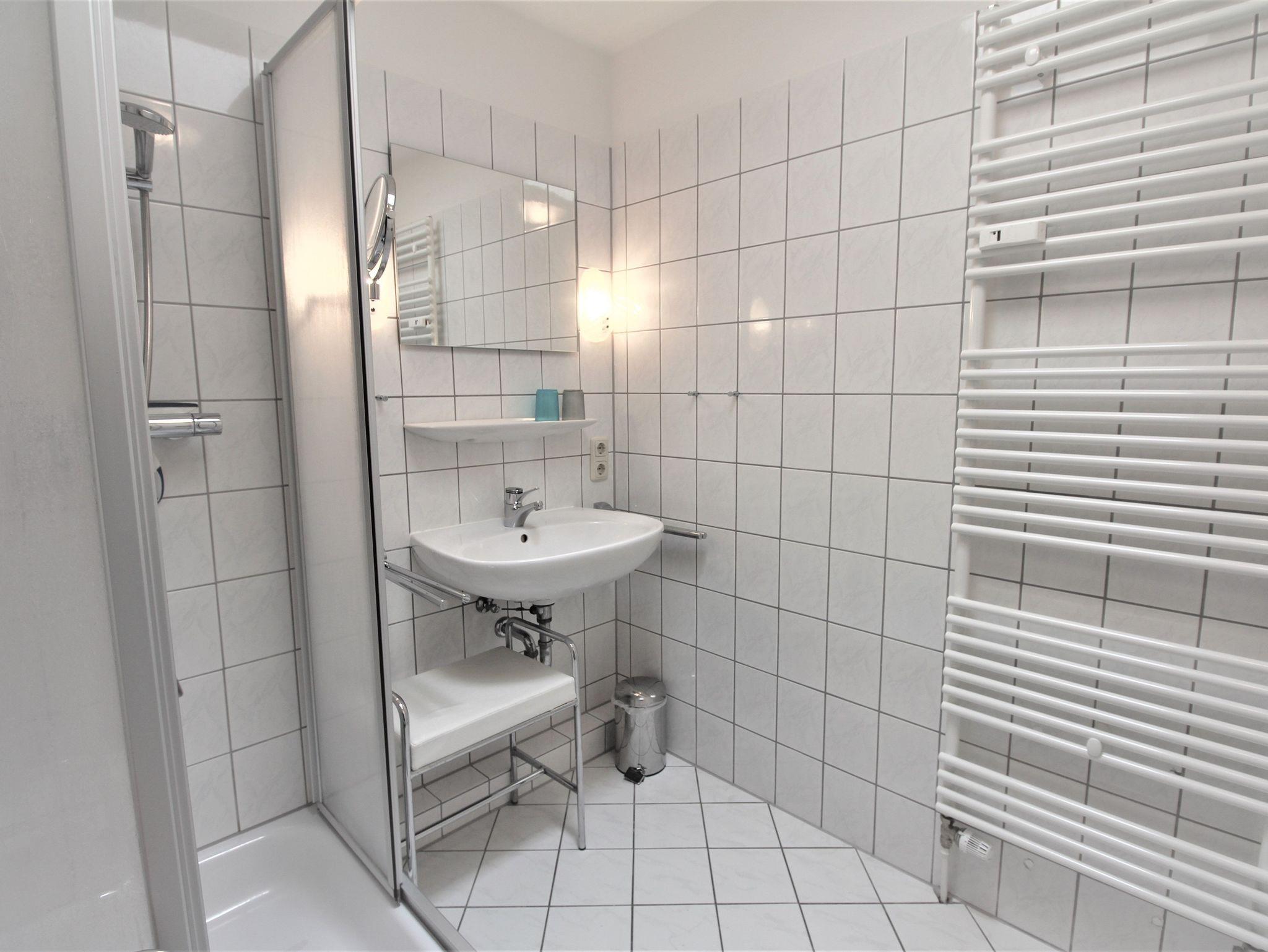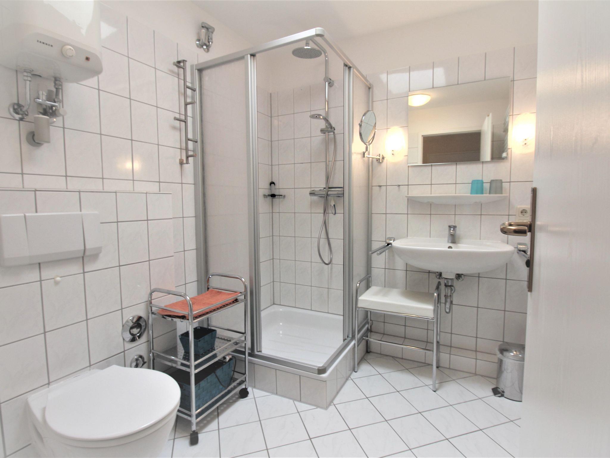 Das Duschbad hat, dank einer zu öffnenden Lichtkuppel, Tageslicht. Ein Kosmetikspiegel, ein Badhocker und ein Fön sind vorhanden.