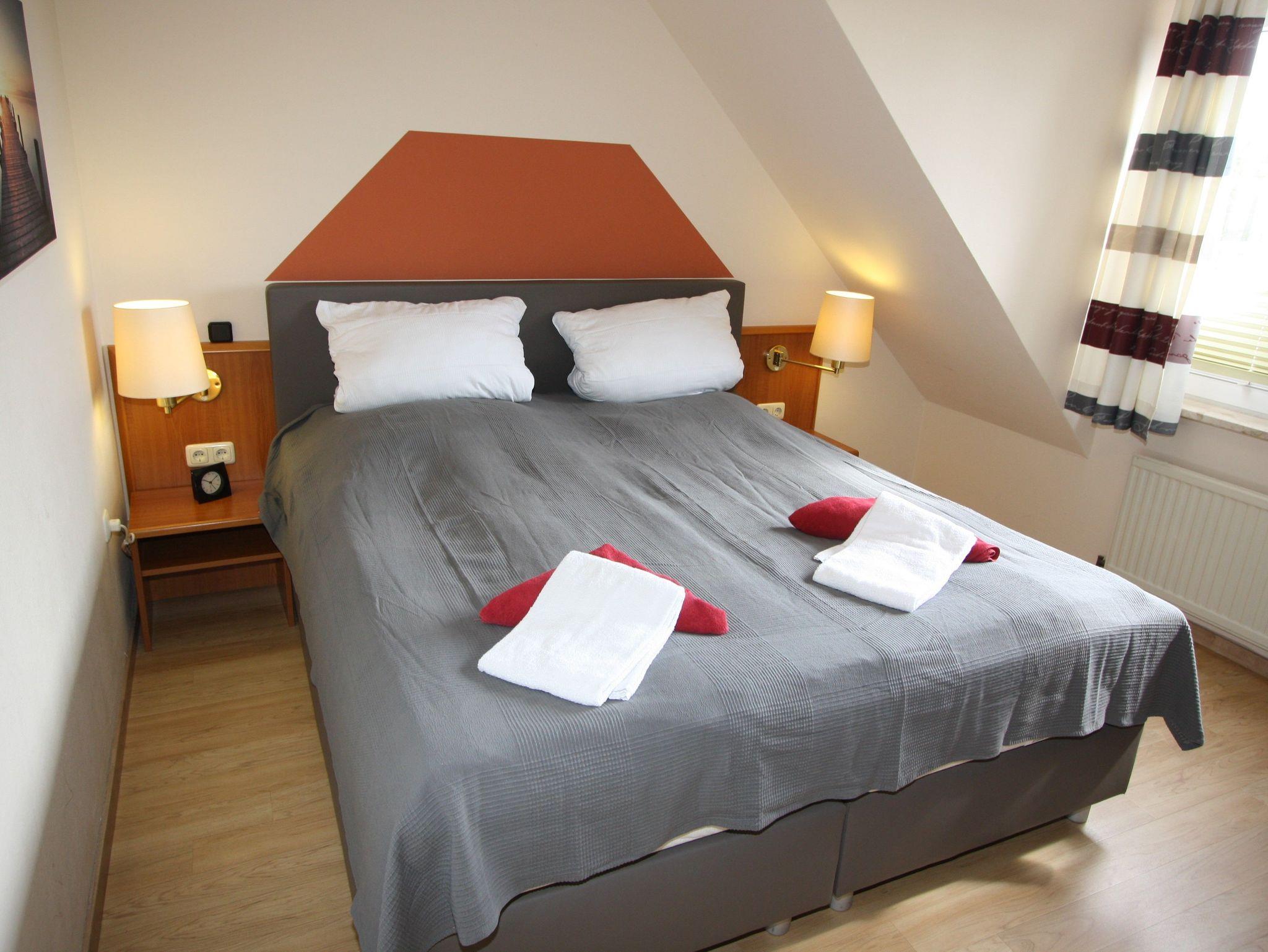 Im Schlafzimmer erwartet Sie ein 180 cm x 200 m großes Boxspringbett mit einer Komforthöhe von 55 cm (Bitte entsprechend große Laken mitbringen. Alternativ sind diese gegen Gebühr an der Rezeption ausleihbar). Vom Bett aus fällt Ihr Blick auf den 2. Flachbildschirm. Eine kleine Sitzgelegenheit lädt zum Verweilen ein. In dem geräumigen Kleiderschrank findet Ihre Wäsche Platz. Auch der rechte Fensterflügel ist mit einem Fliegenschutzgitter ausgestattet.