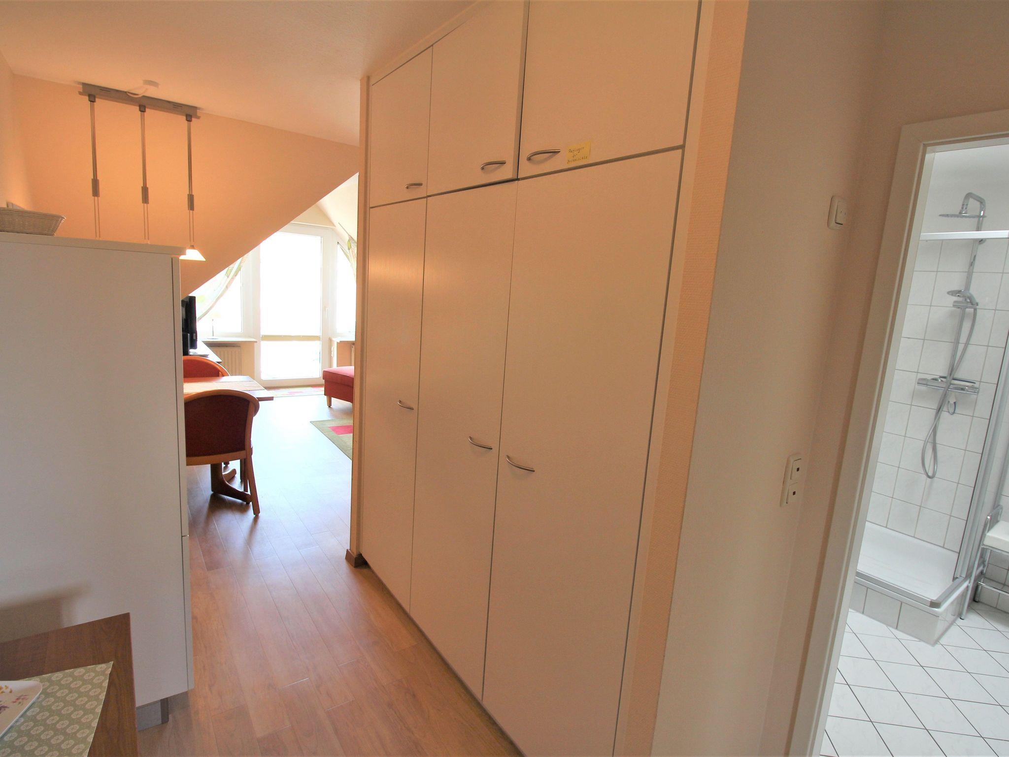 Neben dem Eingang zum Bad ist ein großer Wandschrank, in dem sich unter anderem ein Bügeleisen und ein Bügelbrett befinden.