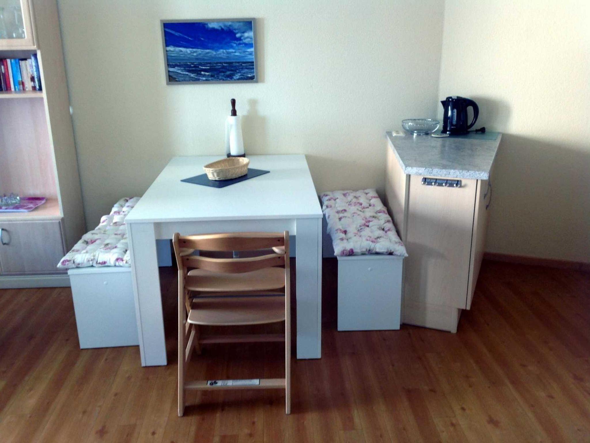 Schlafzimmer mit Doppelschrankbett, separater Essplatz, voll ausgestatteter Küchenbereich mit
