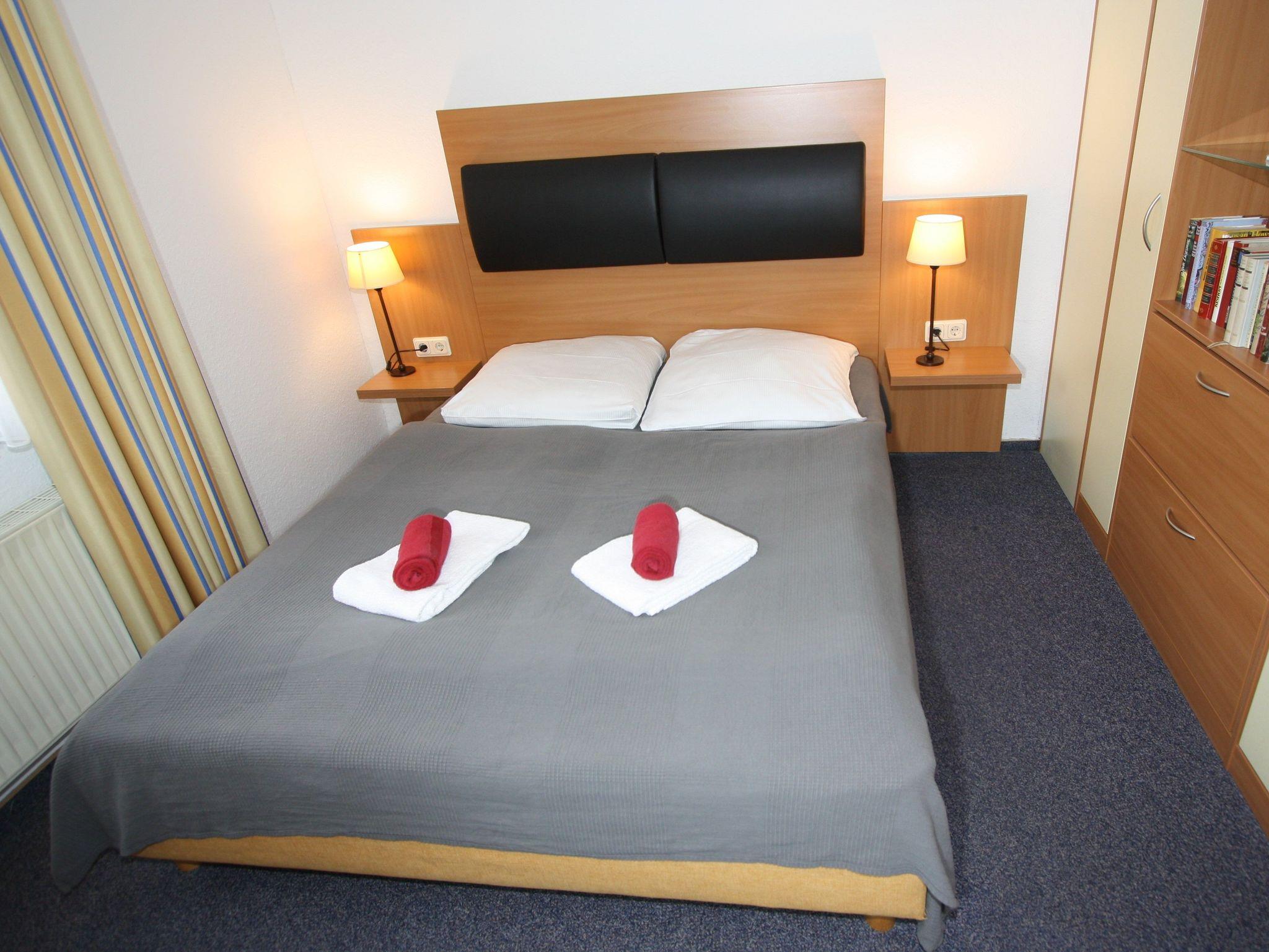 1-Zimmer-Appartement für 1-2 Personen auf ca. 35 m². Wohn-Schlafraum mit Doppelbett und Couch, TV, separatem Essplatz, Küchenbereich, Balkon oder Terrasse, Bad mit Dusche/WC. PKW-Stellplatz vorhanden.
